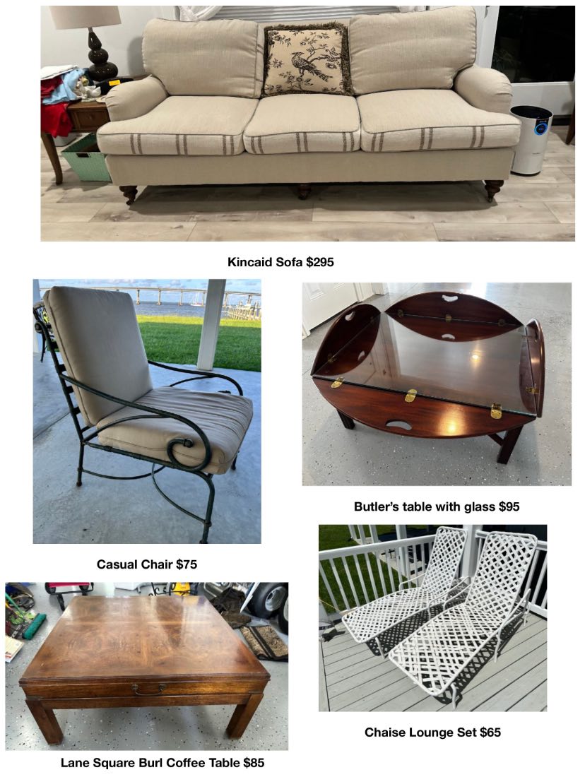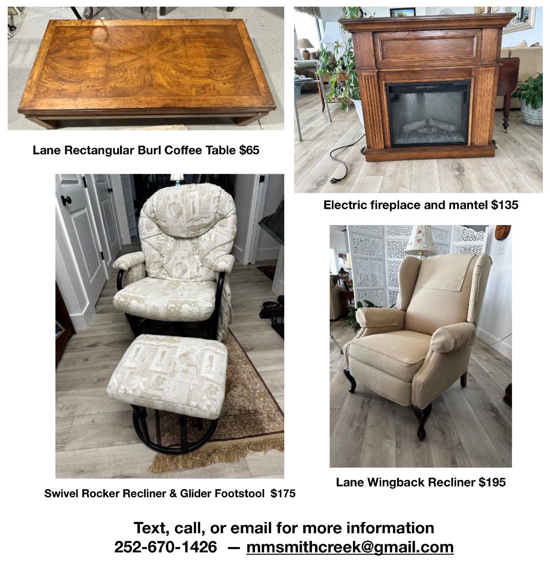 Round outdoor table w/4 chairs $50 Chase lounge$30 Large round mirror $350 Please call to see items, 252-838-2221. Thank you. |