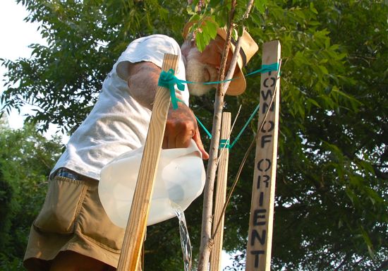 His departure from tree work was short lived. Within days of arriving, a neighbor asked him if he would join Oriental’s Tree Board. Which he did. This year, he and the organization planted almost 100 trees. Trouble is, 2011 has been very hot, a tough year for young trees. “The first year, it’s critical to water them until their roots can grow into the surrounding soil” Bob says.