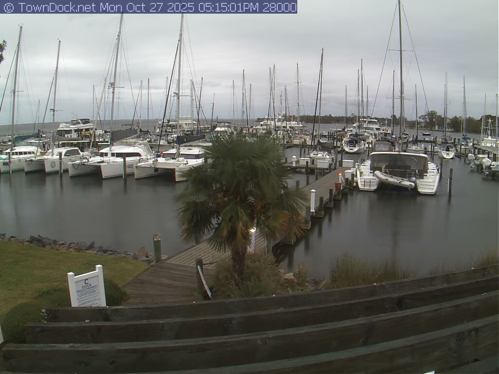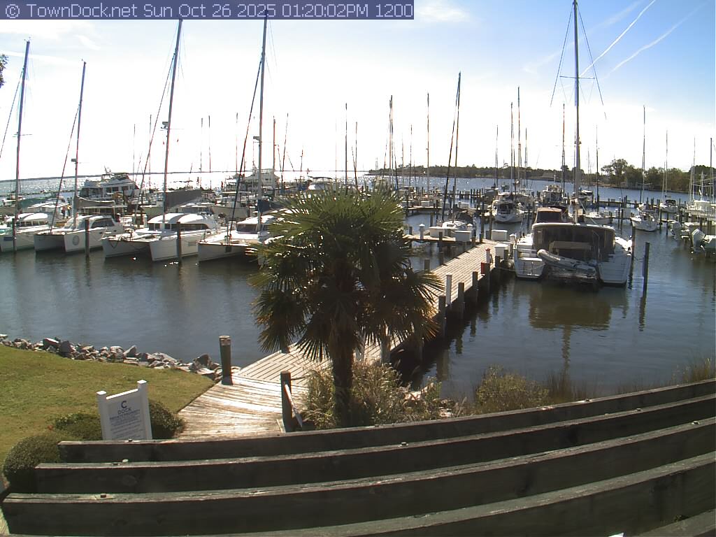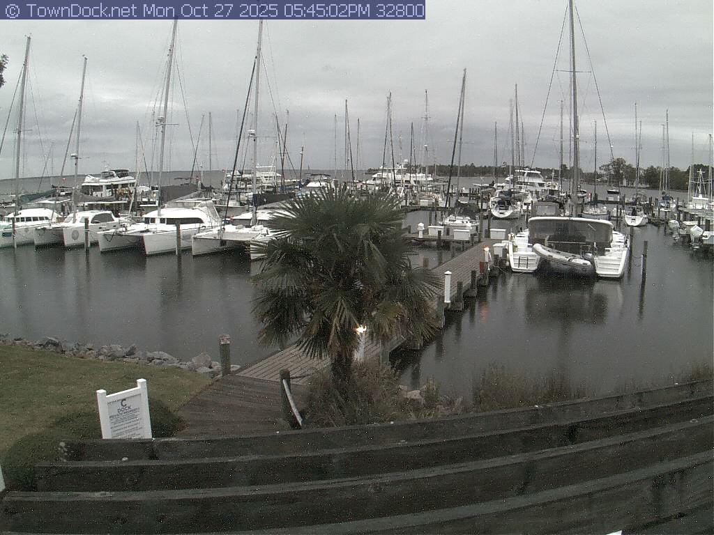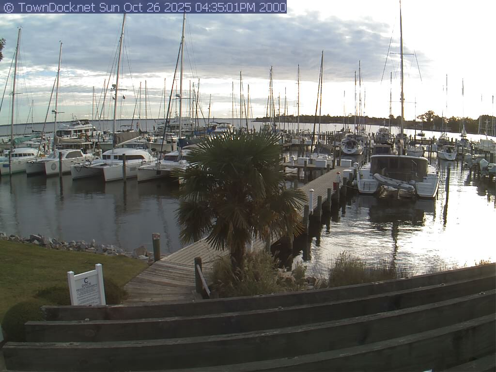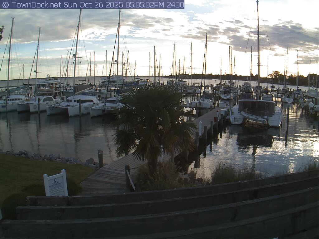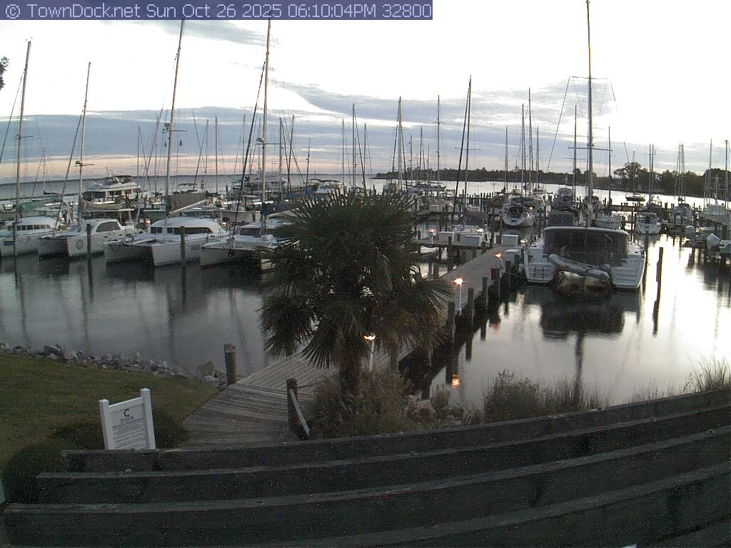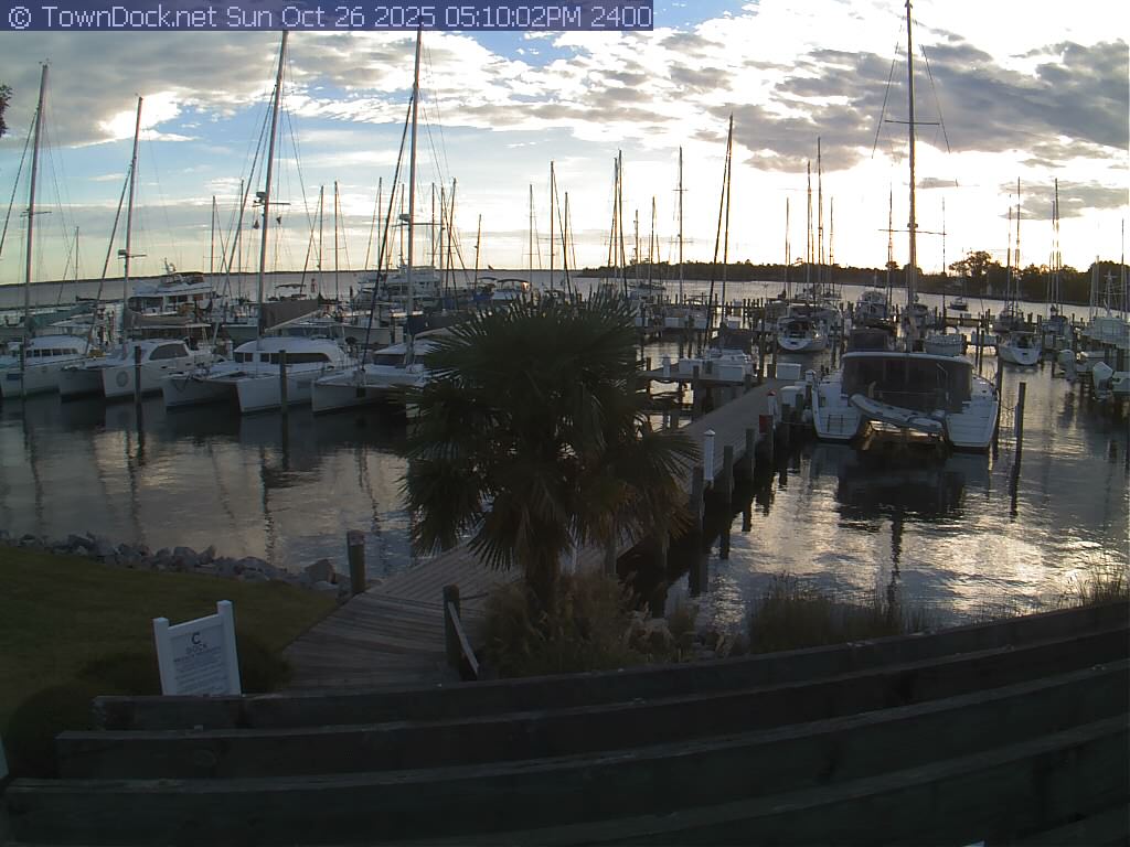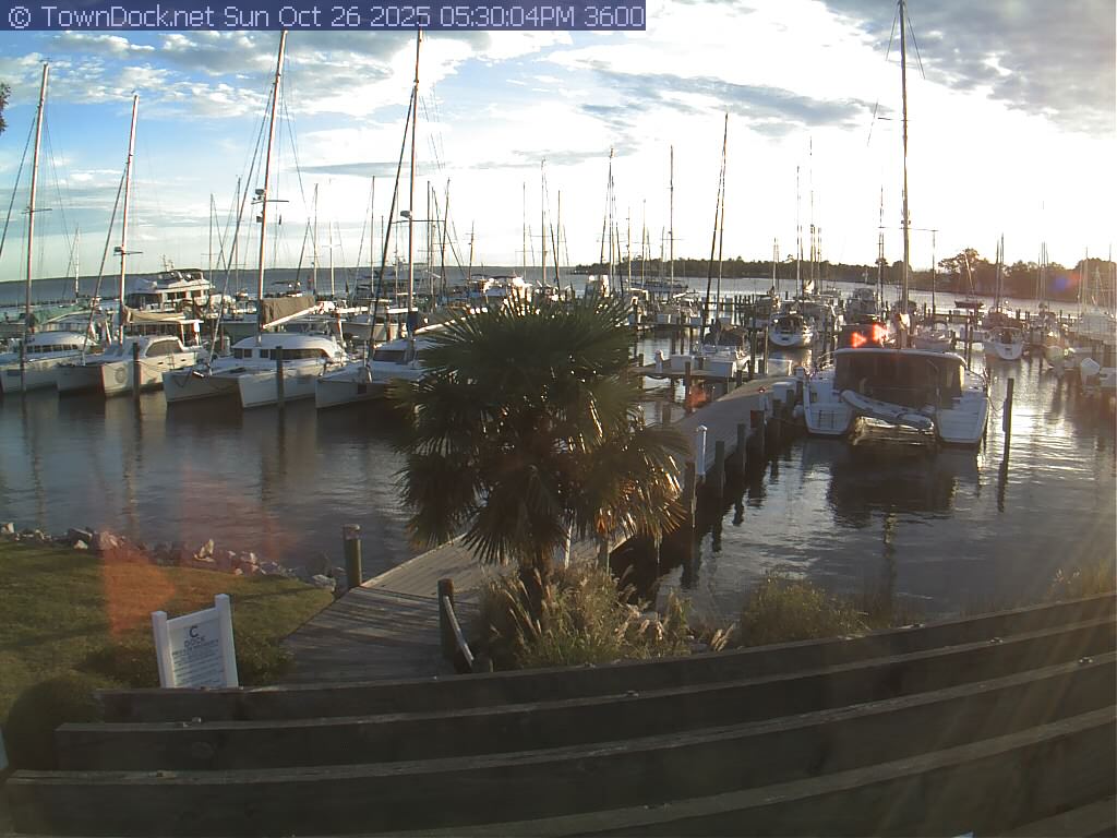 shows Oriental Harbor Village Marina, with the Oriental anchorage & Neuse River in the background. OHVM Cam takes a new picture every five minutes from dawn til just before dusk. Click on the image to see a larger version. Once you see that larger version, you can click (see arrow at right) to go back in time and see recent photos. Harbor Cam currently takes photos from 6:30am to 6:40pm.