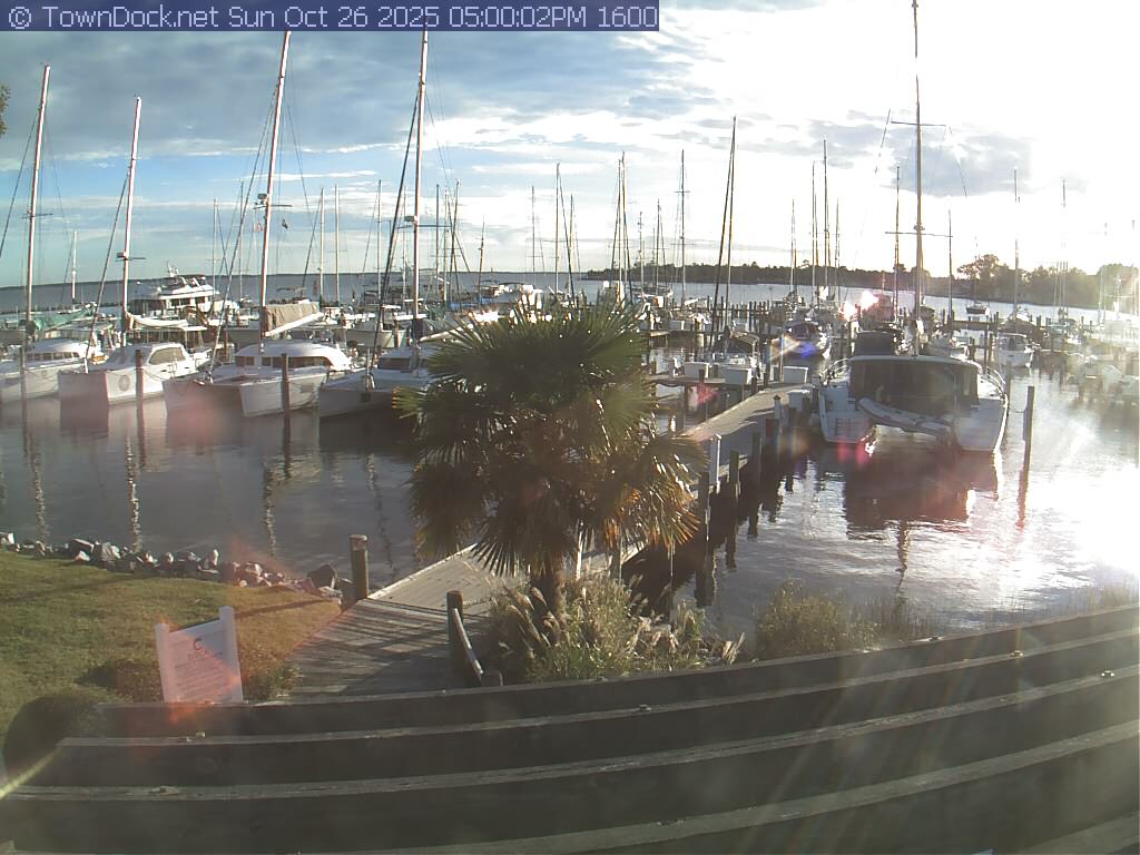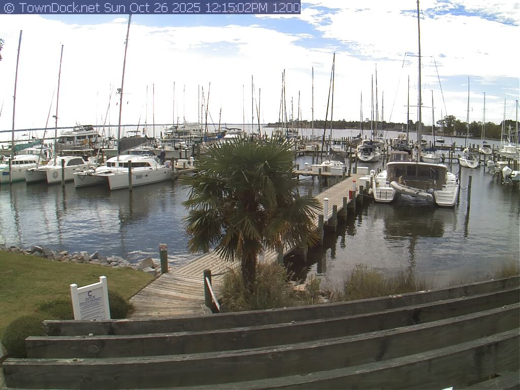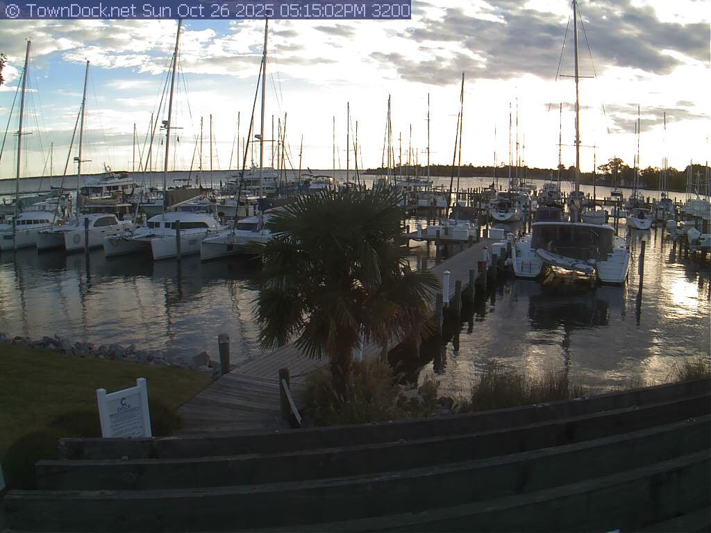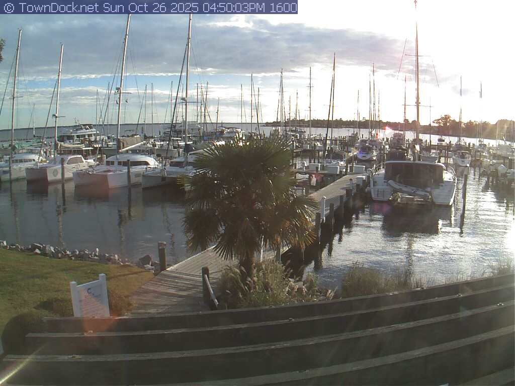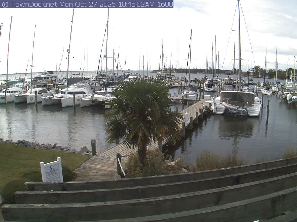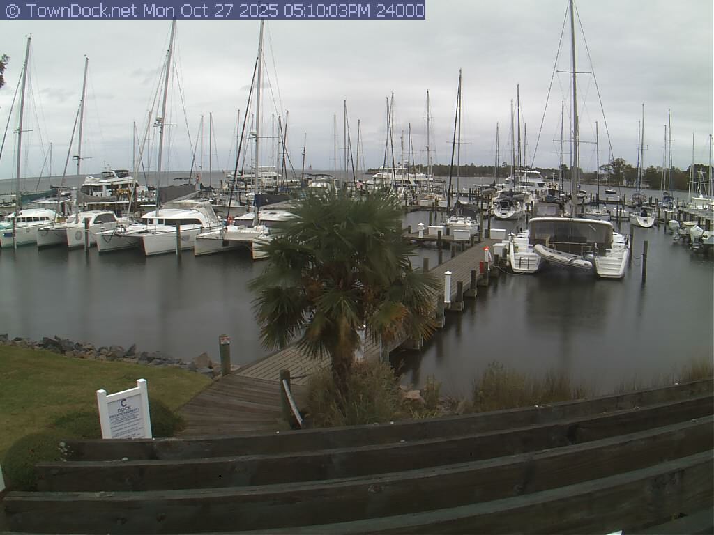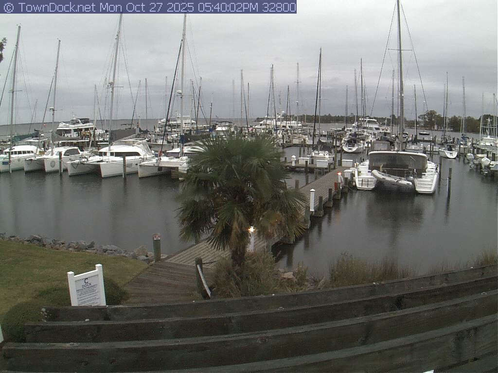 shows Oriental Harbor Village Marina, with the Oriental anchorage & Neuse River in the background. OHVM Cam takes a new picture every five minutes from dawn til just before dusk. Click on the image to see a larger version. Once you see that larger version, you can click (see arrow at right) to go back in time and see recent photos. Harbor Cam currently takes photos from 6:30am to 6:40pm.