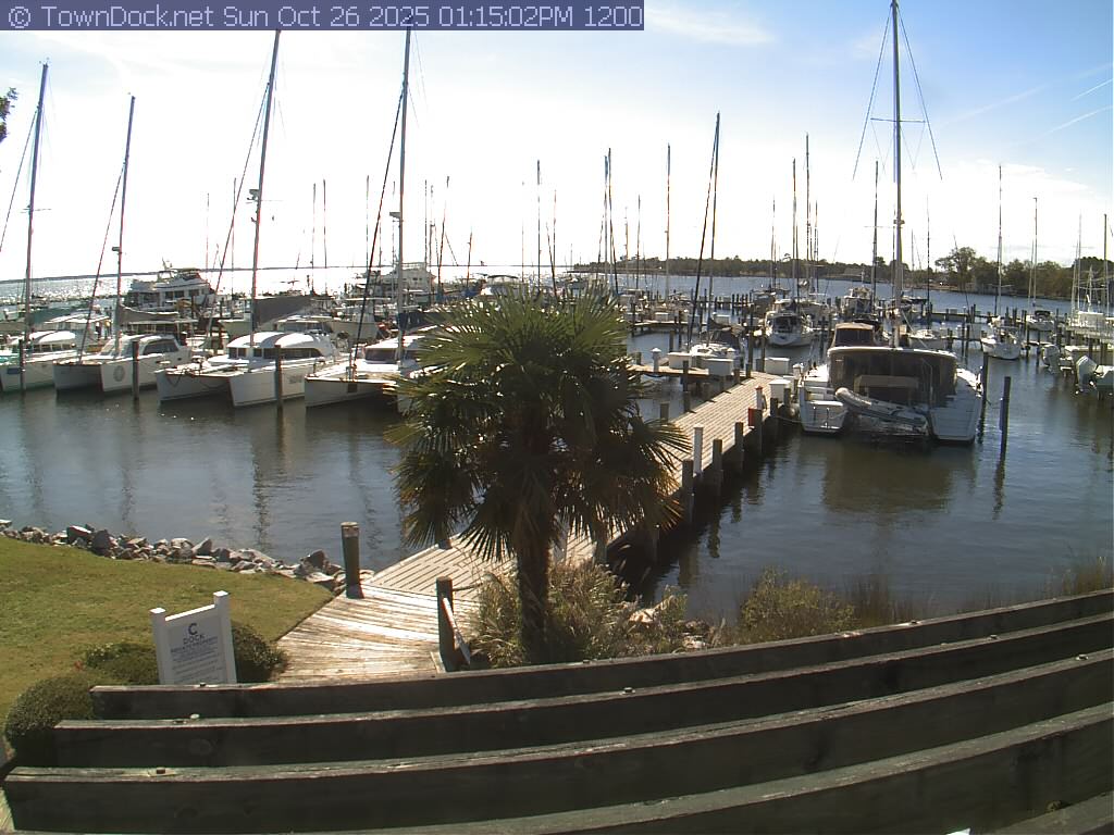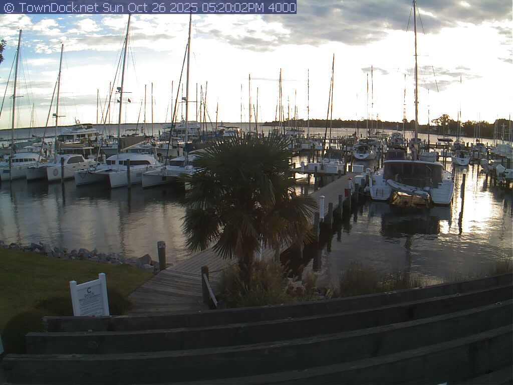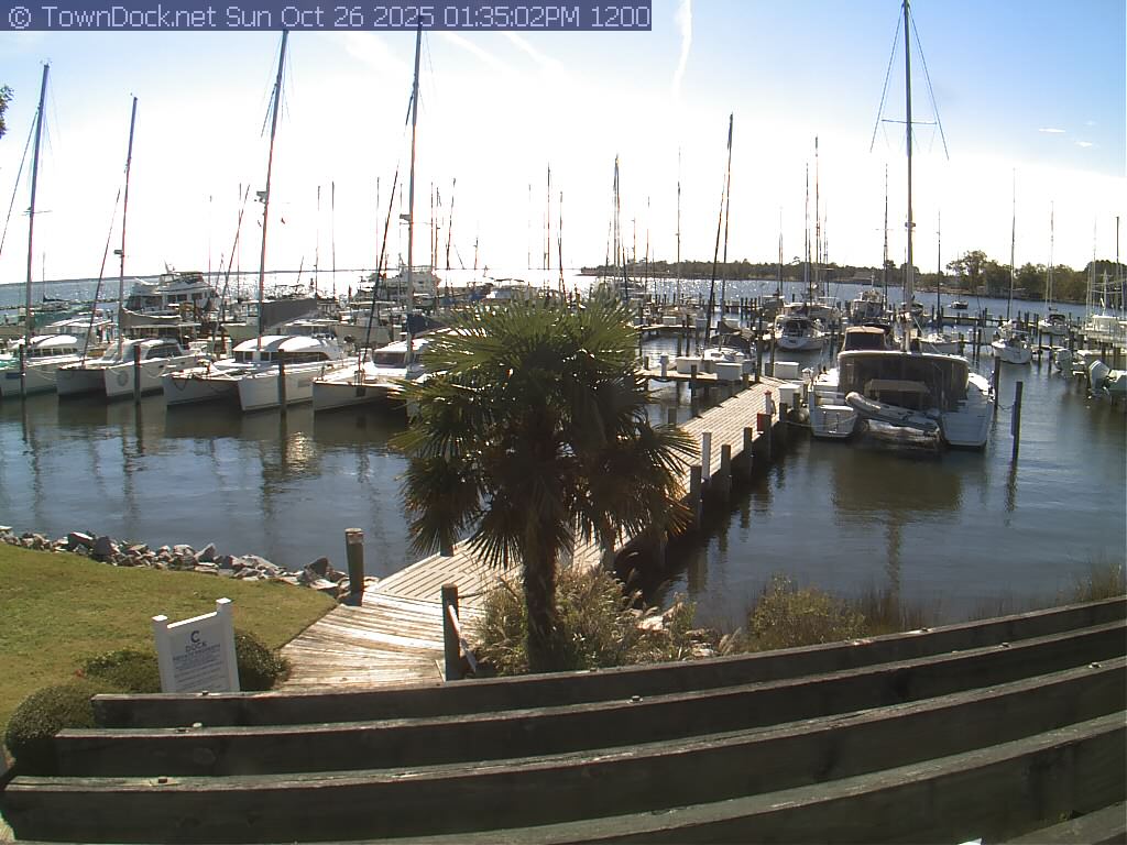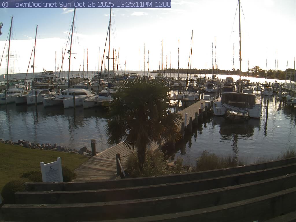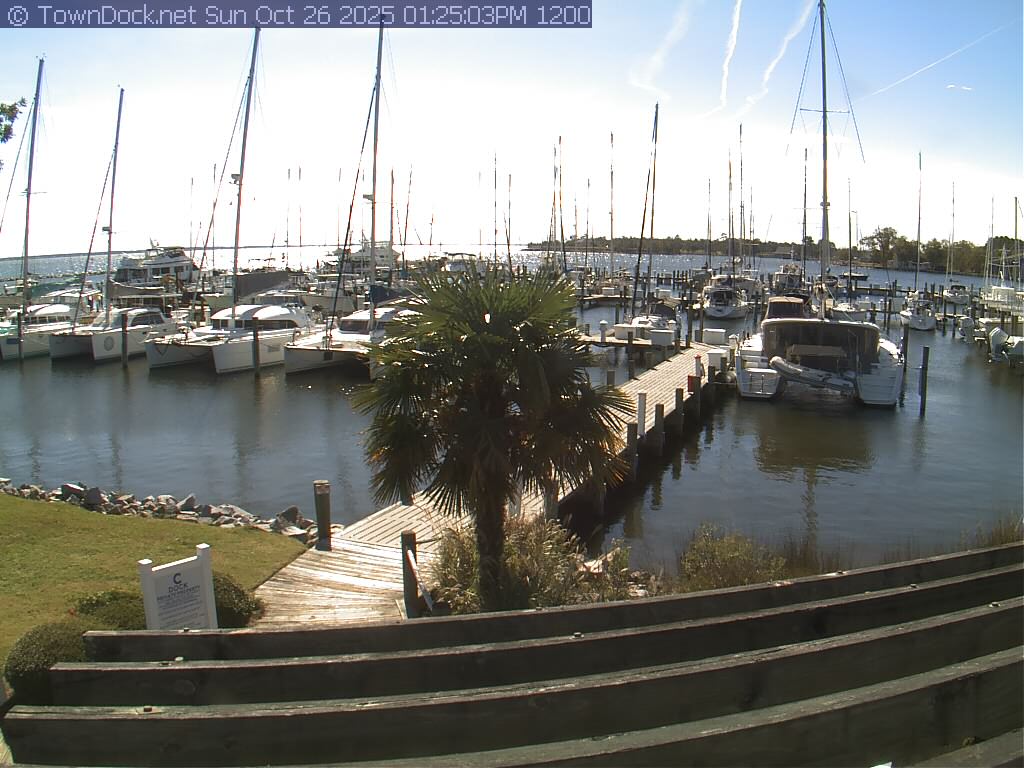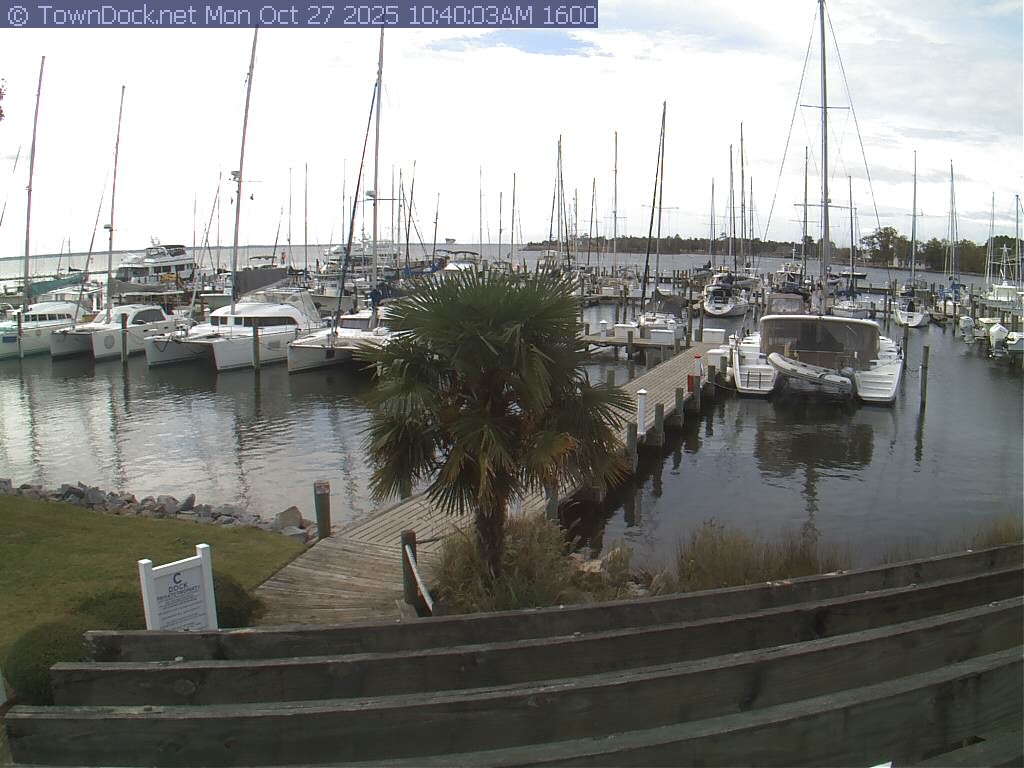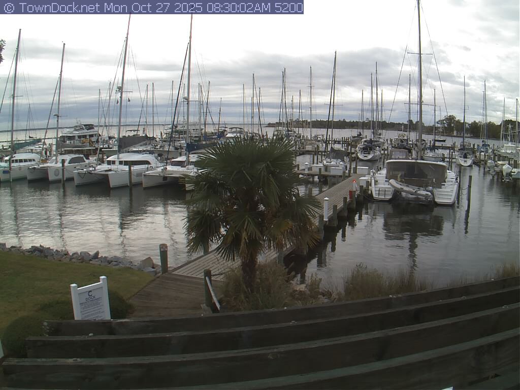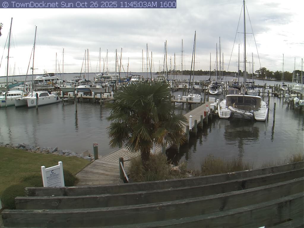 shows Oriental Harbor Village Marina, with the Oriental anchorage & Neuse River in the background. OHVM Cam takes a new picture every five minutes from dawn til just before dusk. Click on the image to see a larger version. Once you see that larger version, you can click (see arrow at right) to go back in time and see recent photos. Harbor Cam currently takes photos from 6:30am to 6:40pm.
