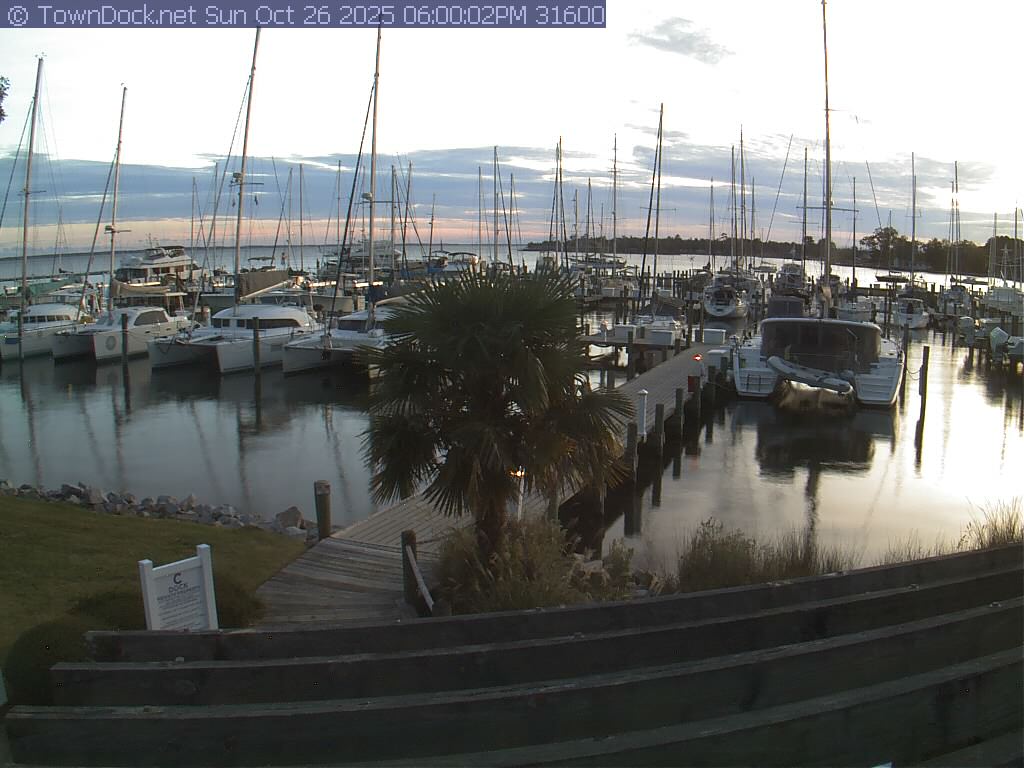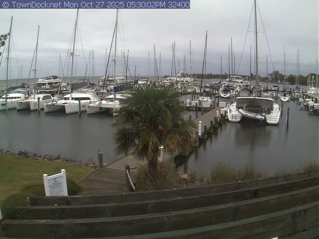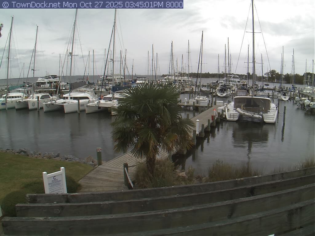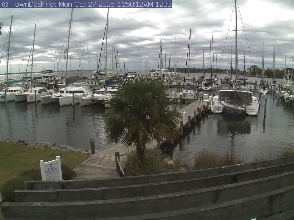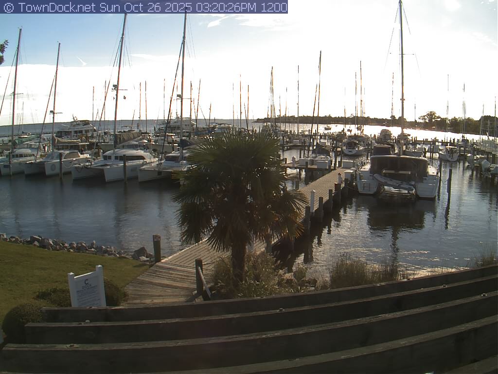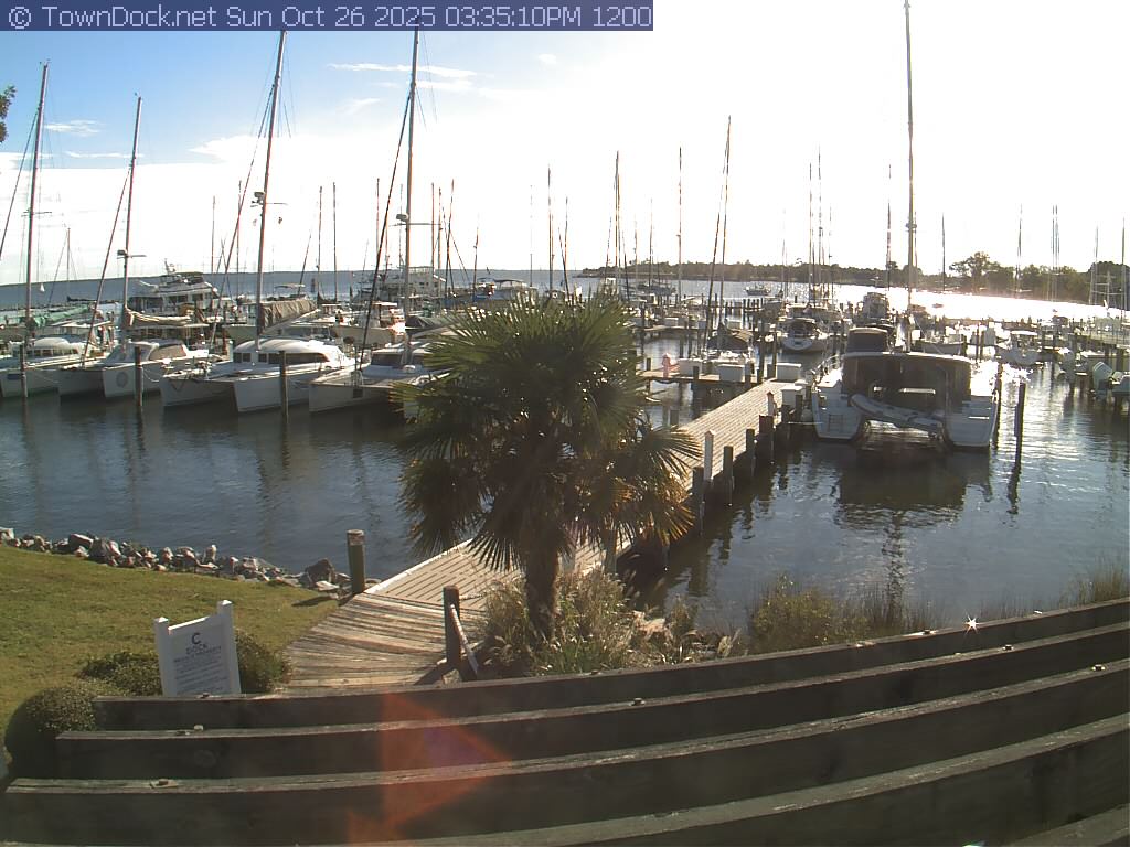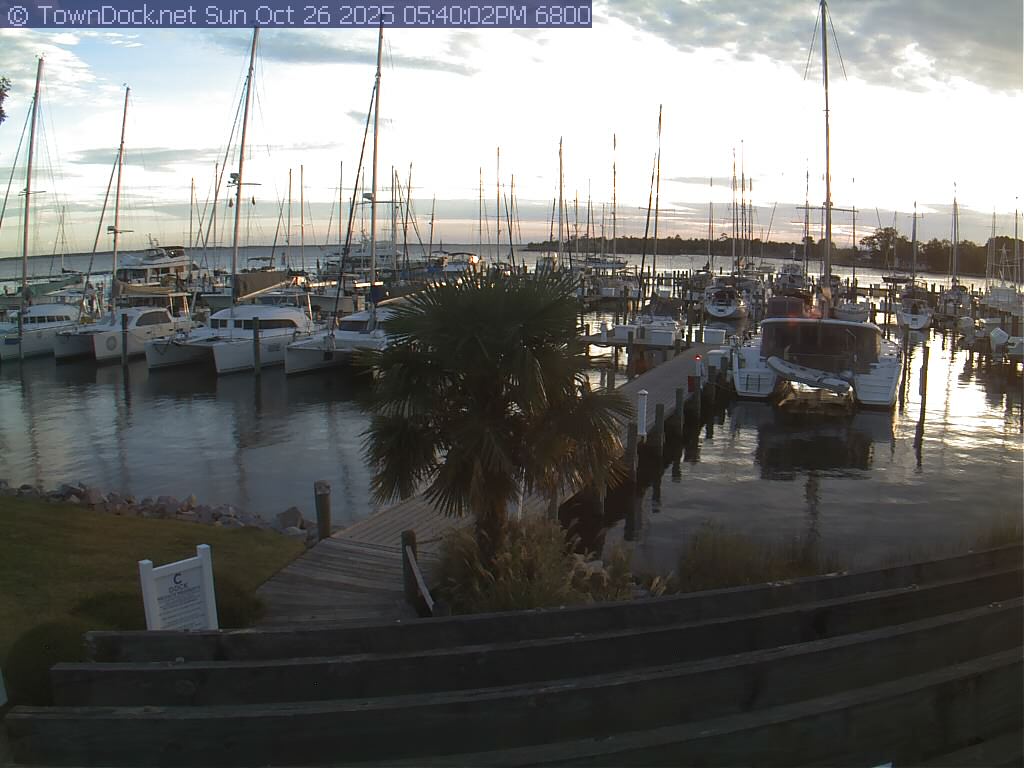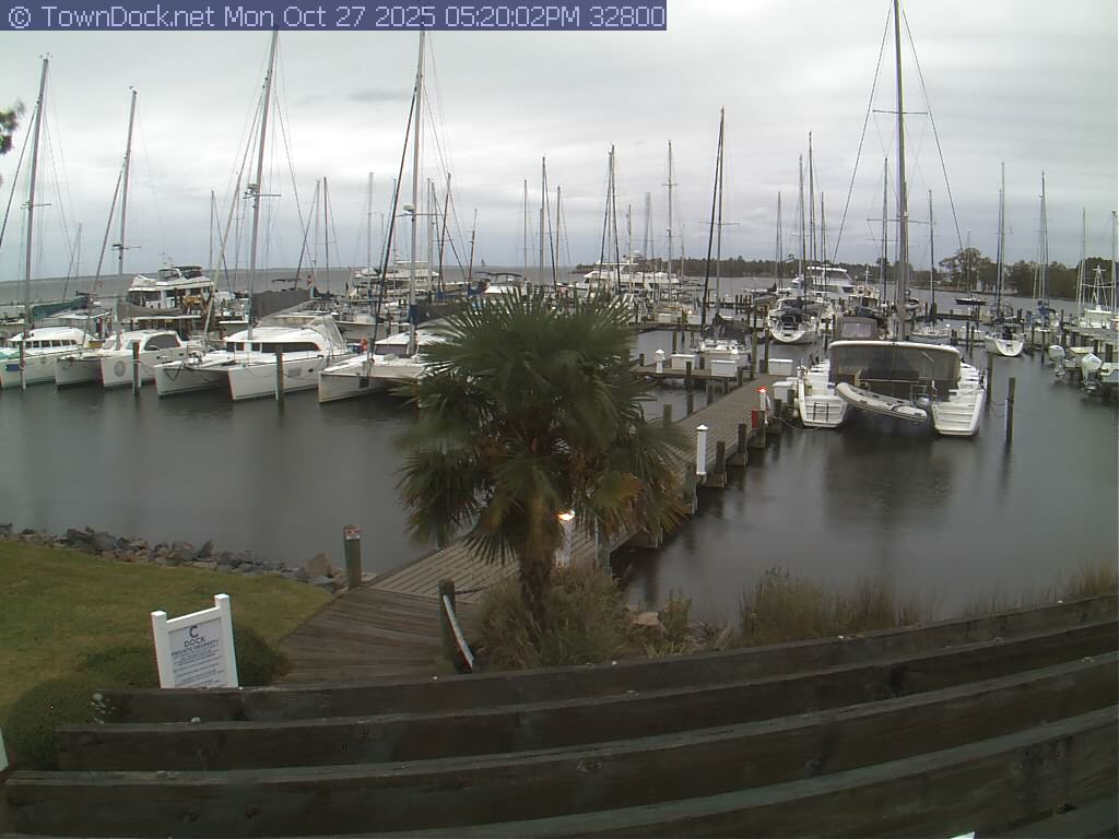 shows Oriental Harbor Village Marina, with the Oriental anchorage & Neuse River in the background. OHVM Cam takes a new picture every five minutes from dawn til just before dusk. Click on the image to see a larger version. Once you see that larger version, you can click (see arrow at right) to go back in time and see recent photos. Harbor Cam currently takes photos from 6:30am to 6:40pm.