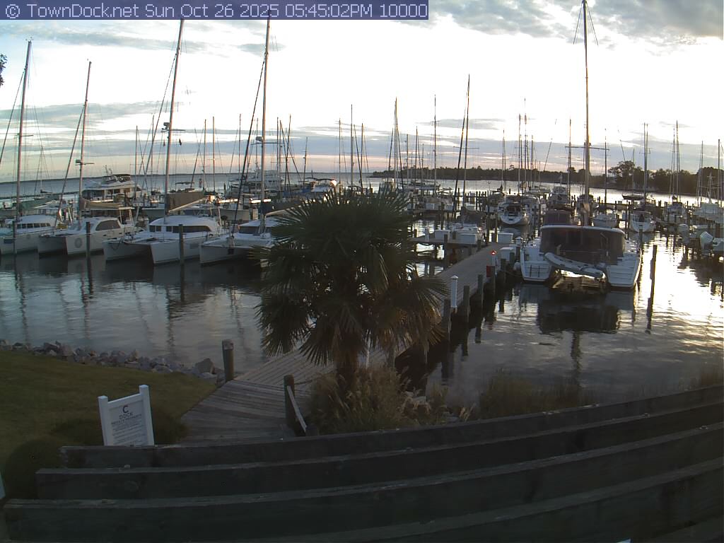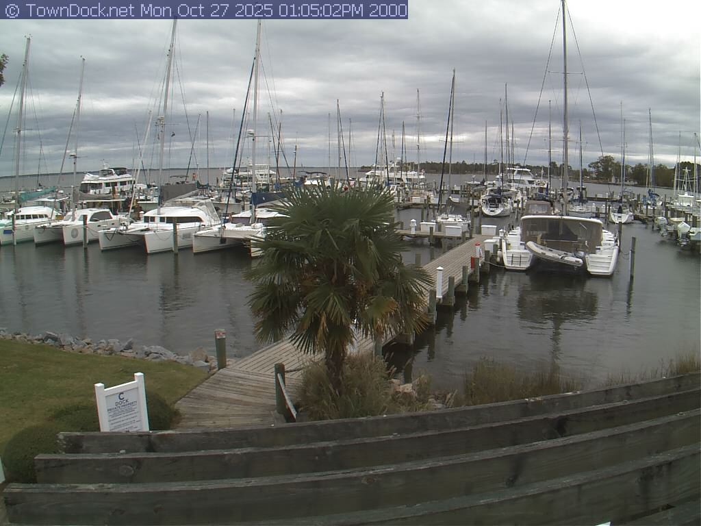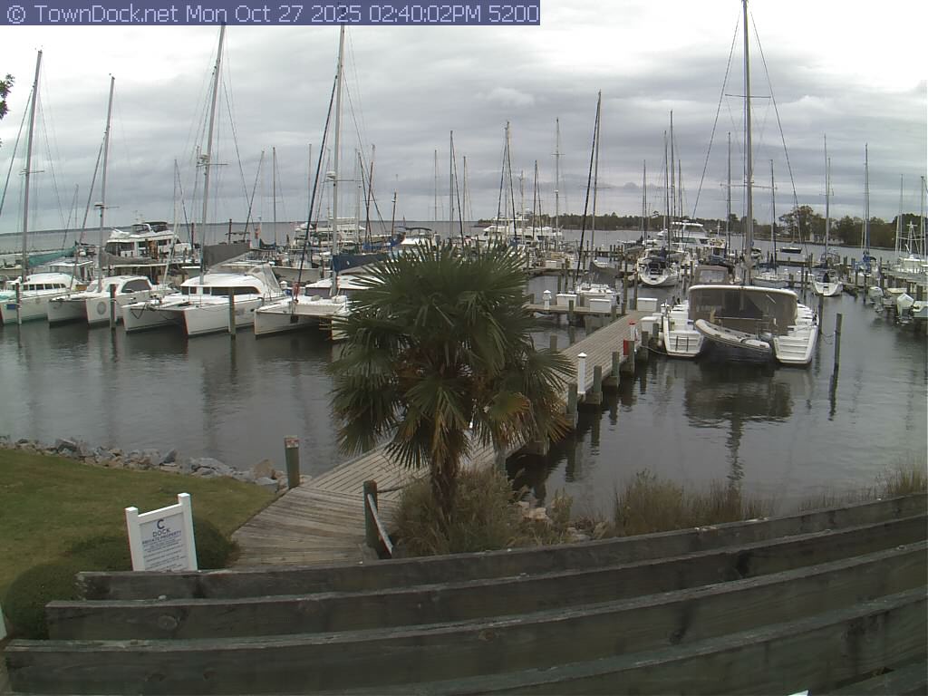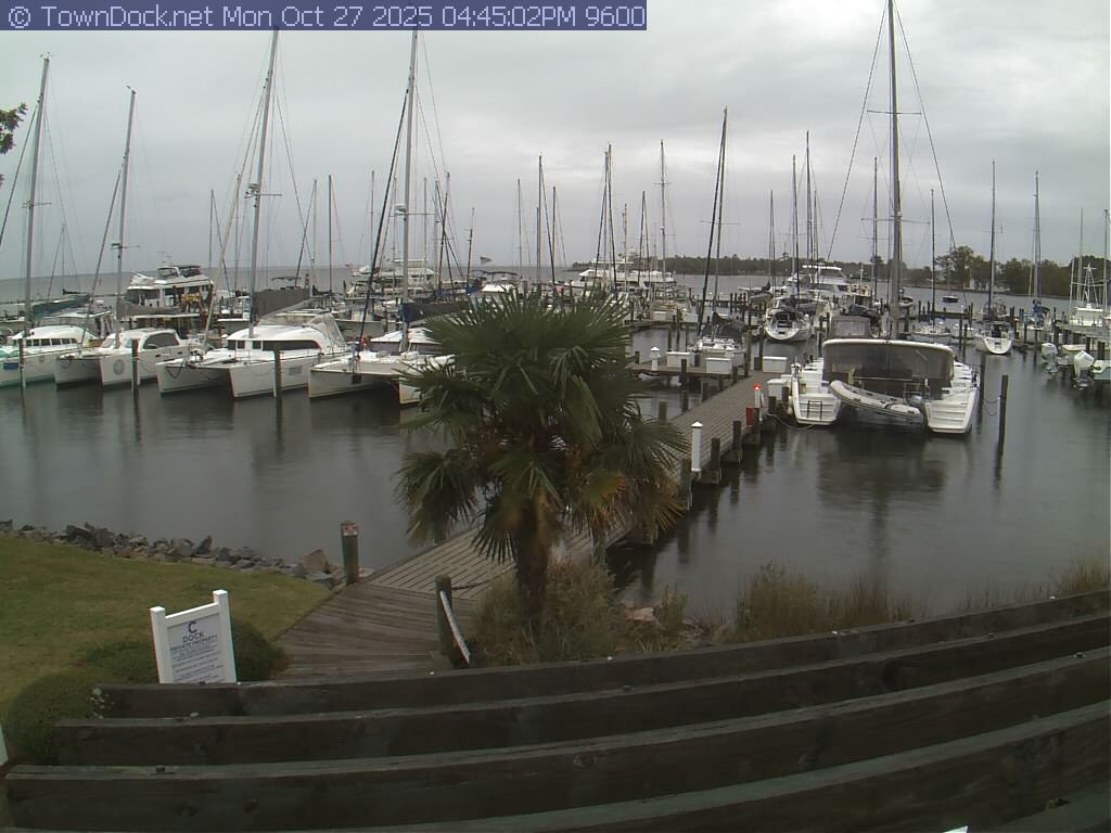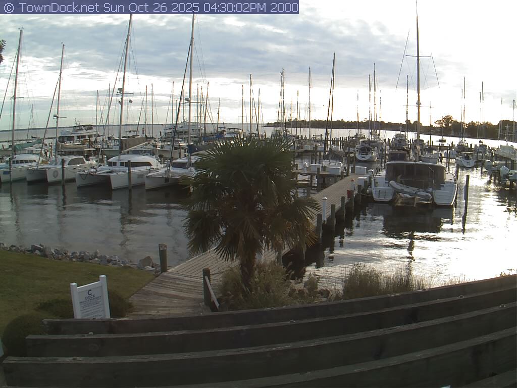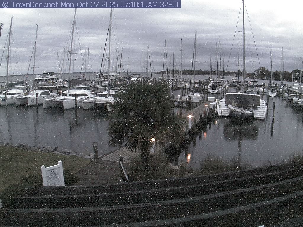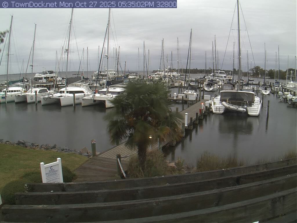 shows Oriental Harbor Village Marina, with the Oriental anchorage & Neuse River in the background. OHVM Cam takes a new picture every five minutes from dawn til just before dusk. Click on the image to see a larger version. Once you see that larger version, you can click (see arrow at right) to go back in time and see recent photos. Harbor Cam currently takes photos from 6:30am to 6:40pm.