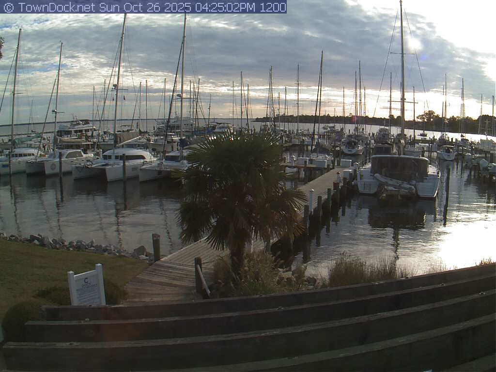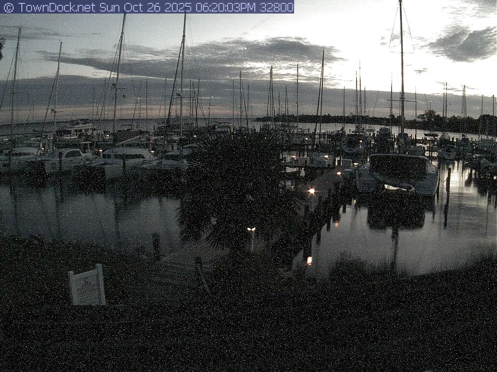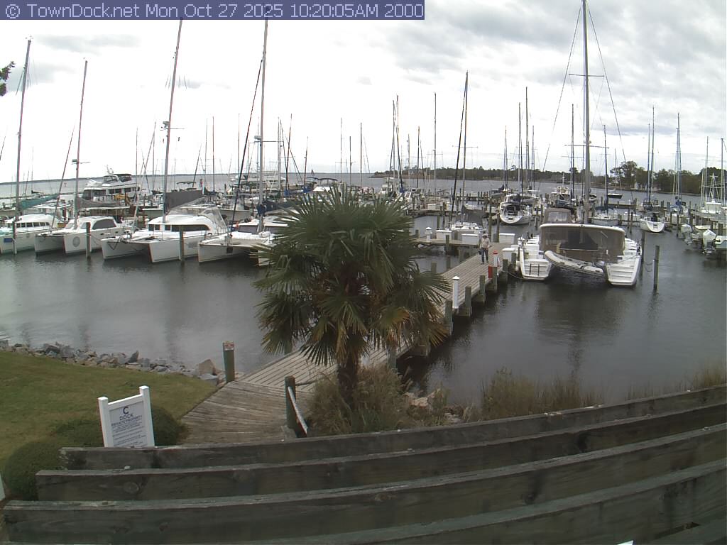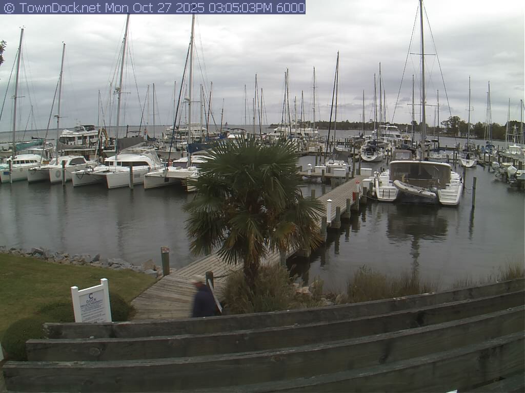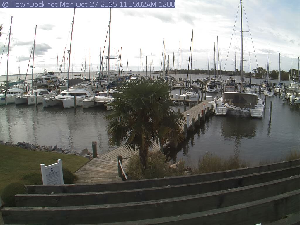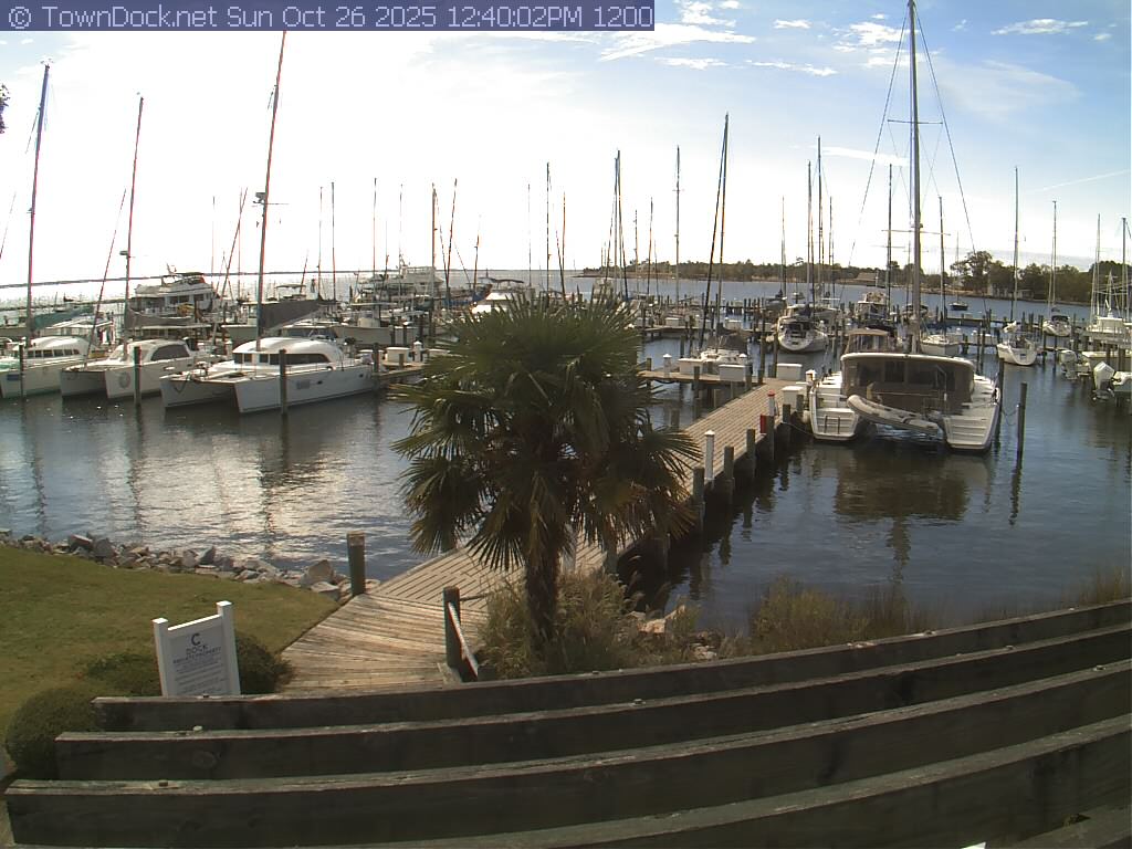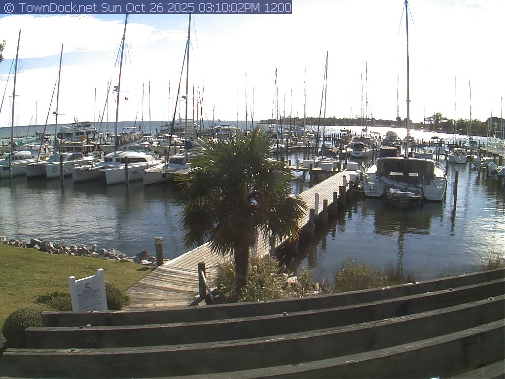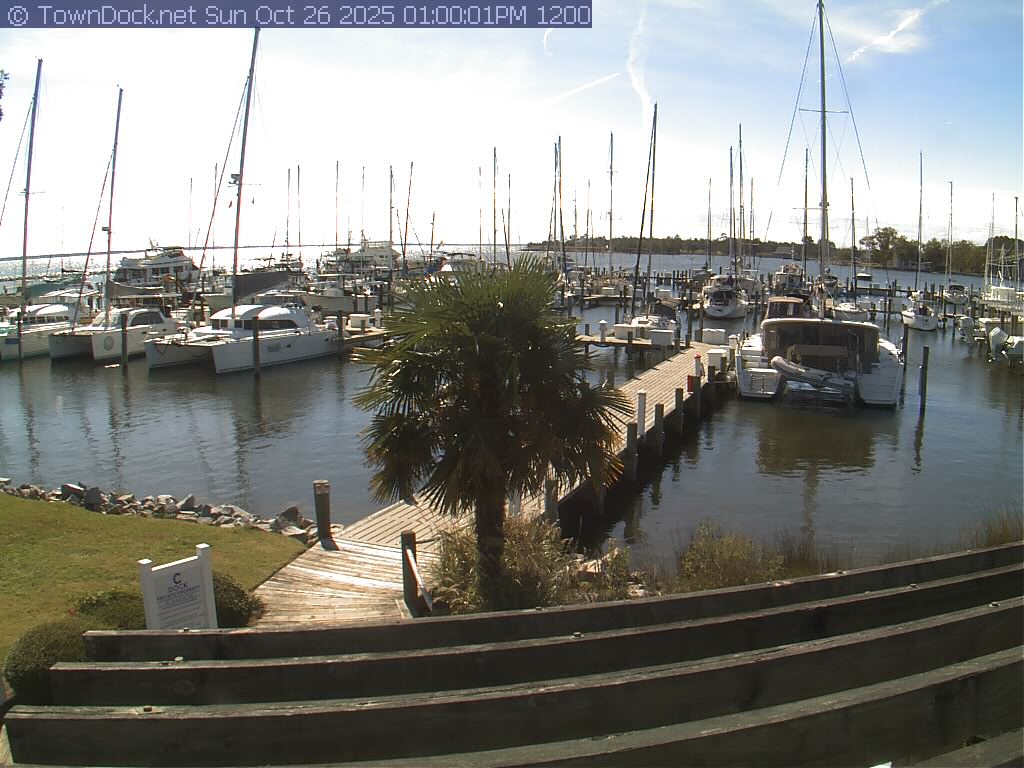 shows Oriental Harbor Village Marina, with the Oriental anchorage & Neuse River in the background. OHVM Cam takes a new picture every five minutes from dawn til just before dusk. Click on the image to see a larger version. Once you see that larger version, you can click (see arrow at right) to go back in time and see recent photos. Harbor Cam currently takes photos from 6:30am to 6:40pm.