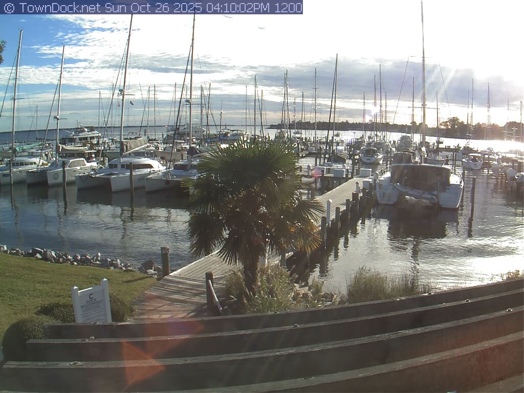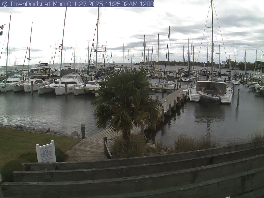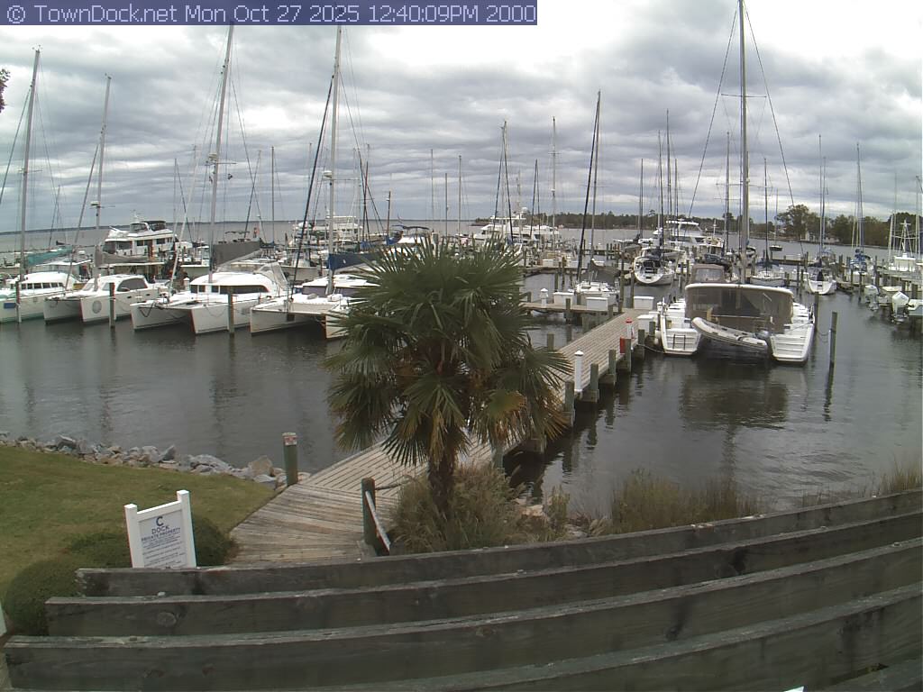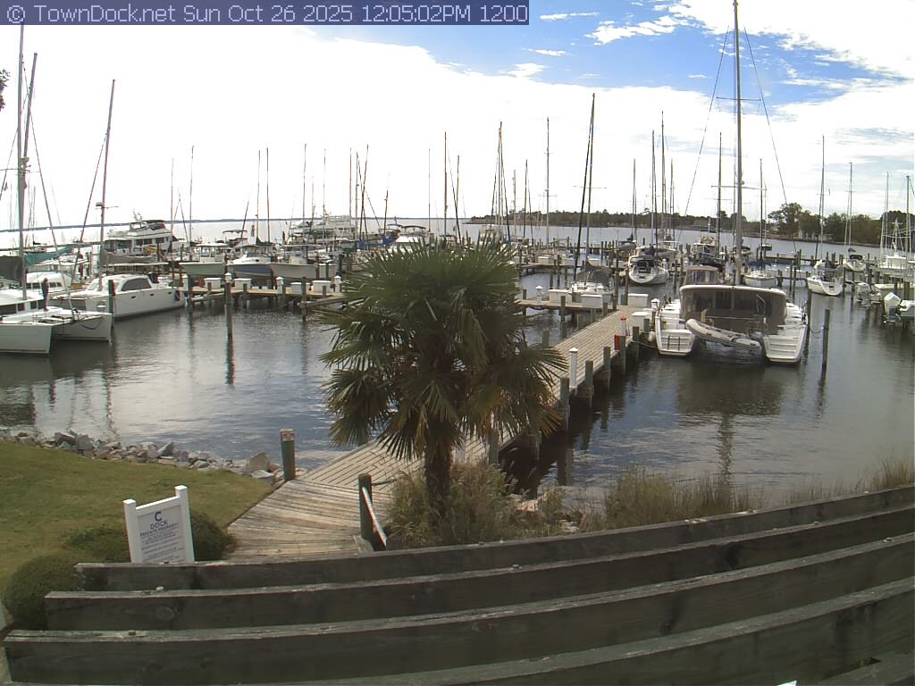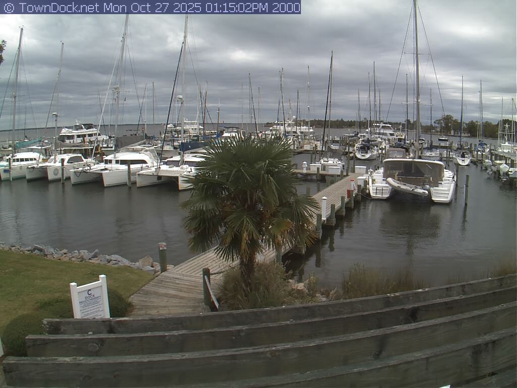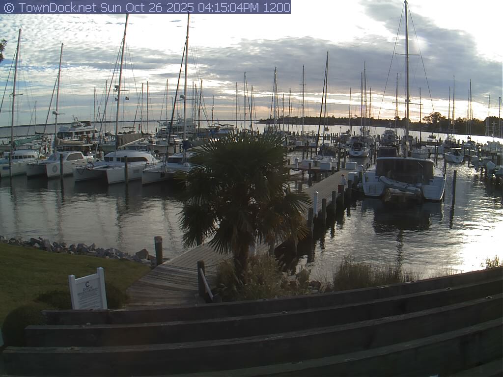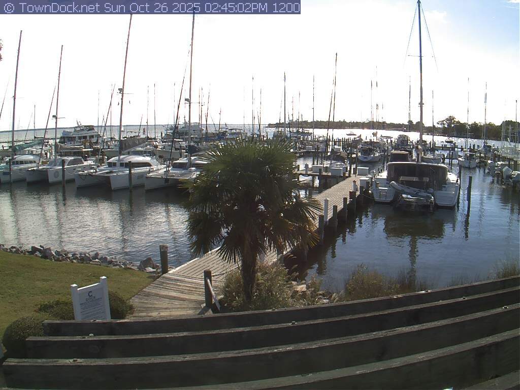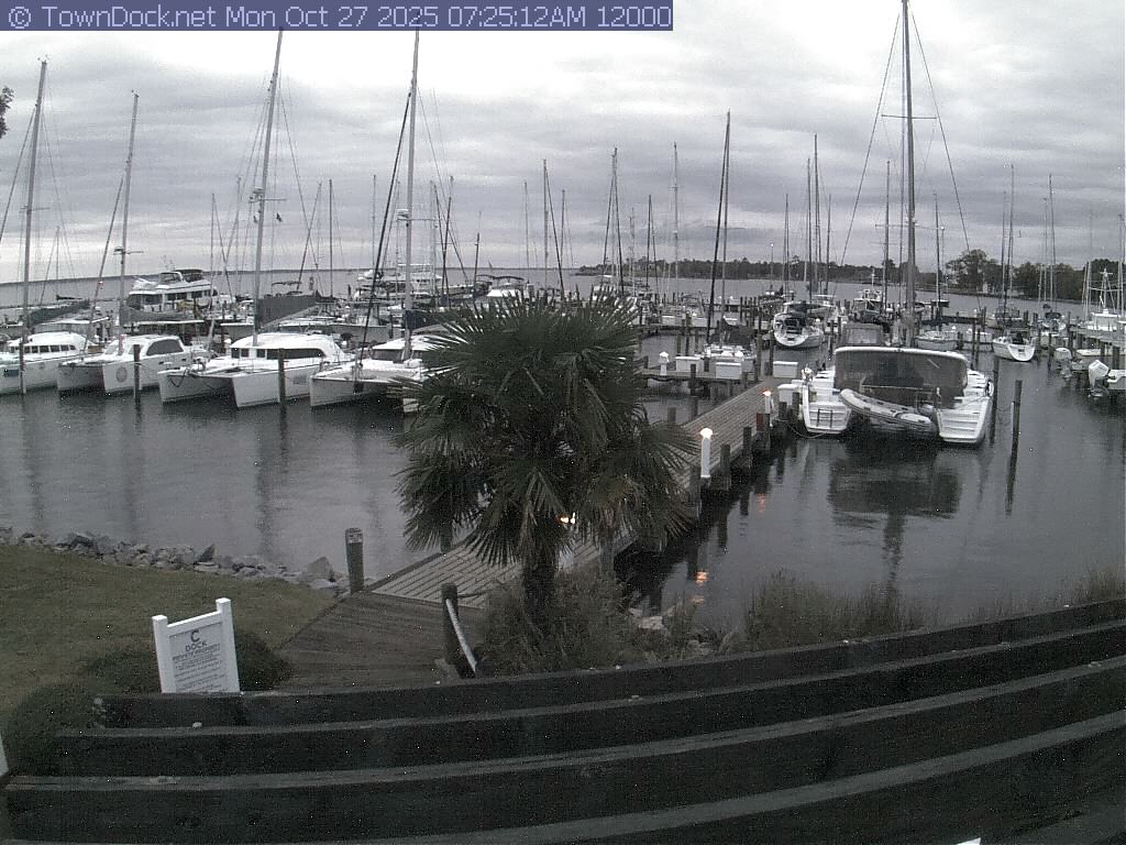 shows Oriental Harbor Village Marina, with the Oriental anchorage & Neuse River in the background. OHVM Cam takes a new picture every five minutes from dawn til just before dusk. Click on the image to see a larger version. Once you see that larger version, you can click (see arrow at right) to go back in time and see recent photos. Harbor Cam currently takes photos from 6:30am to 6:40pm.