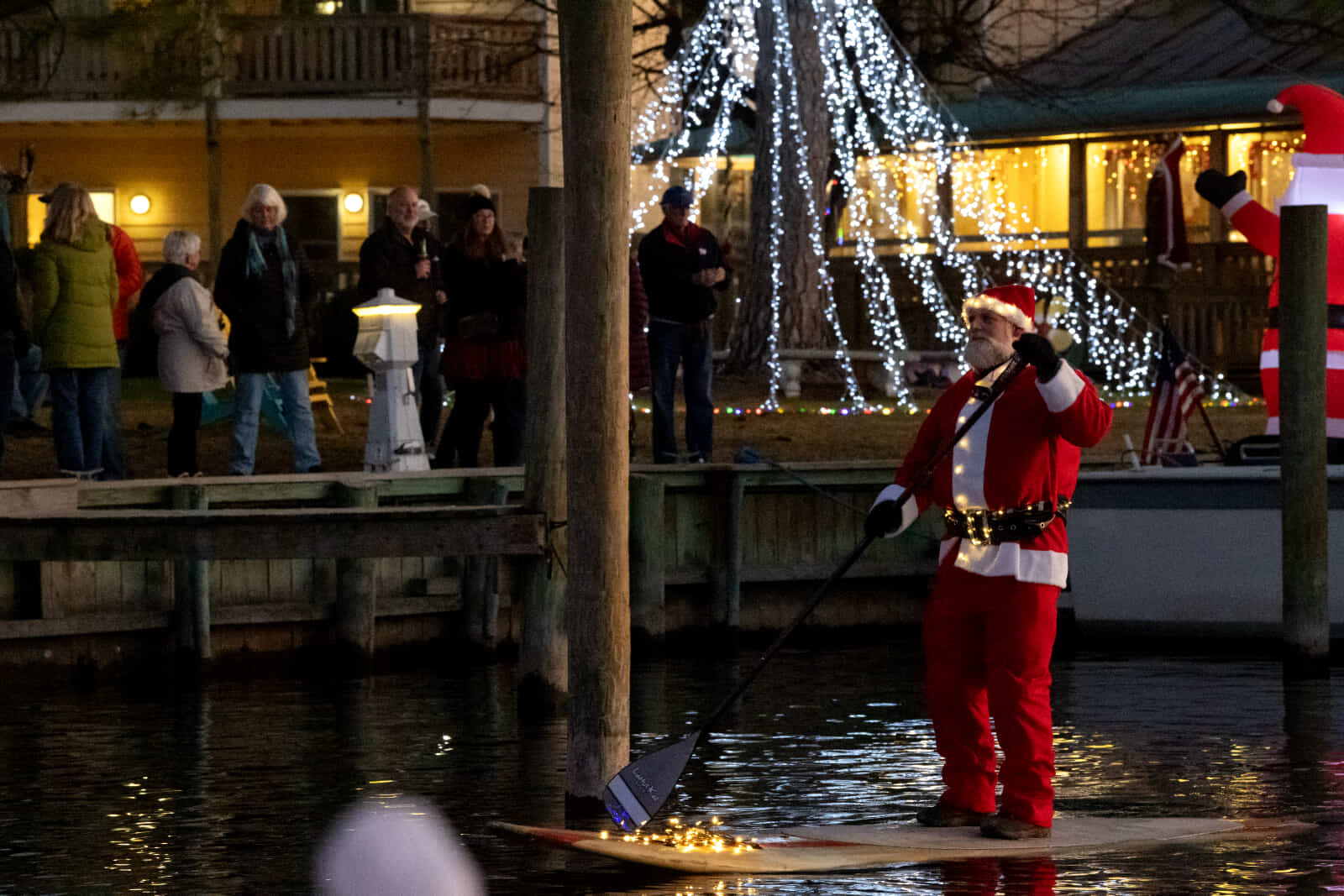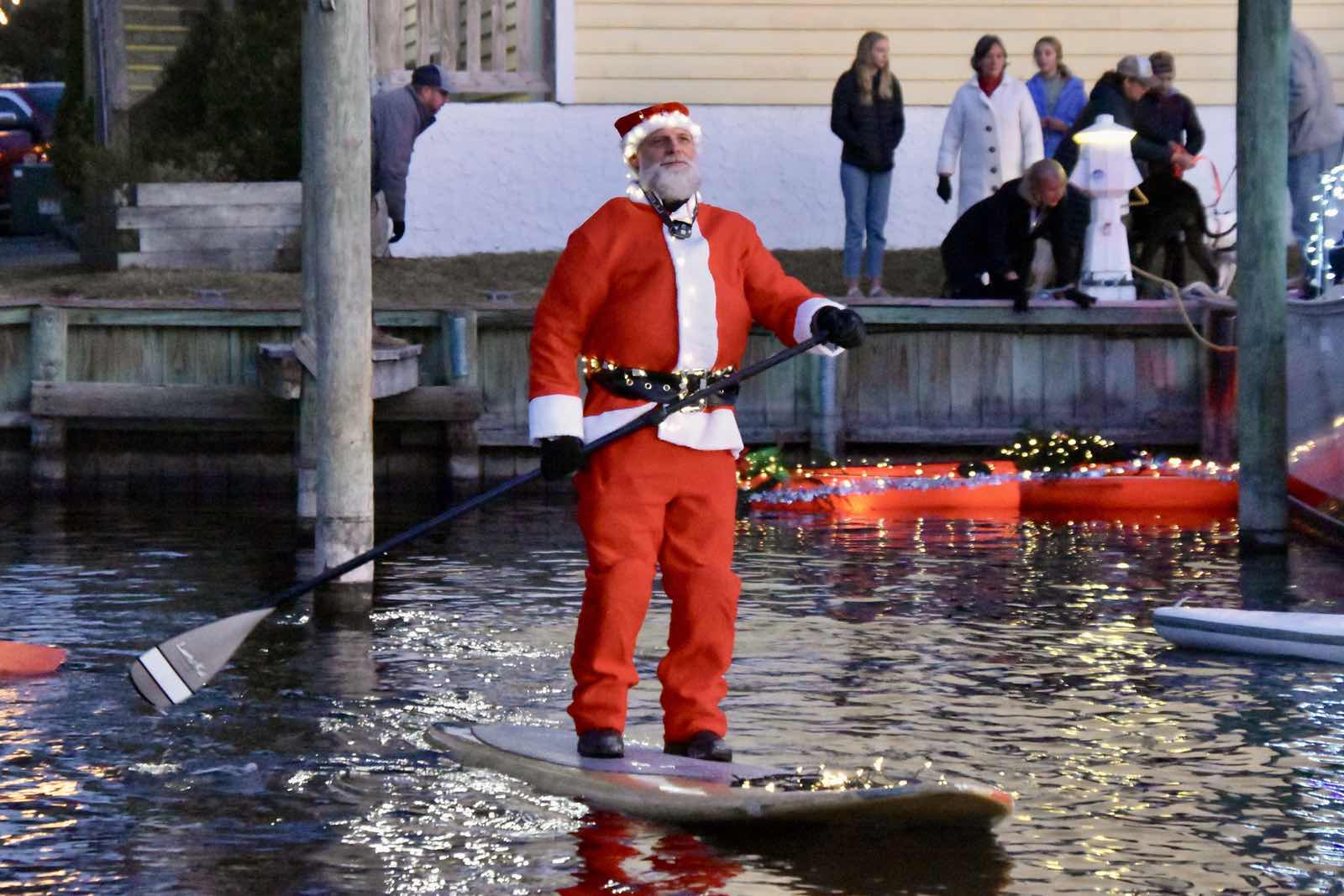 Santa came in on paddle board… part of the lighted flotilla during Spirit of Christmas. Click pic for more Santa. (Allison DeWeese photos)
