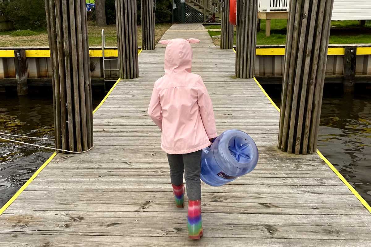 Eleanor carries an empty water jug to town.“To figure out where is the dysfunction we are living with onboard the boat. Where is the dysfunction we are living with as a family. And where is the line in the sand. How do you do the work on yourself and work on the boat, so you don’t pass on any of the traumas you’re carrying from generation to generation?”