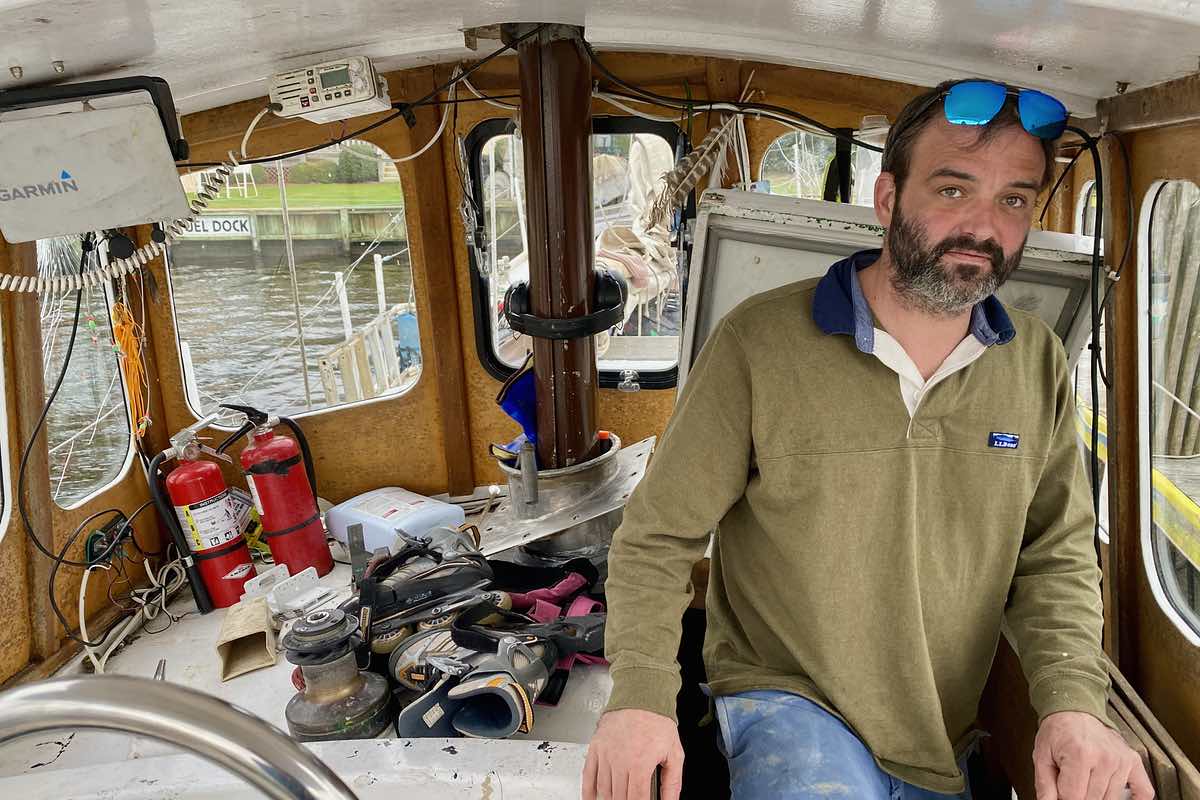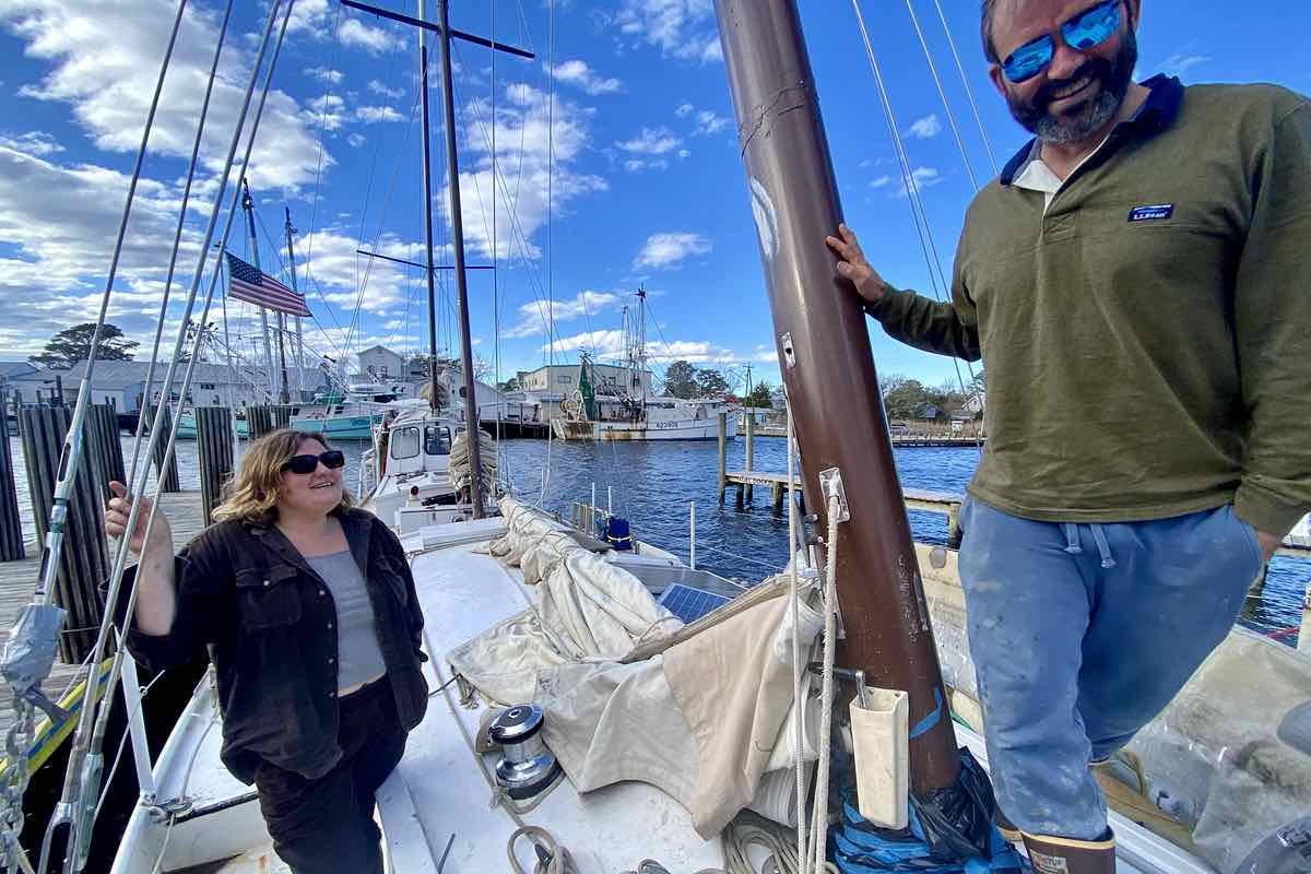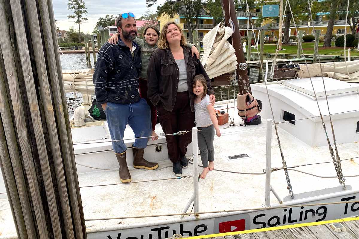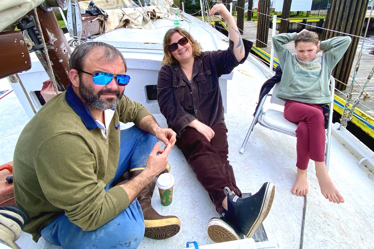 Three-quarters of the Jordan family sit and talk on the deck.“We met Newell’s wife Catherine one time here in Oriental,” Anna says. “She saw we had two daughters and says, Newell spent his life building this boat, and that he built it just for us.”