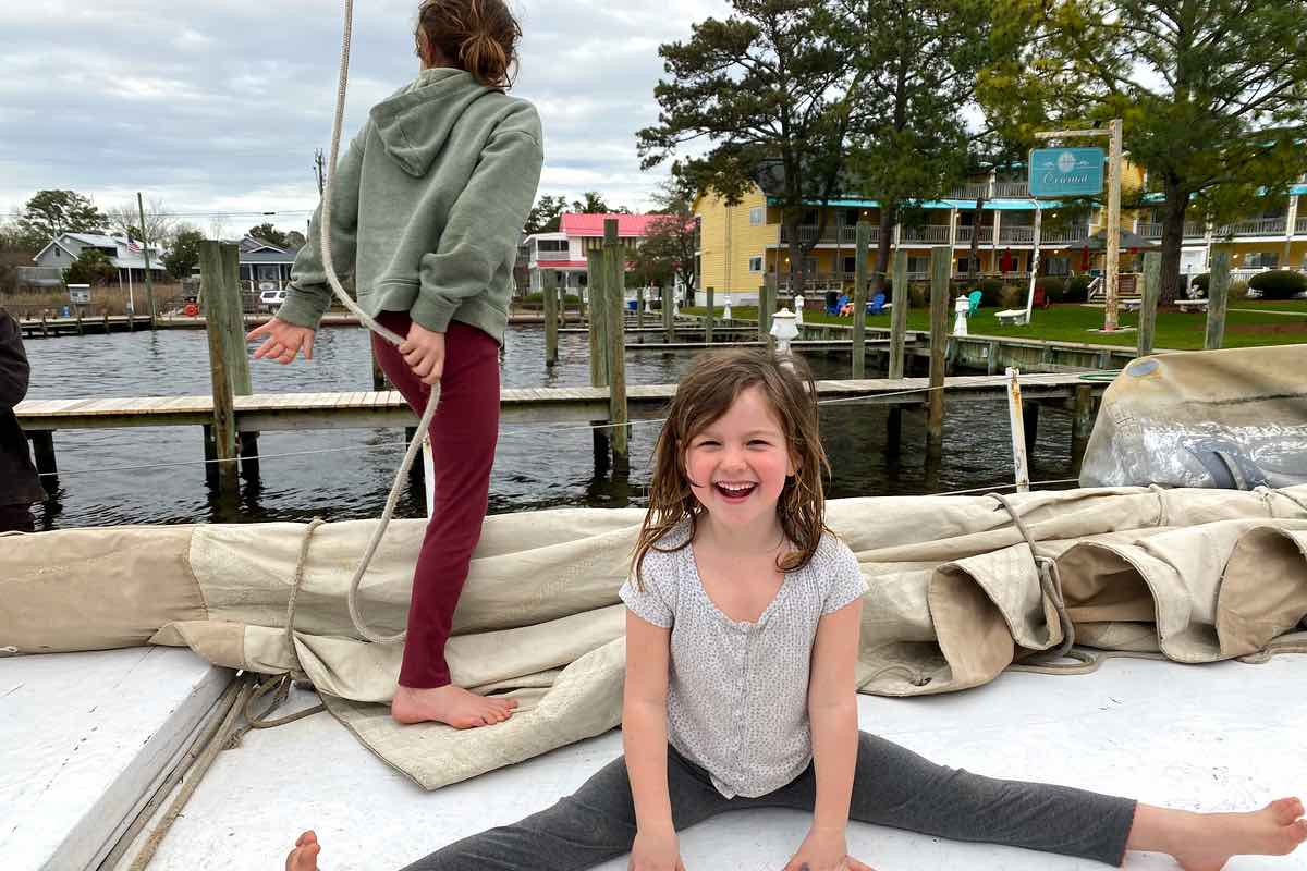 Back in Oriental and it’s a few days before Grace’s ninth birthday. Roller blades and skateboards are strewn about on deck with the boat in port a few days. Grace is the spitting image of her father and mimics her mom’s practicality. She micromanages her little sister as they wander for ice cream cones. Grace’s tiny stature and occasional r’s that sound like w’s are more indicative of her age than her advanced skillset.