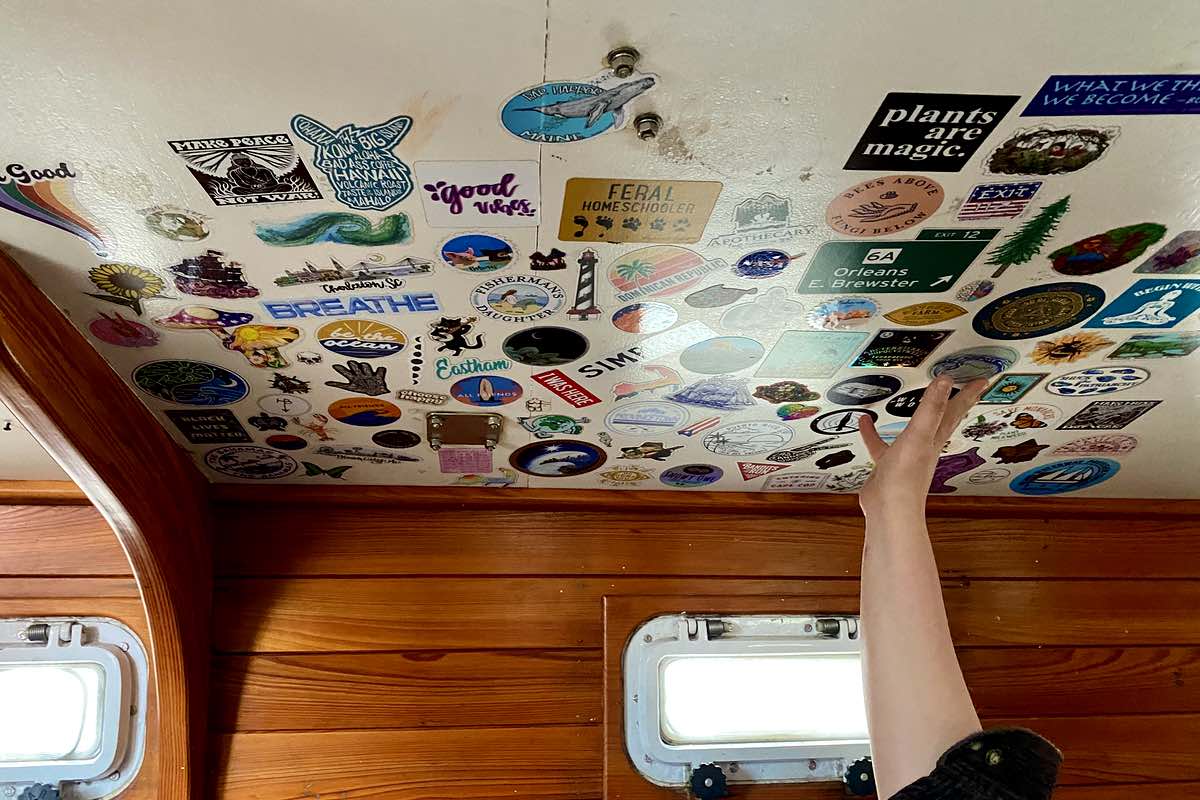 Anna points out part of the decor: a sticker collection.Bullet holes were the least of the Sarah G’s worries. The three-masted schooner had no masts and there was a giant hole in the deck from port to starboard; as if a meteor had landed amidships. A salvage company was going to rip out the 80-horsepower Perkins 4.236 marine diesel engine and accompanying Westerbeke generator.