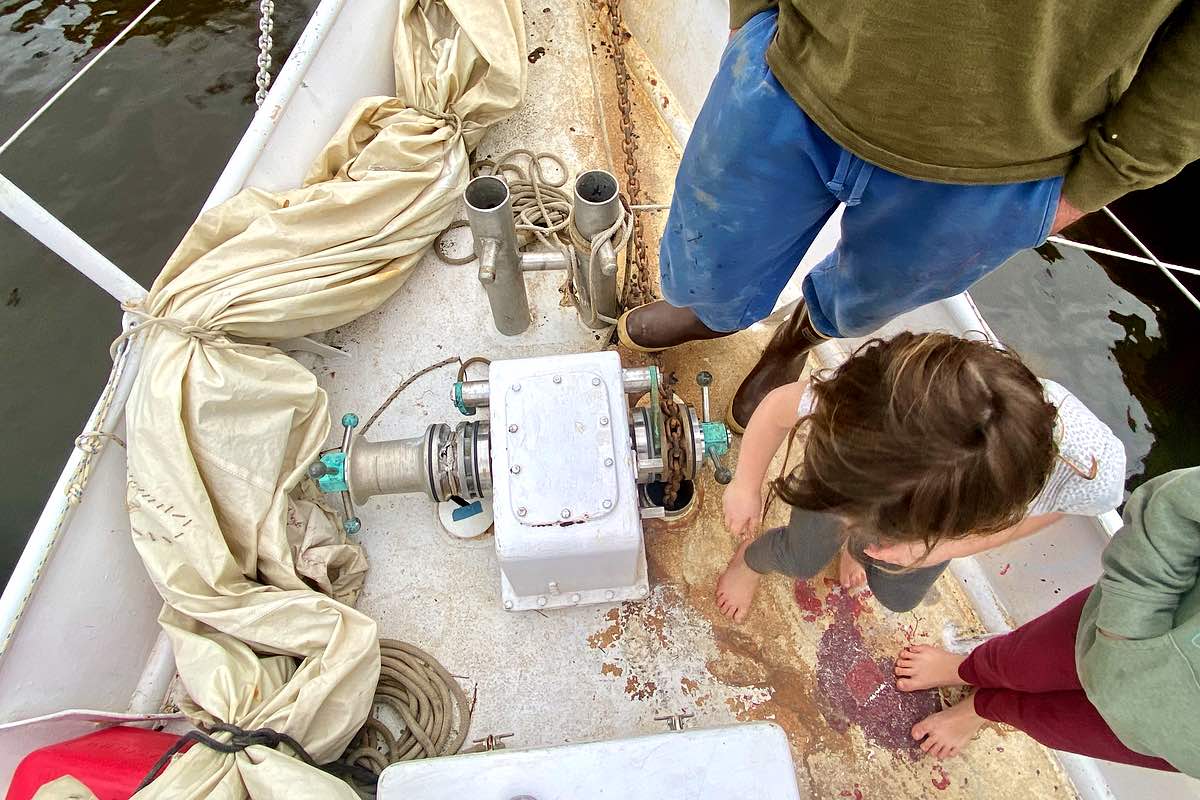 Many of the pieces aboard are salvaged from other boats, or restored from what was left.George has also worked construction jobs specific to Cape Cod architecture, but has focused on repairing their floating home while Anna (and Grace—who says it’s her favorite activity), works horseshoe crabbing to float them through the cruising season.