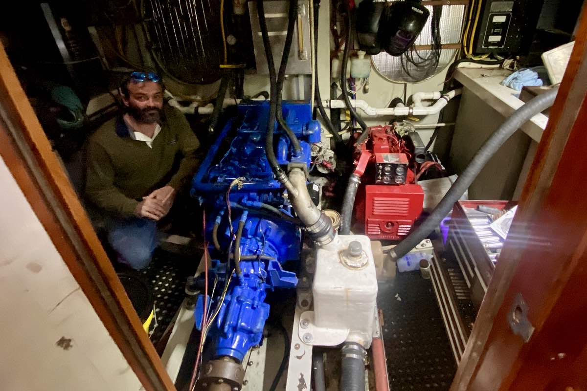 George below decks with the diesel motor. Salvagers were going to take the motor and scuttle the boat.His mini-me agrees. Grace says her favorite place to be is out on the open water with the autopilot going. Where if you make a turn, you aren’t going to hit anything for days.