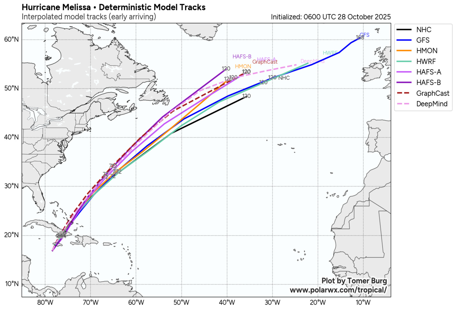 The Forecaster's Discussion above often refers to several computer models. The graphic below includes multiple projected paths, showing what the different computer models indicate. The black line is the NHC (National Hurricane Center) path. This graphic is not an official NHC product. For the official NHC projected path of Hurricane Melissa click here.
