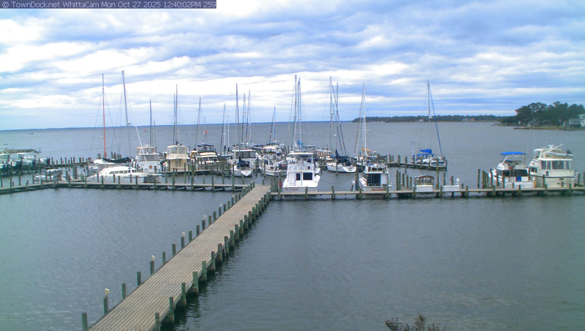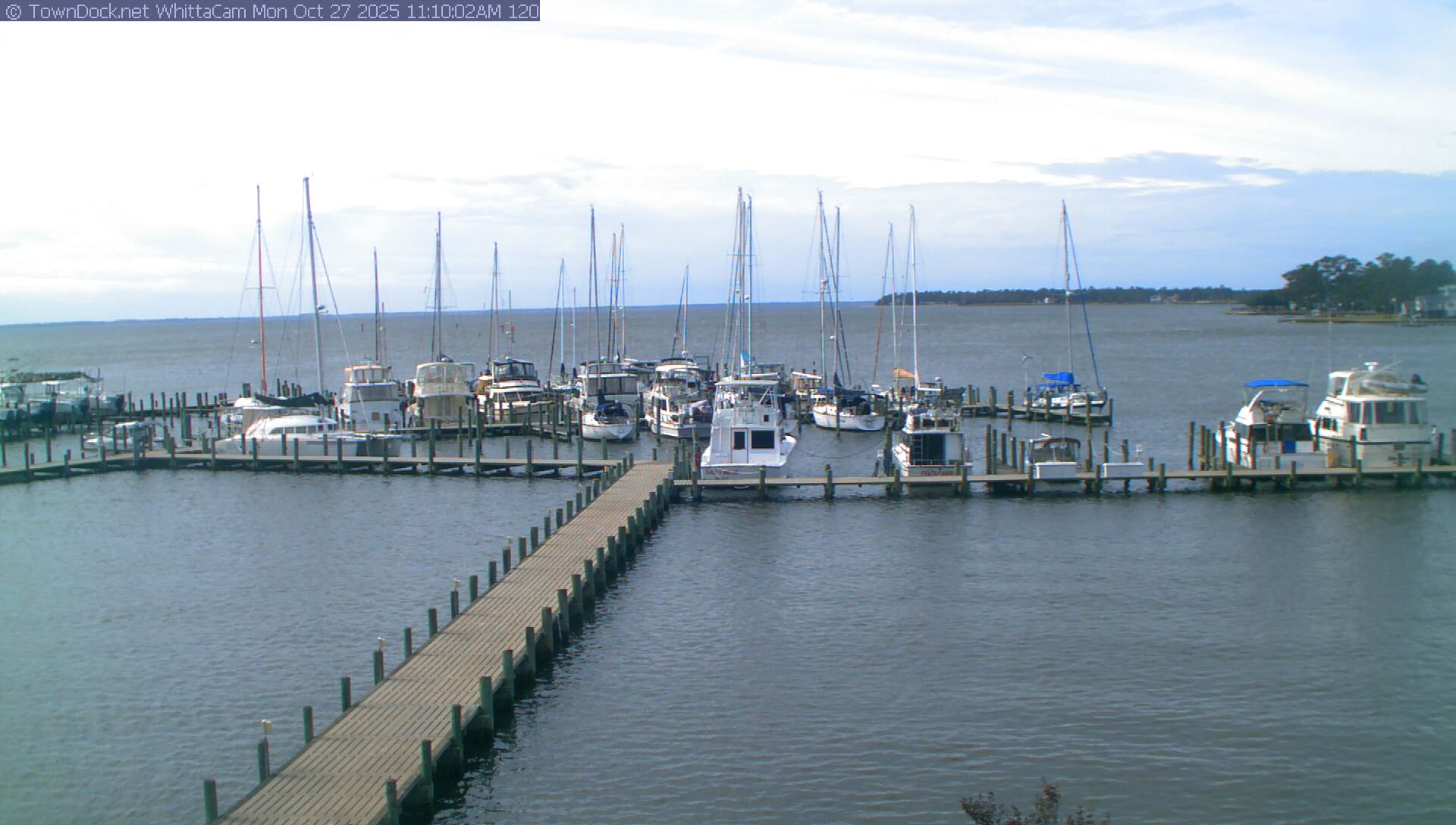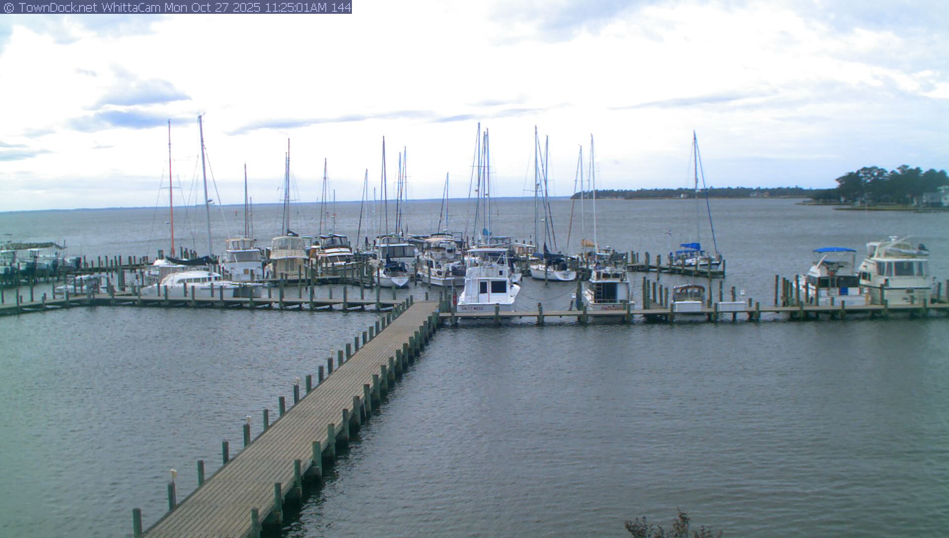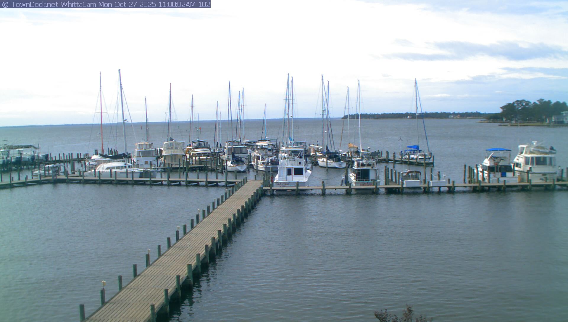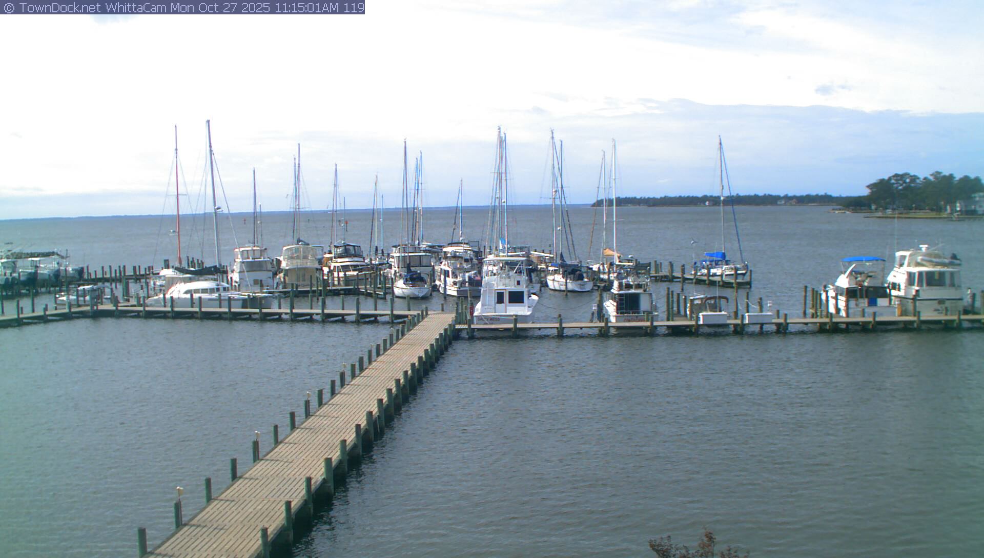 shows Whittaker Pointe Marina and the Whittaker Creek Channel entrance, with the Neuse River in the background. WhittaCam takes a new picture every five minutes from dawn til just before dusk. Click on the image to see a larger version. Once you see that larger version, you can click (see arrow at right) to go back in time and see recent photos. Harbor Cam currently takes photos from 6:30am to 6:40pm.