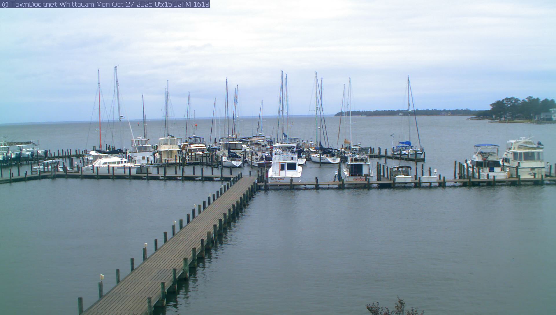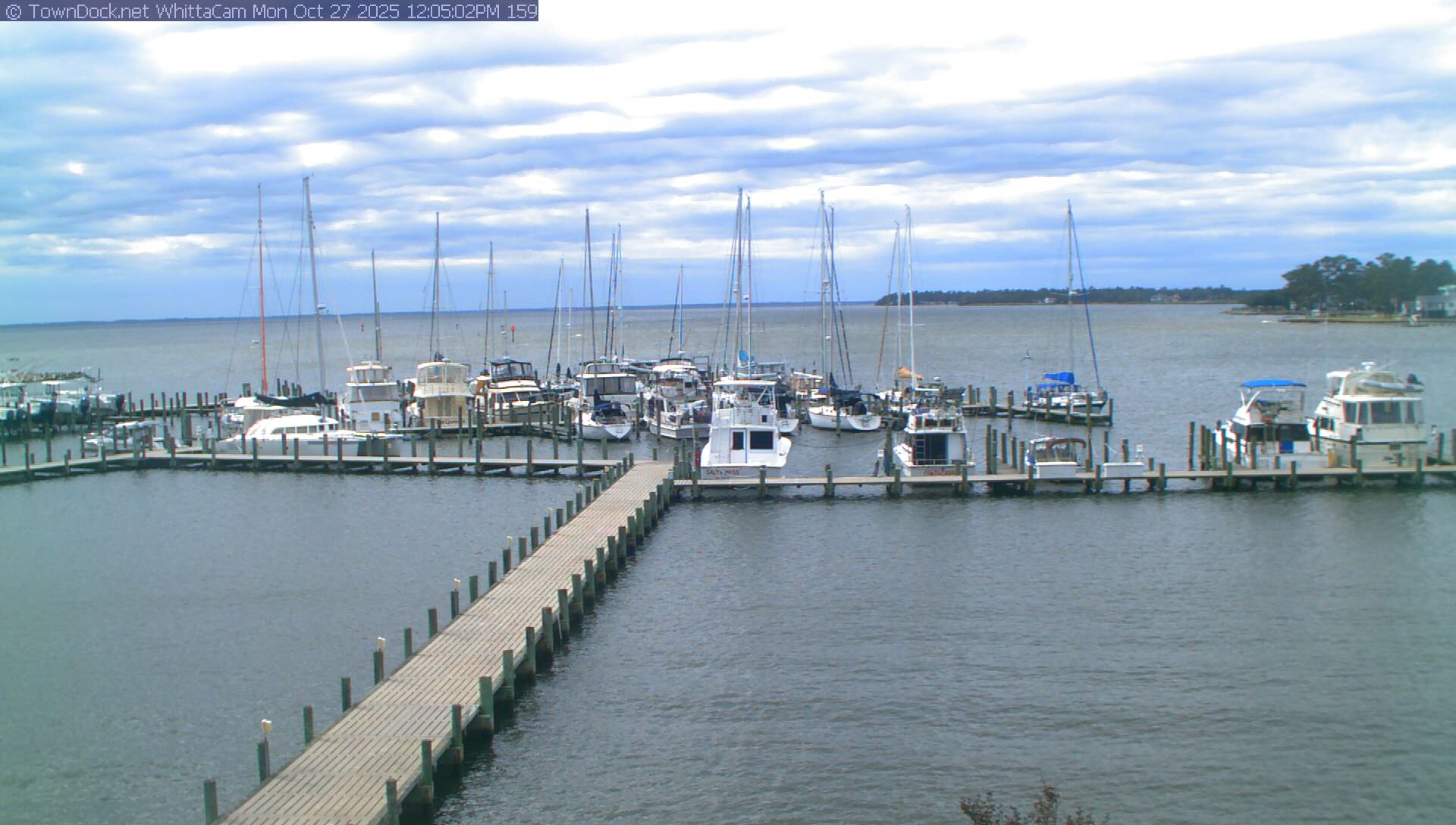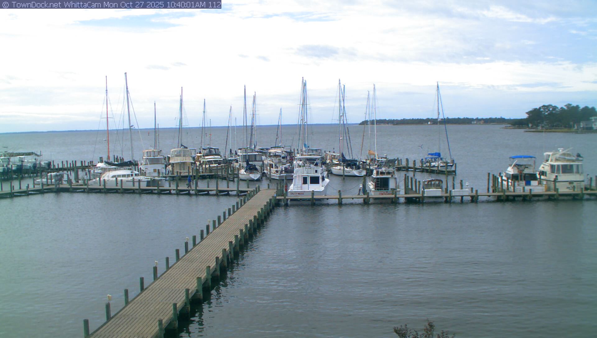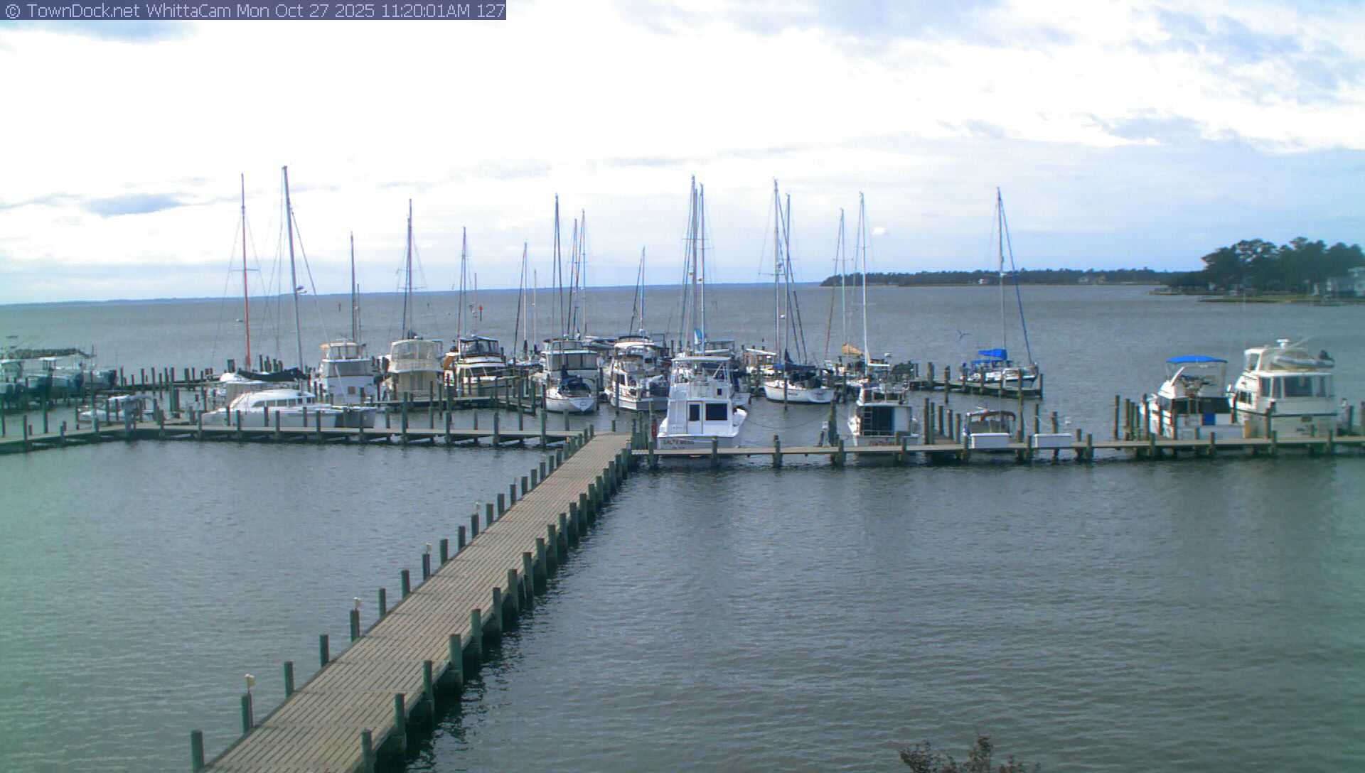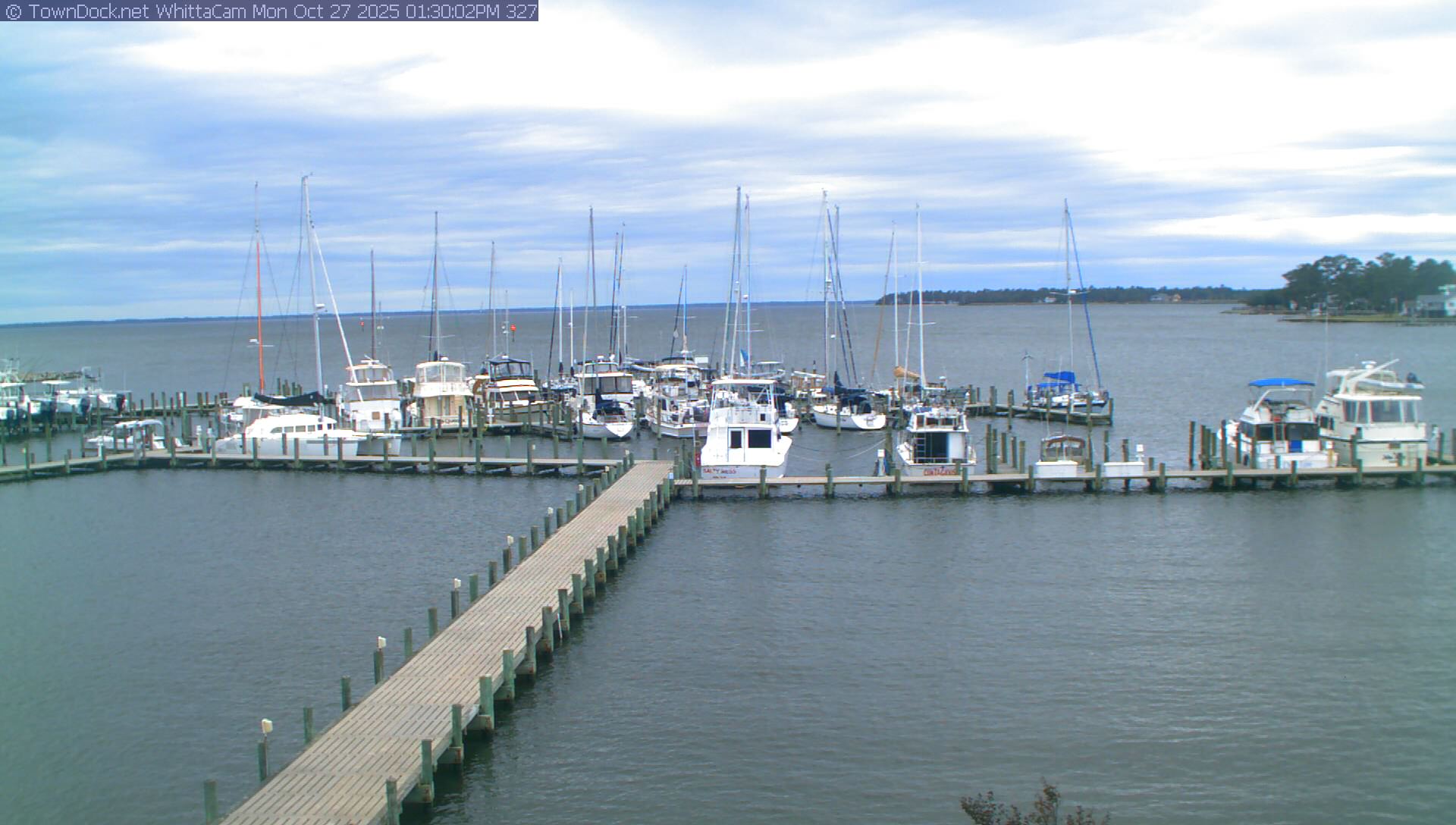 shows Whittaker Pointe Marina and the Whittaker Creek Channel entrance, with the Neuse River in the background. WhittaCam takes a new picture every five minutes from dawn til just before dusk. Click on the image to see a larger version. Once you see that larger version, you can click (see arrow at right) to go back in time and see recent photos. Harbor Cam currently takes photos from 6:30am to 6:40pm.