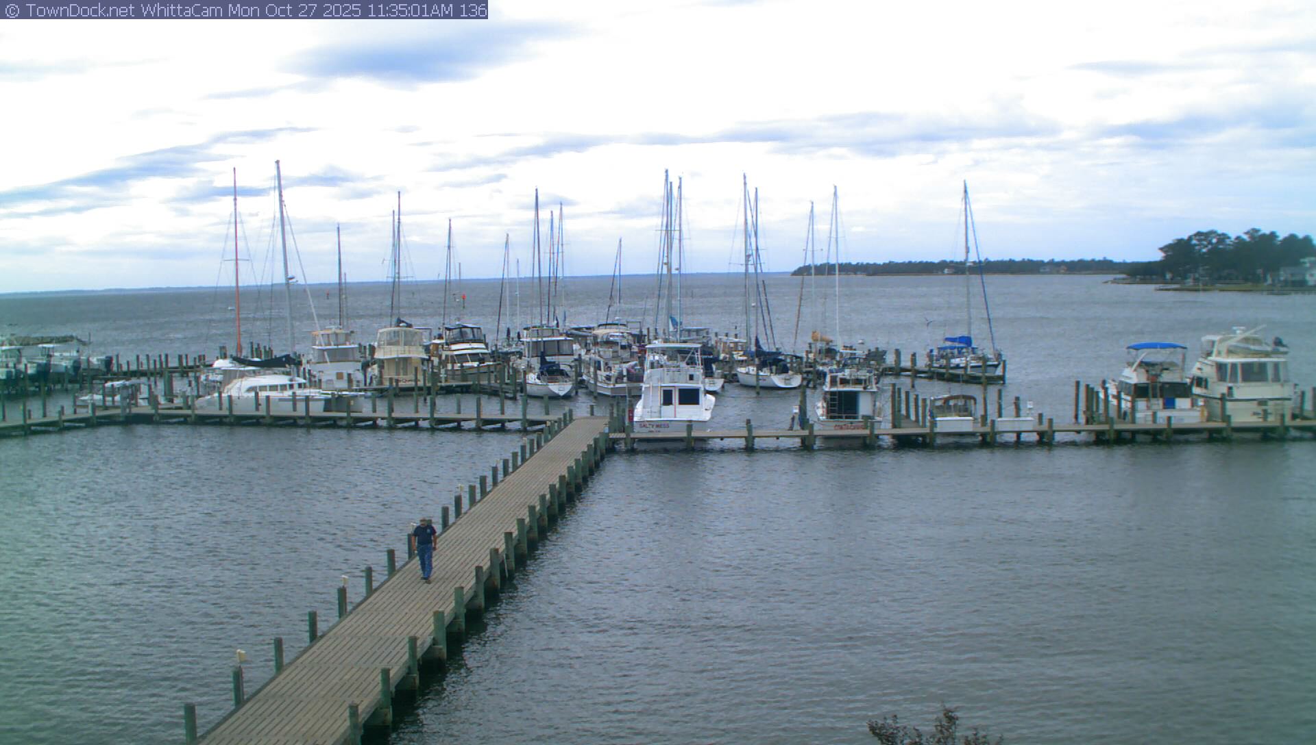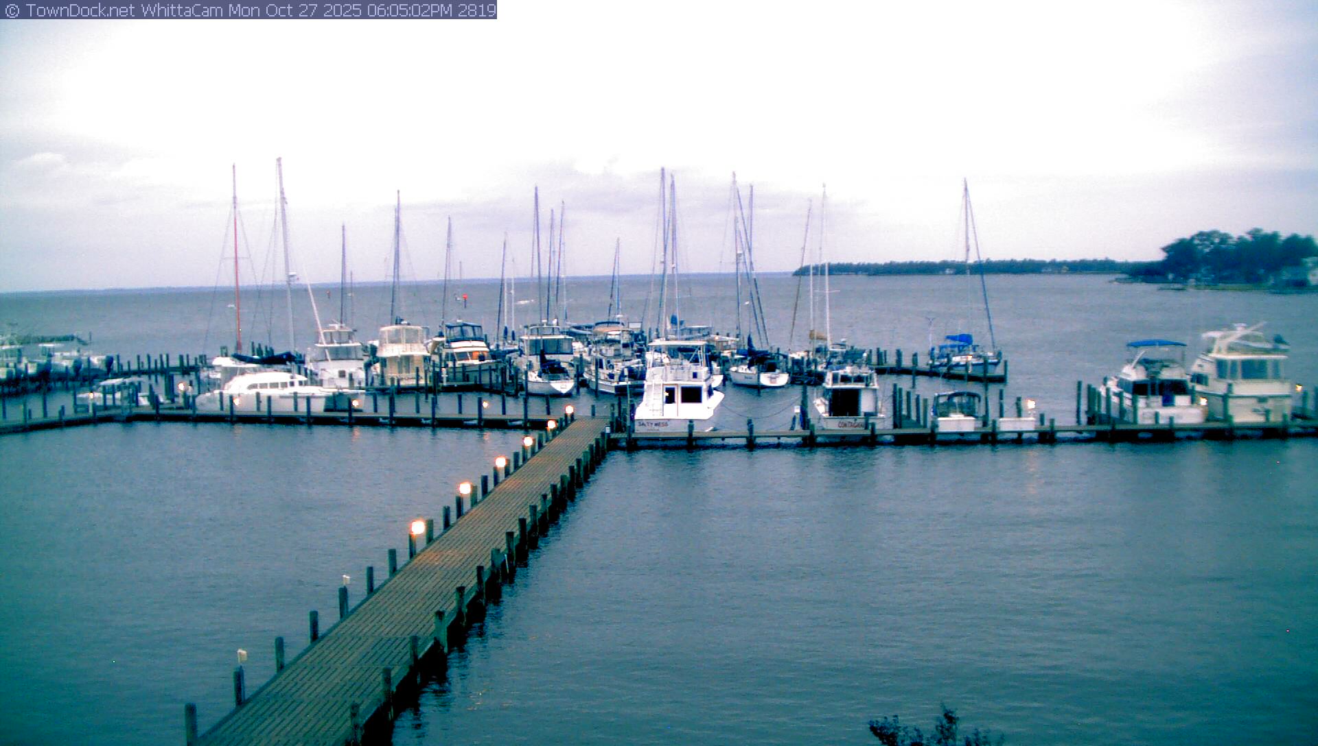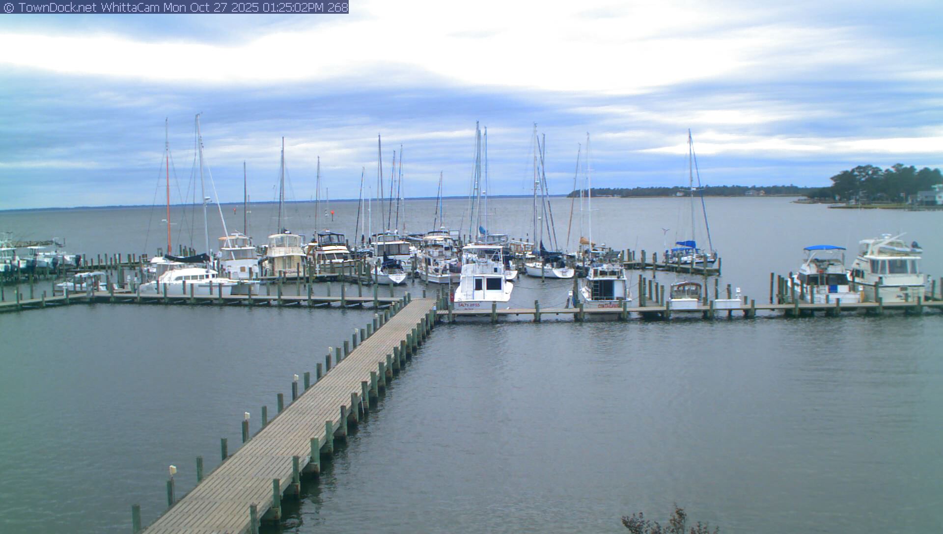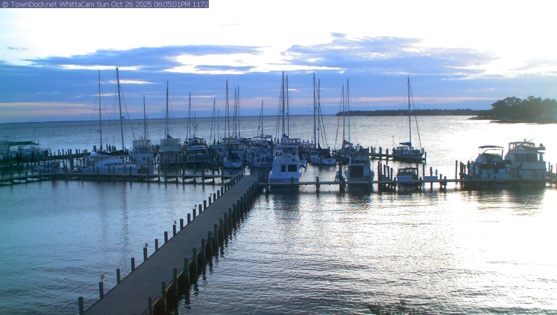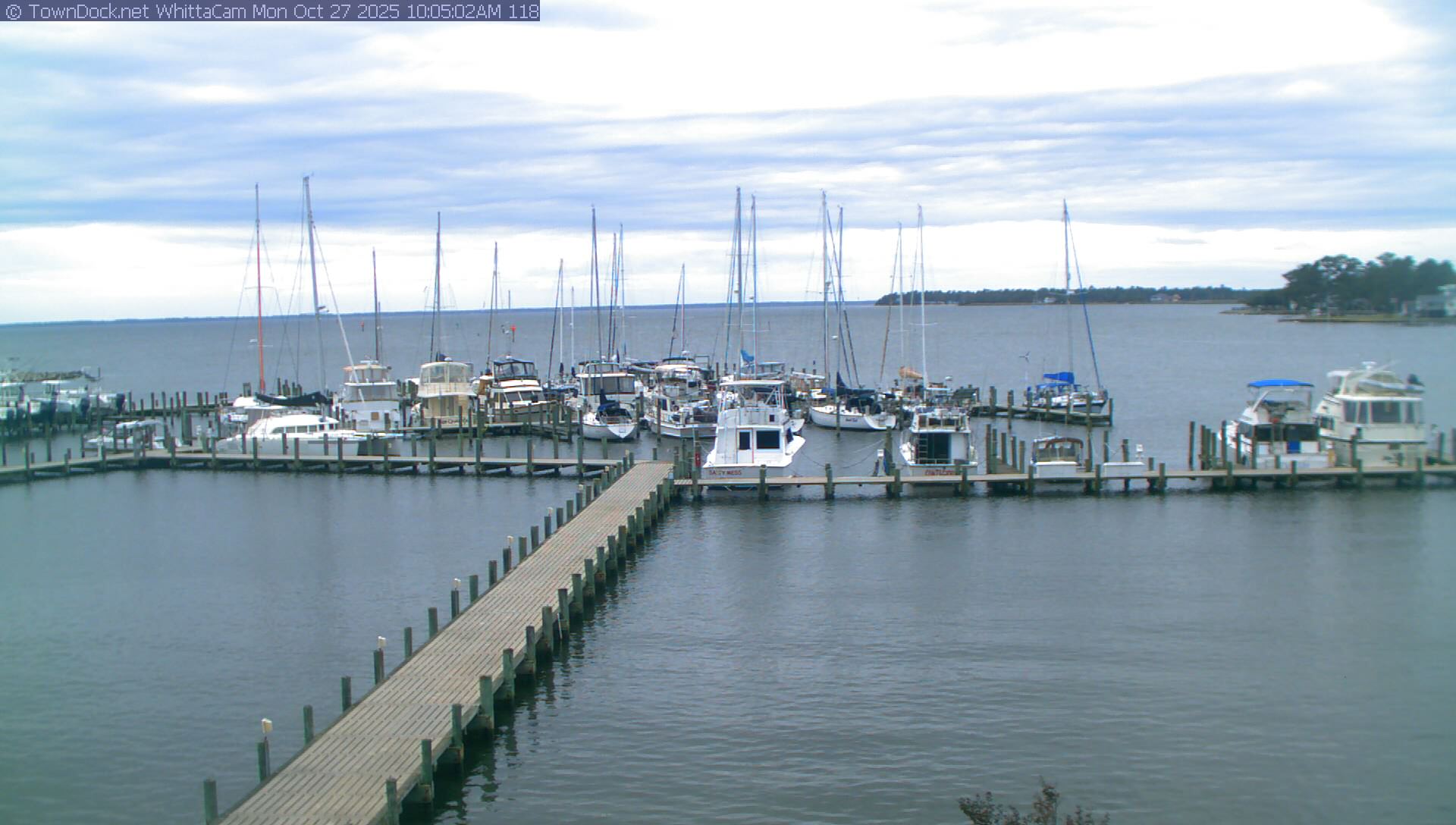 shows Whittaker Pointe Marina and the Whittaker Creek Channel entrance, with the Neuse River in the background. WhittaCam takes a new picture every five minutes from dawn til just before dusk. Click on the image to see a larger version. Once you see that larger version, you can click (see arrow at right) to go back in time and see recent photos. Harbor Cam currently takes photos from 6:30am to 6:40pm.