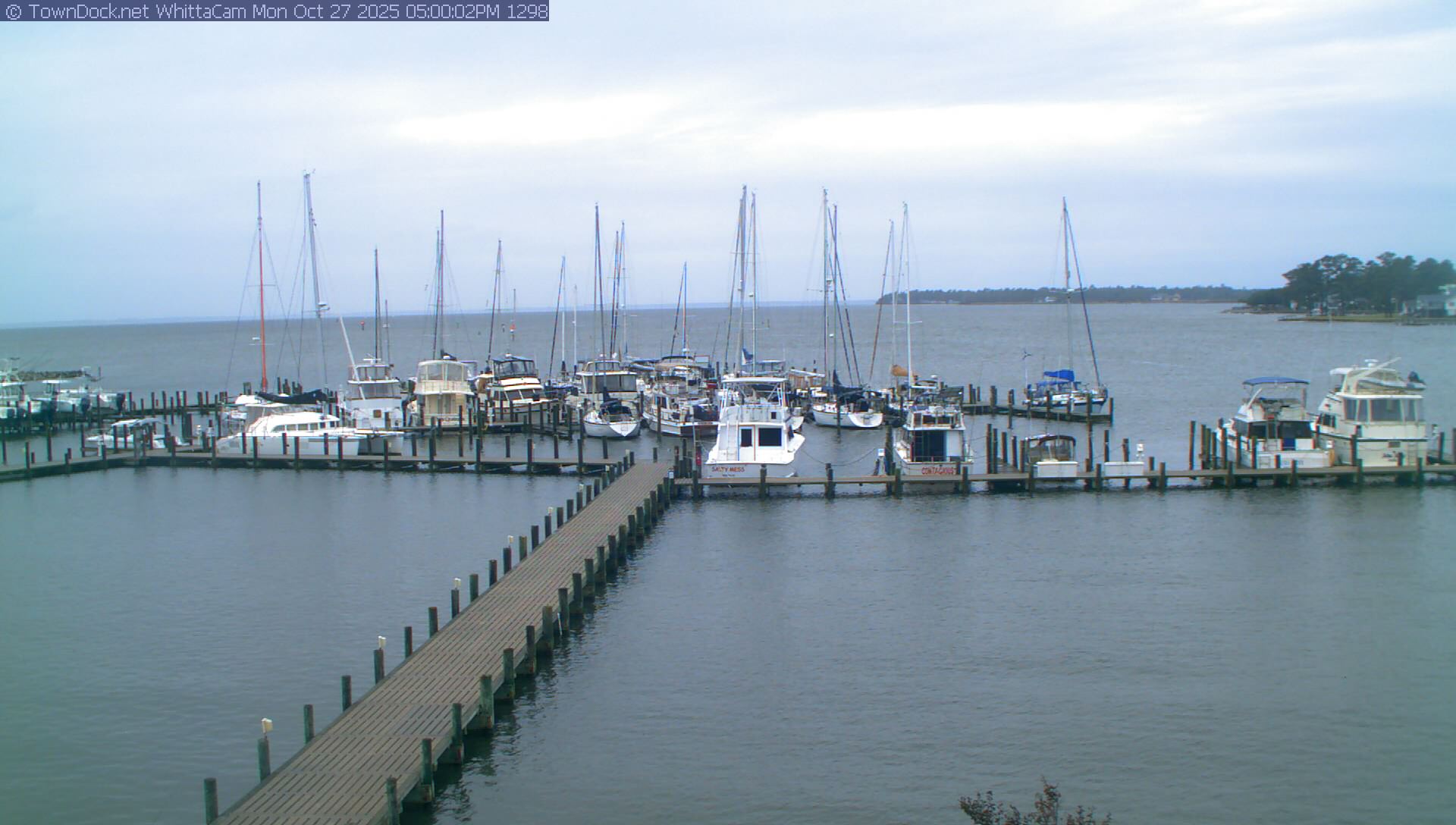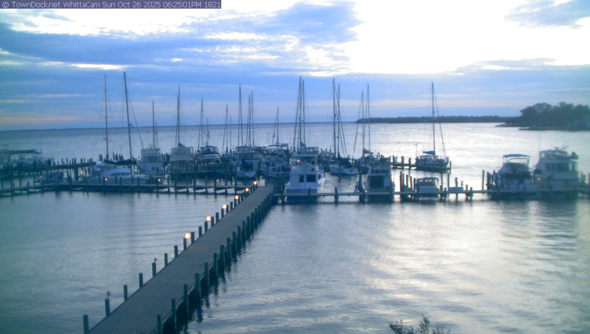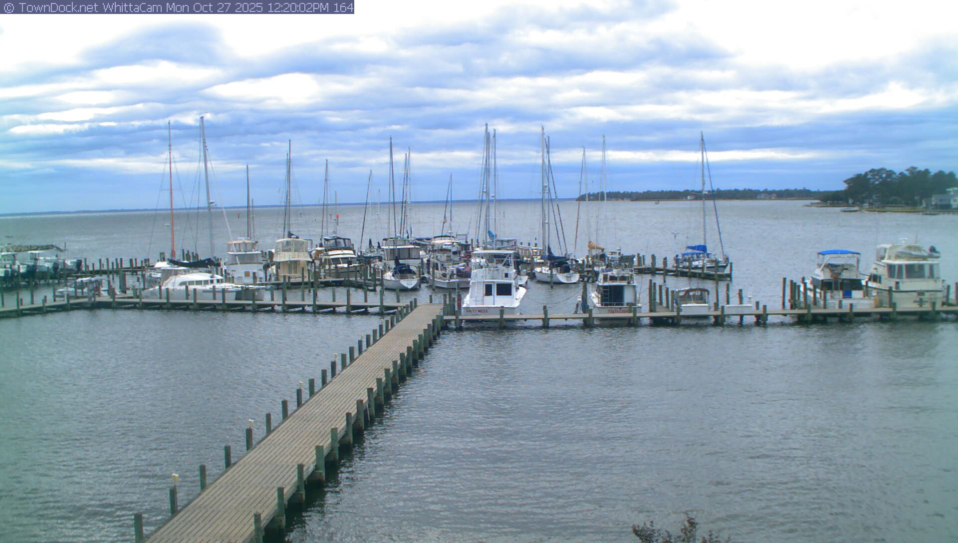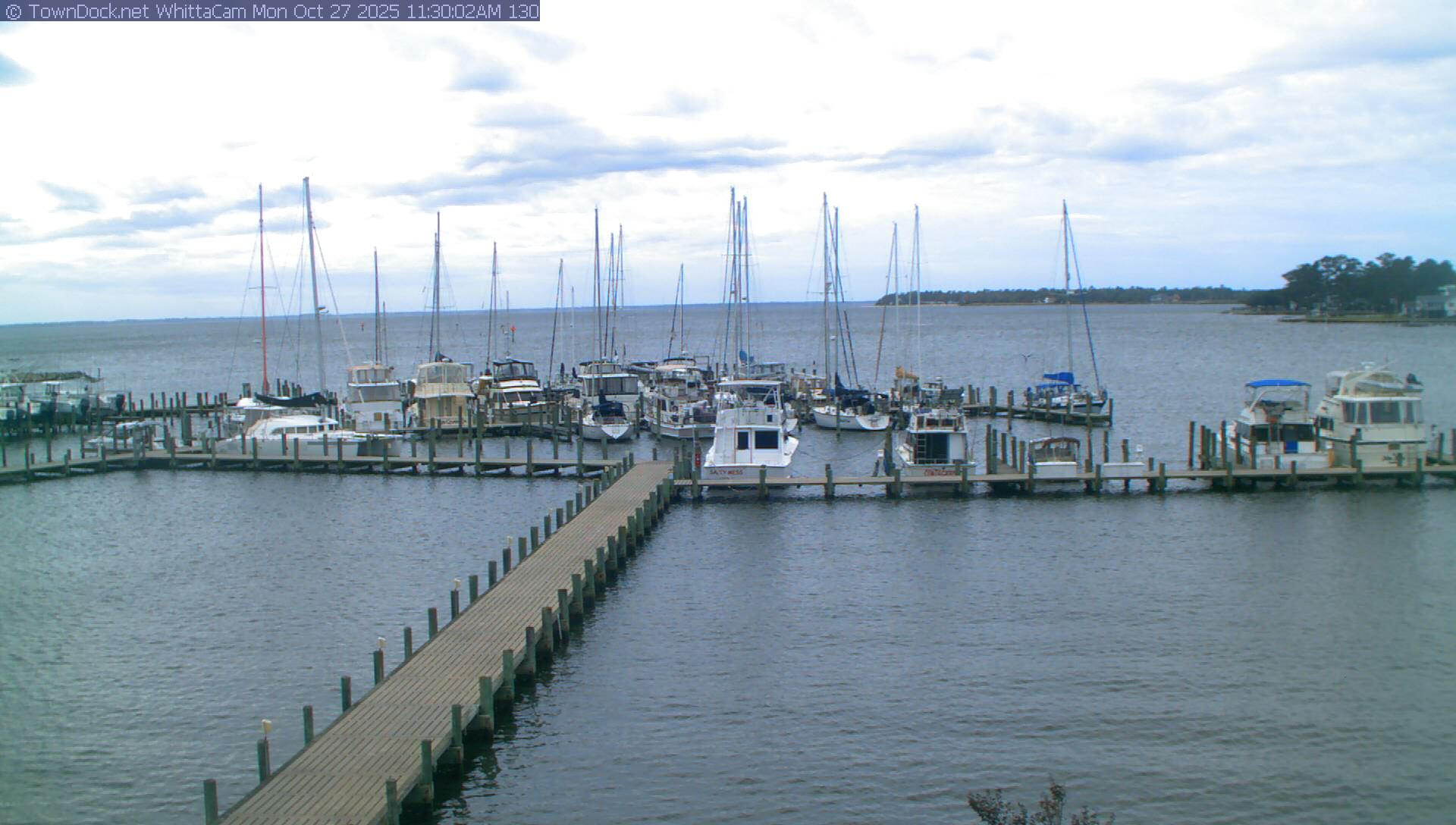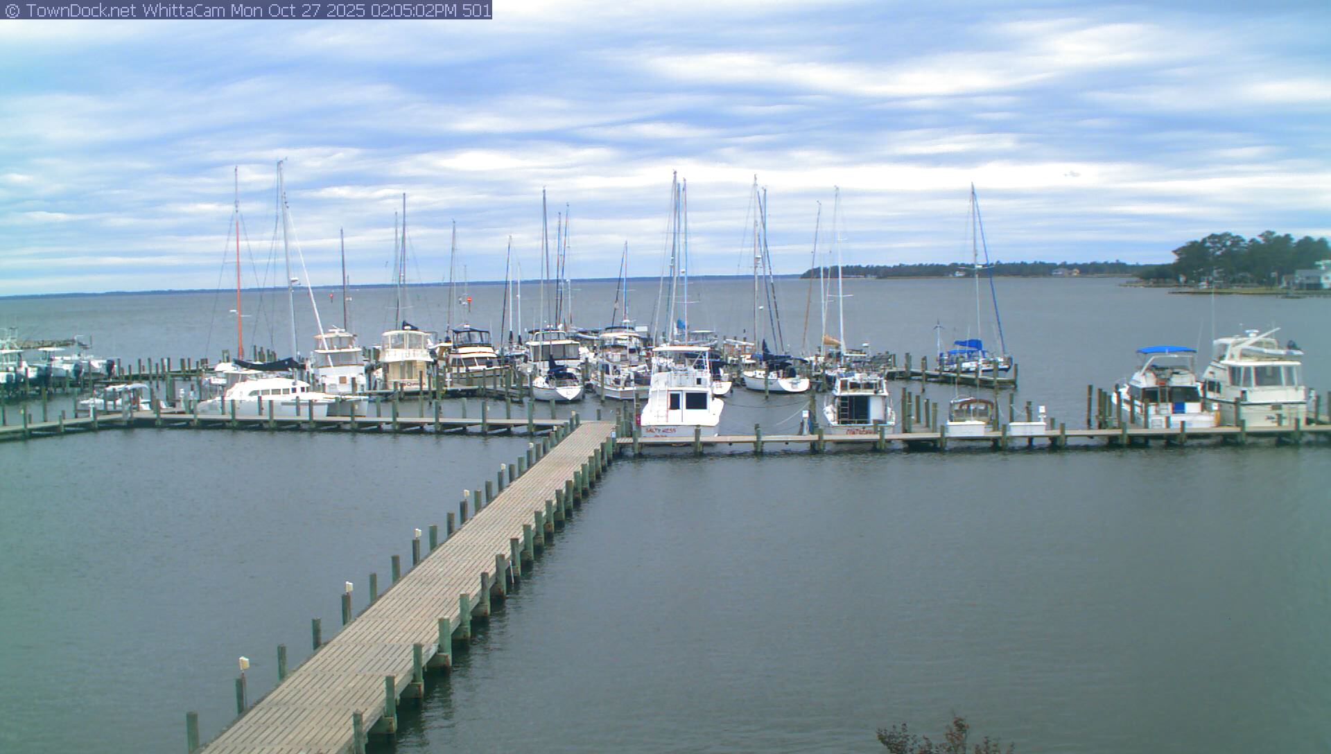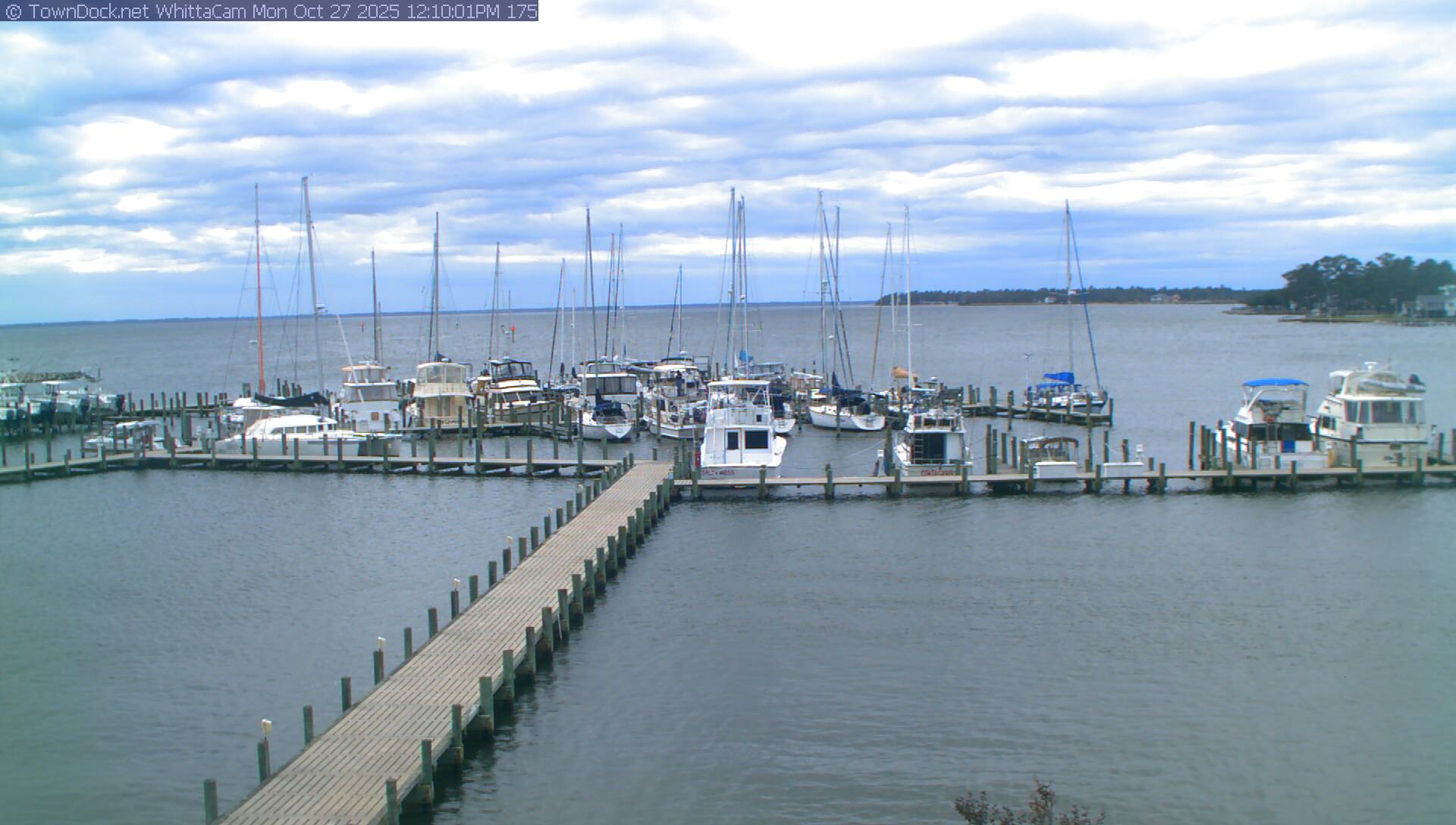 shows Whittaker Pointe Marina and the Whittaker Creek Channel entrance, with the Neuse River in the background. WhittaCam takes a new picture every five minutes from dawn til just before dusk. Click on the image to see a larger version. Once you see that larger version, you can click (see arrow at right) to go back in time and see recent photos. Harbor Cam currently takes photos from 6:30am to 6:40pm.