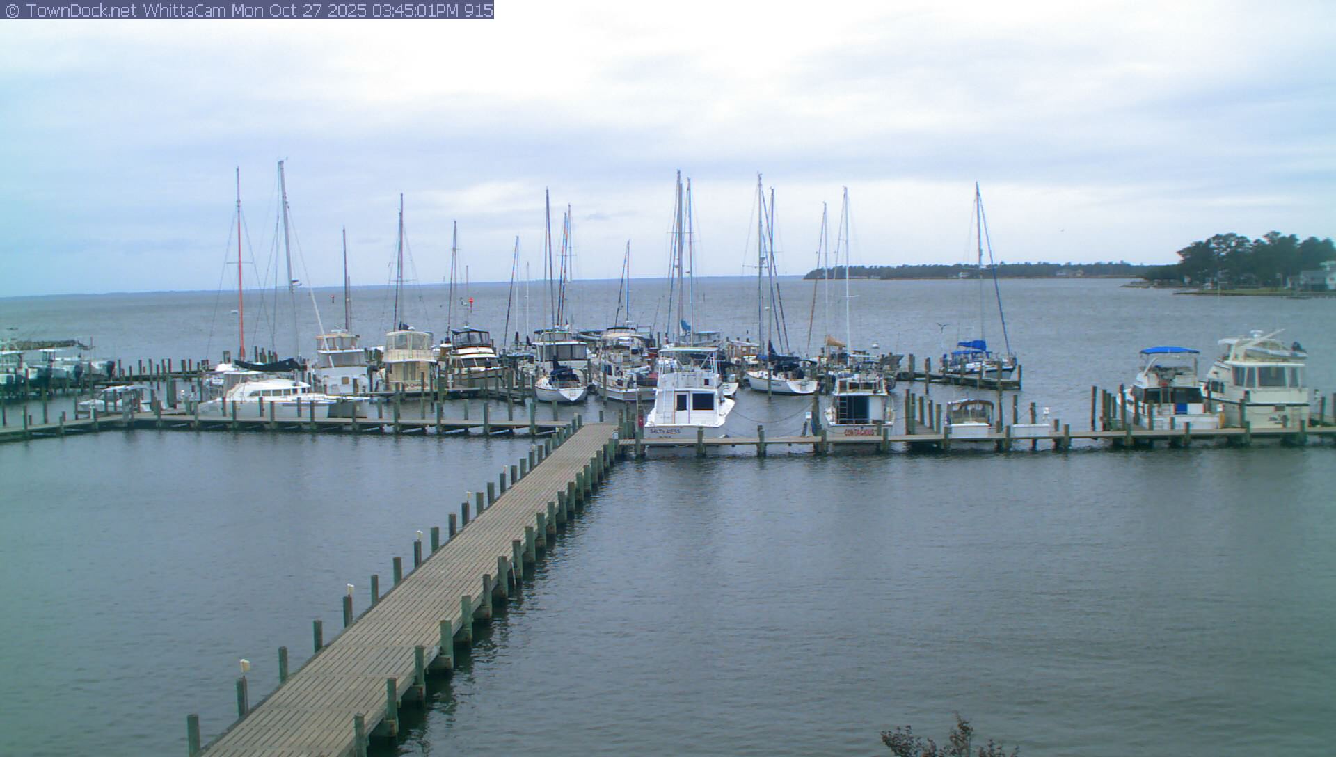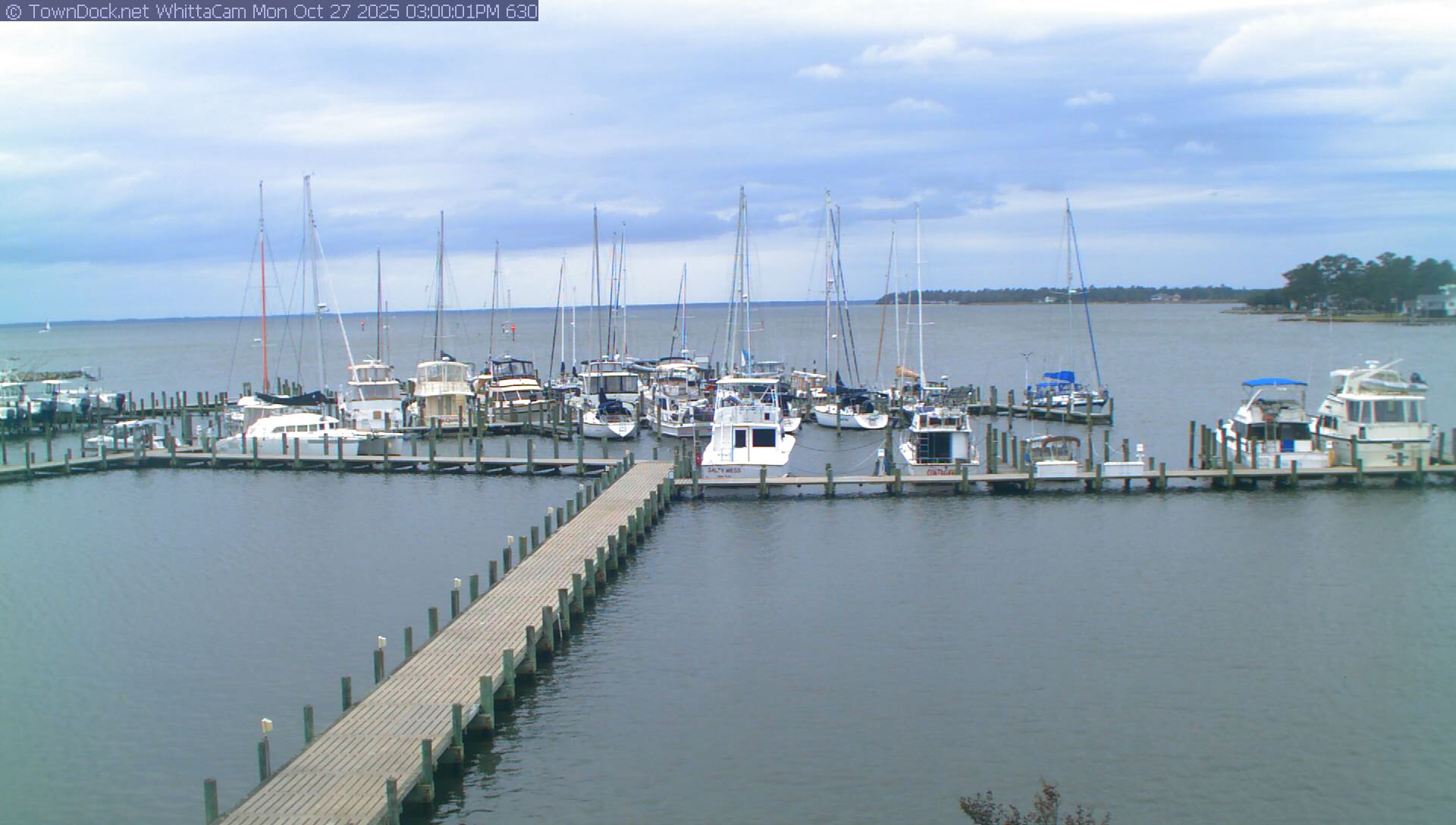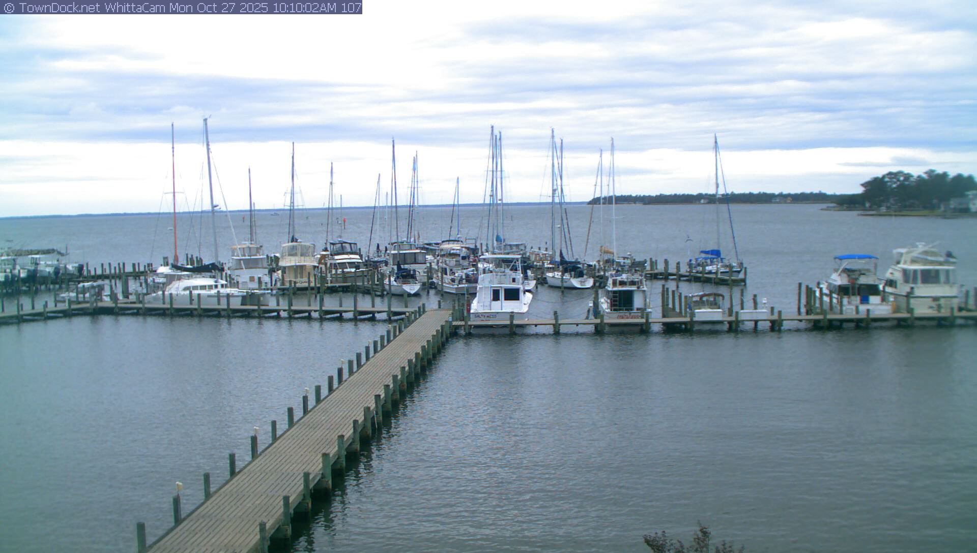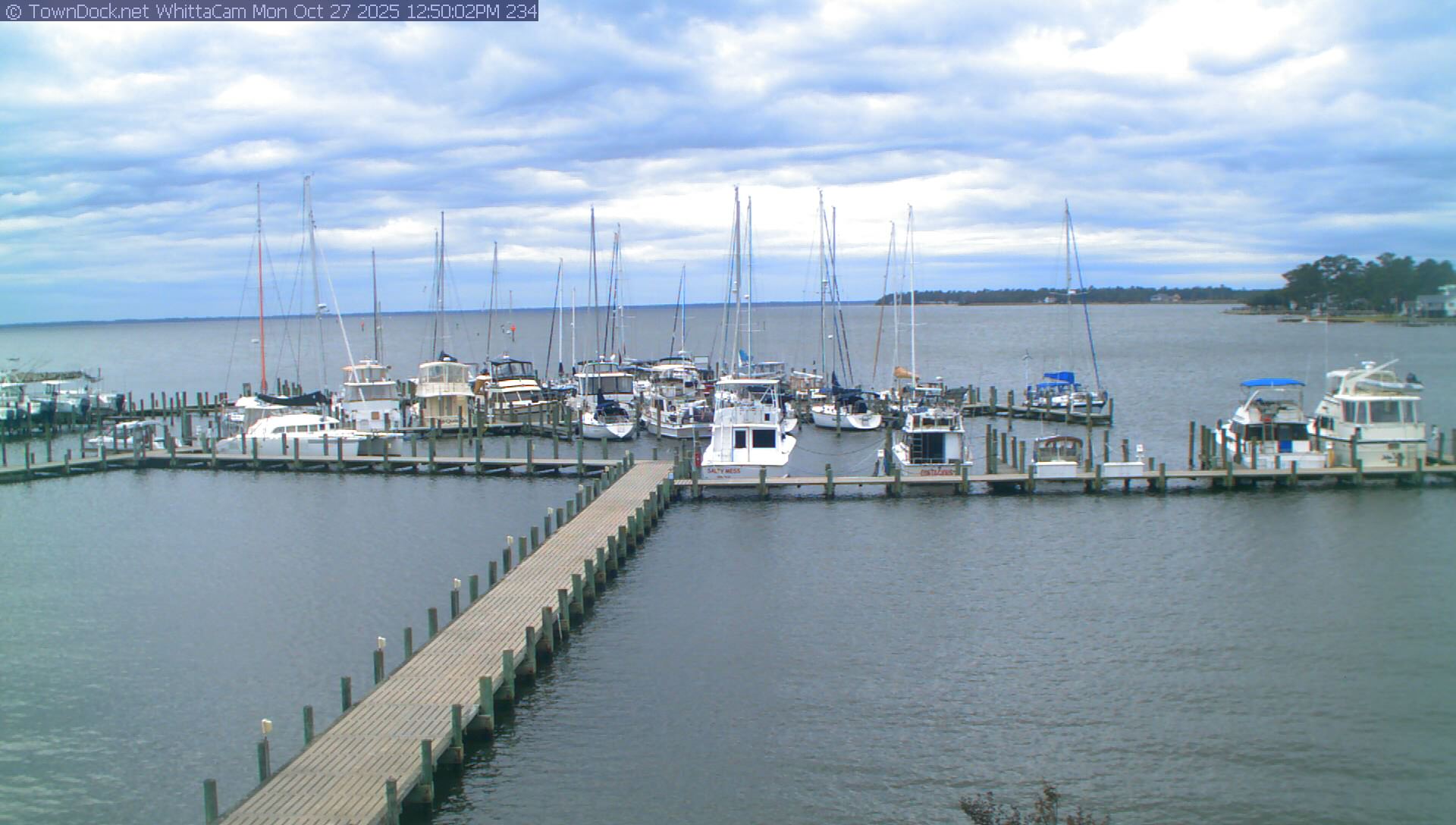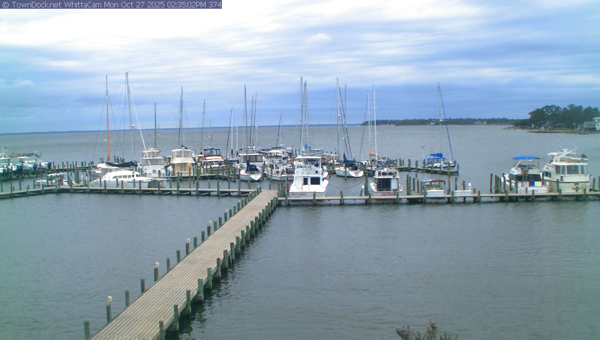 shows Whittaker Pointe Marina and the Whittaker Creek Channel entrance, with the Neuse River in the background. WhittaCam takes a new picture every five minutes from dawn til just before dusk. Click on the image to see a larger version. Once you see that larger version, you can click (see arrow at right) to go back in time and see recent photos. Harbor Cam currently takes photos from 6:30am to 6:40pm.