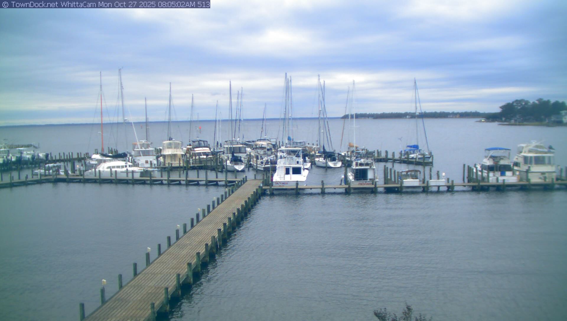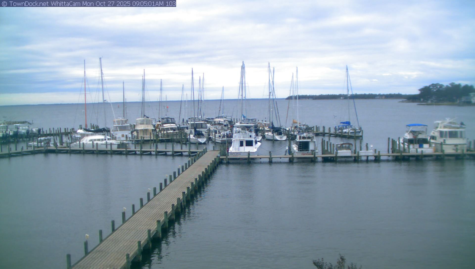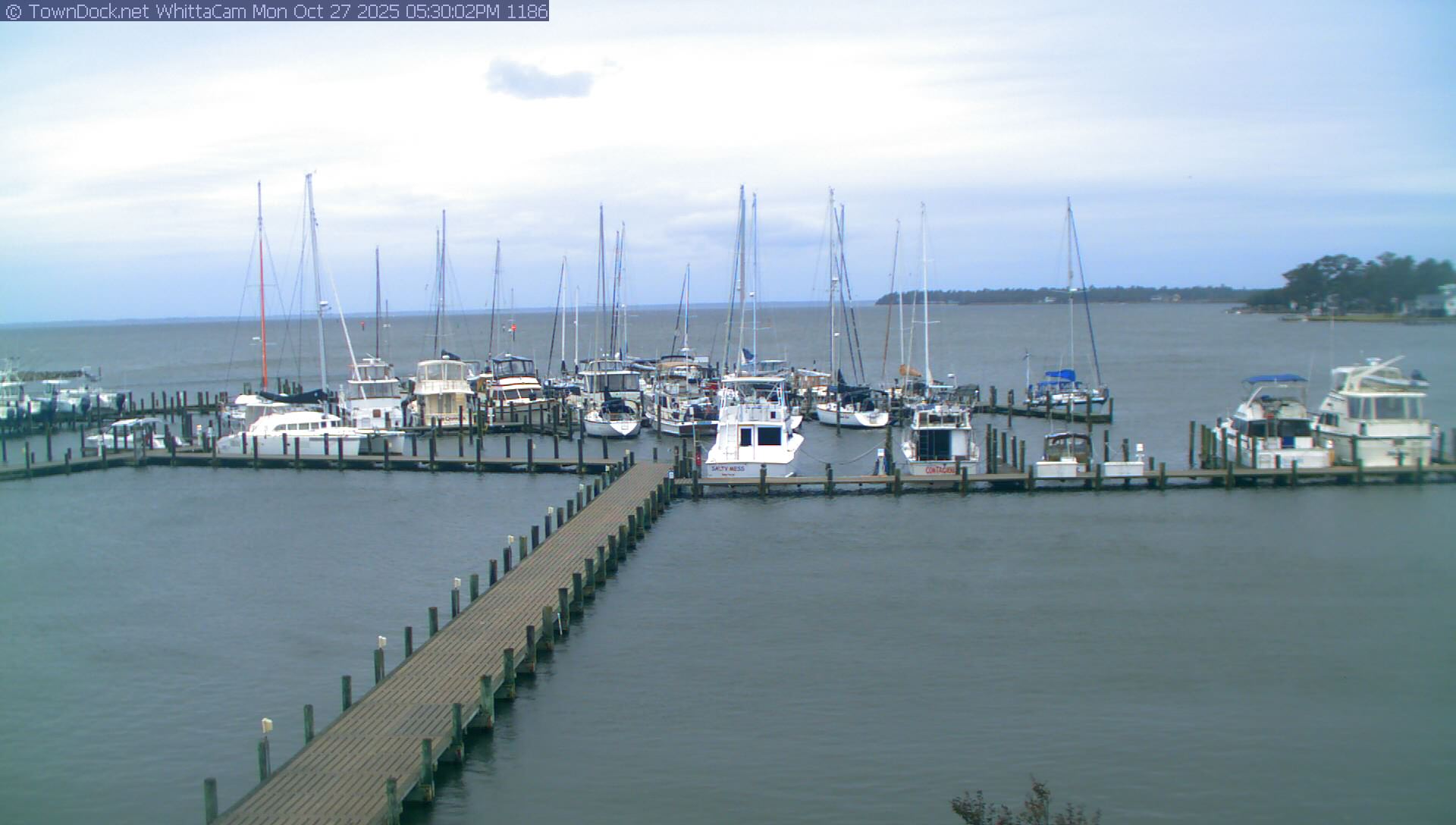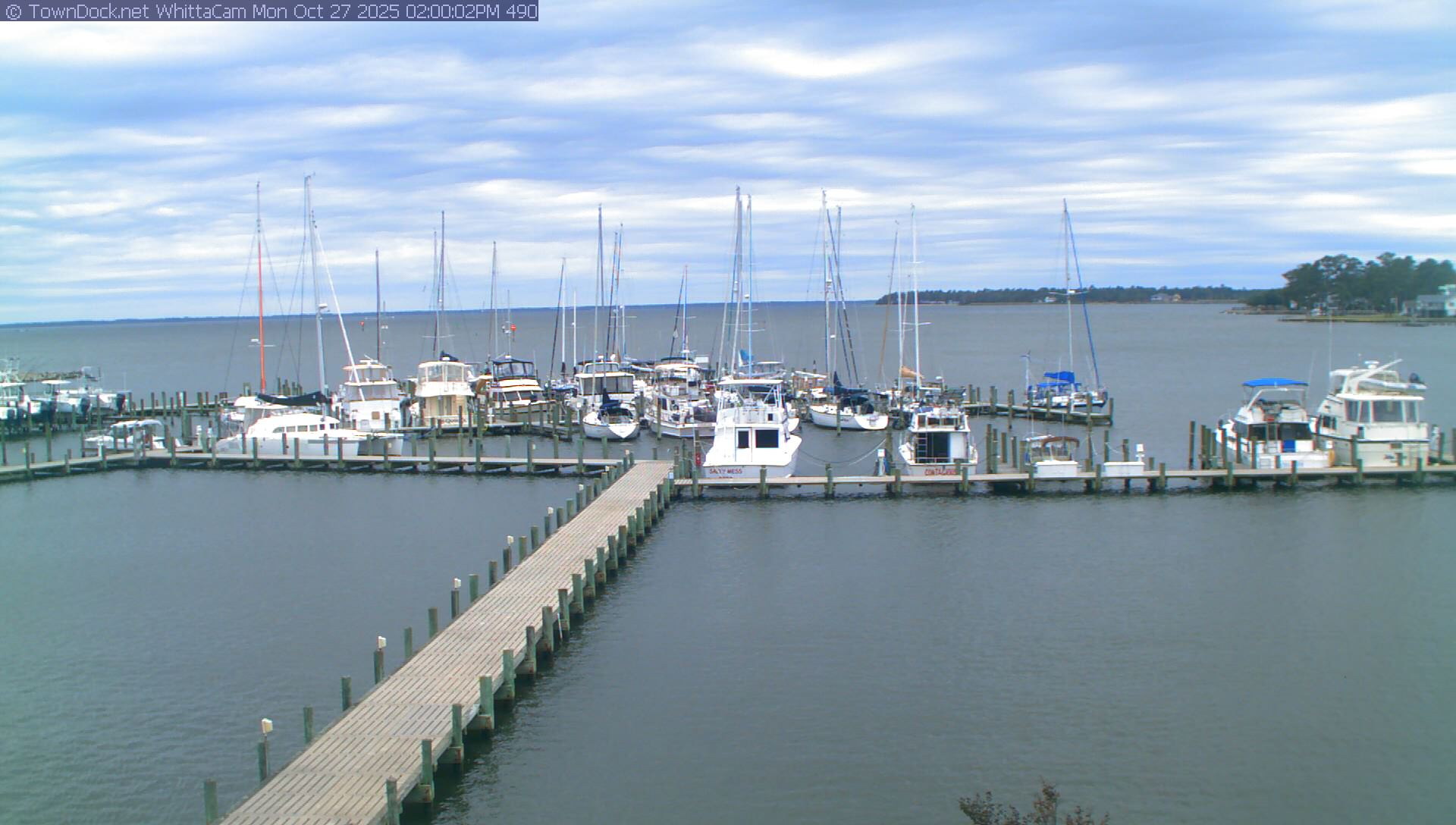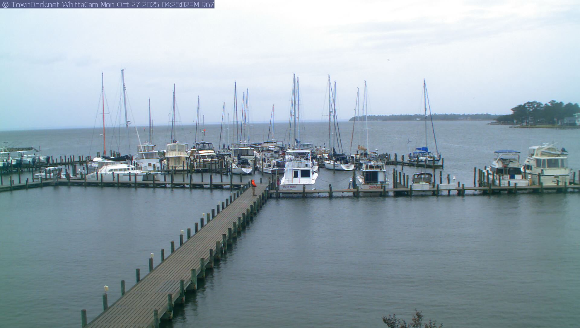 shows Whittaker Pointe Marina and the Whittaker Creek Channel entrance, with the Neuse River in the background. WhittaCam takes a new picture every five minutes from dawn til just before dusk. Click on the image to see a larger version. Once you see that larger version, you can click (see arrow at right) to go back in time and see recent photos. Harbor Cam currently takes photos from 6:30am to 6:40pm.