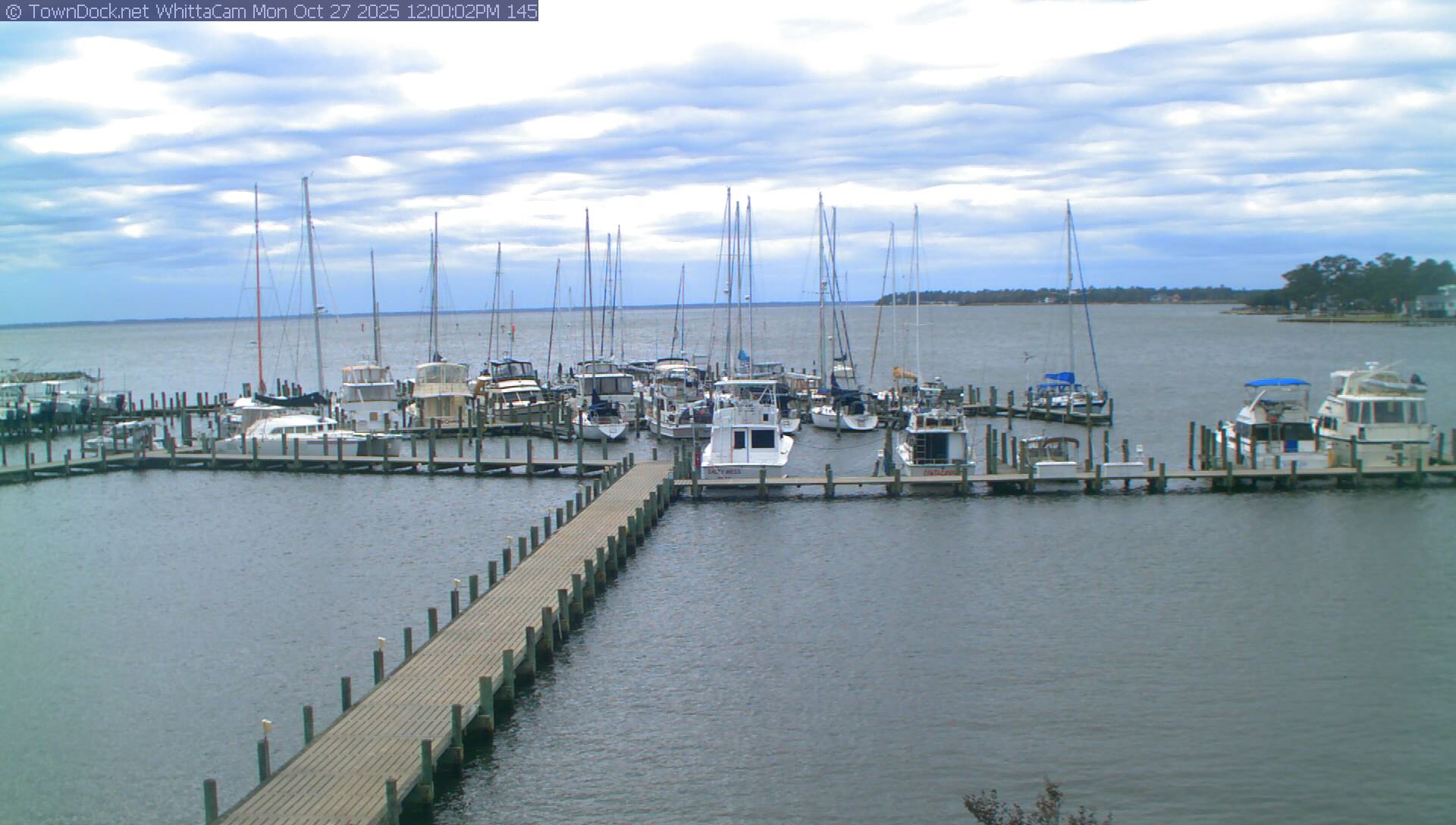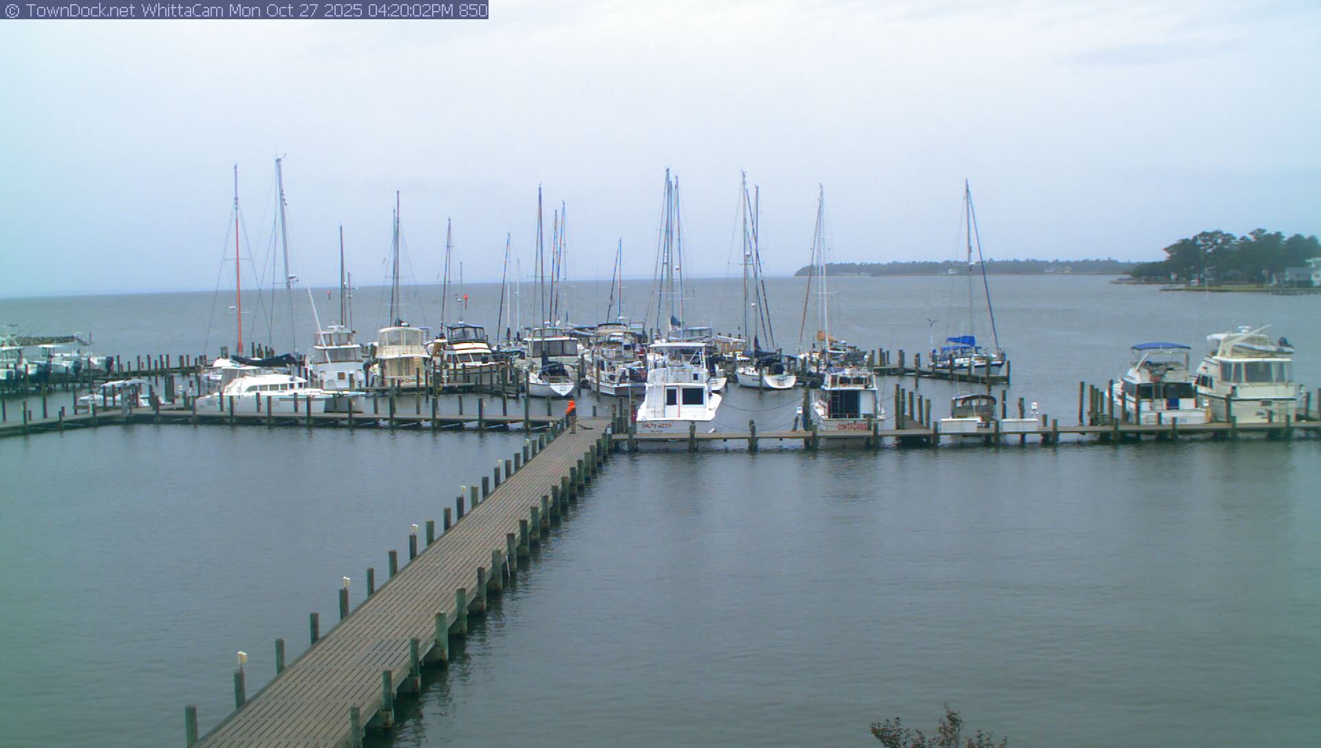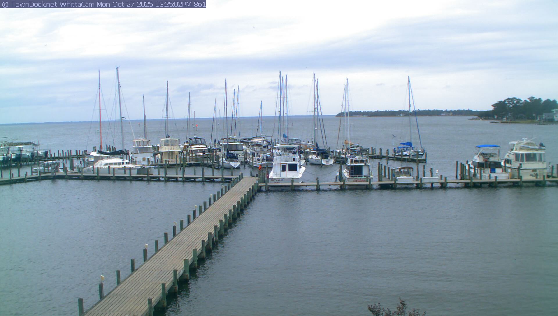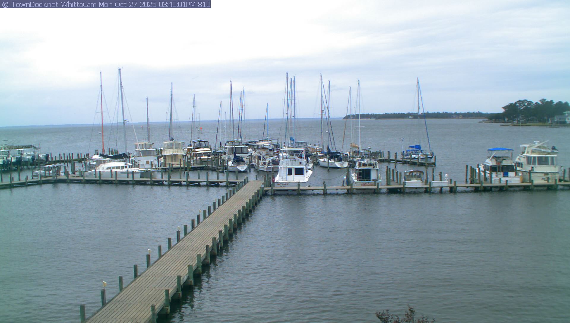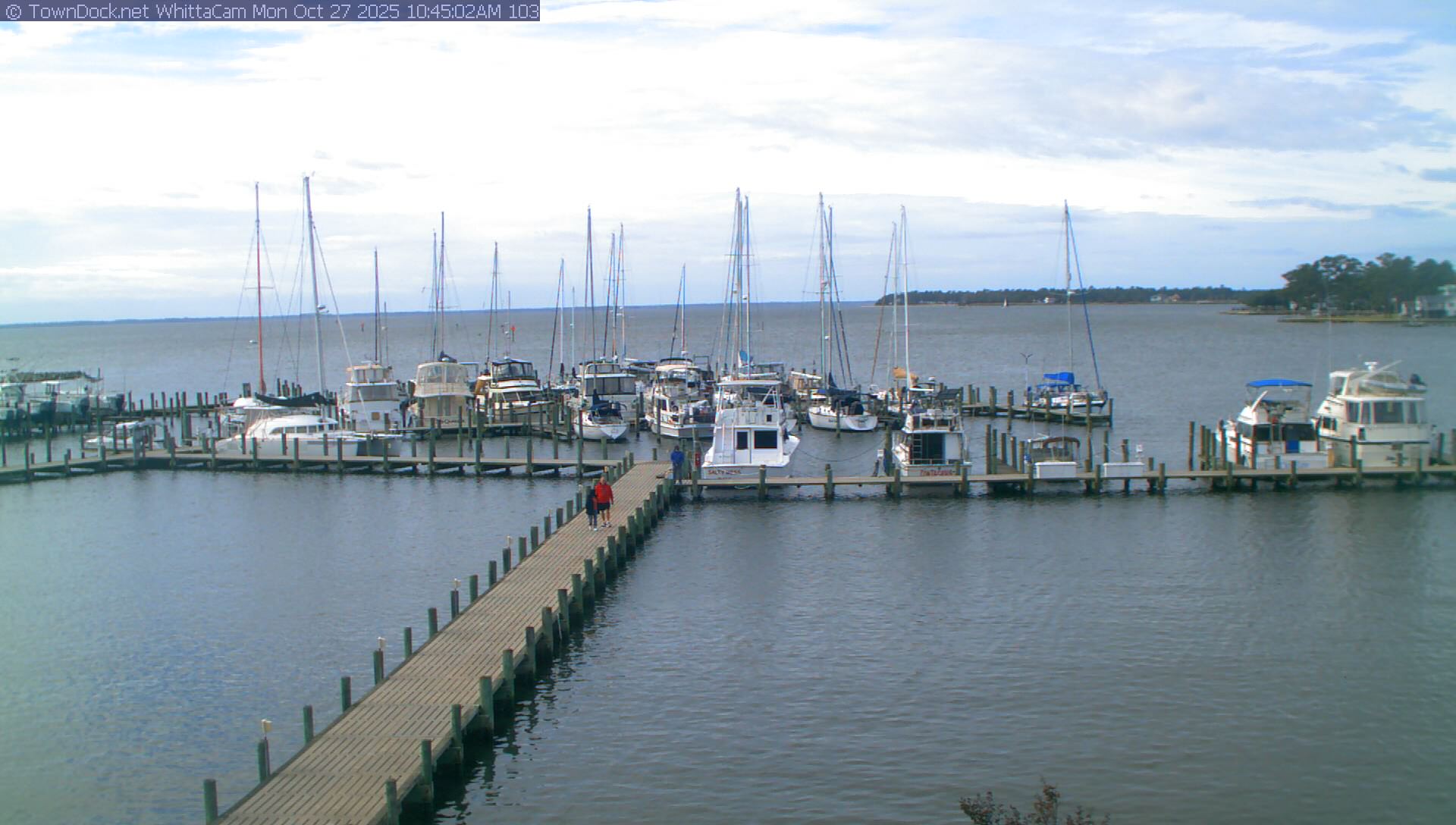 shows Whittaker Pointe Marina and the Whittaker Creek Channel entrance, with the Neuse River in the background. WhittaCam takes a new picture every five minutes from dawn til just before dusk. Click on the image to see a larger version. Once you see that larger version, you can click (see arrow at right) to go back in time and see recent photos. Harbor Cam currently takes photos from 6:30am to 6:40pm.