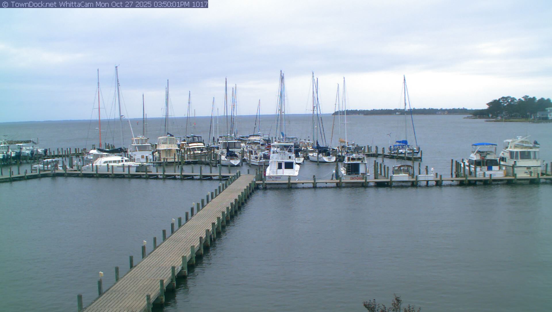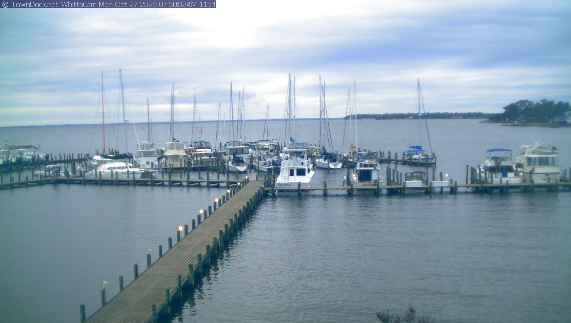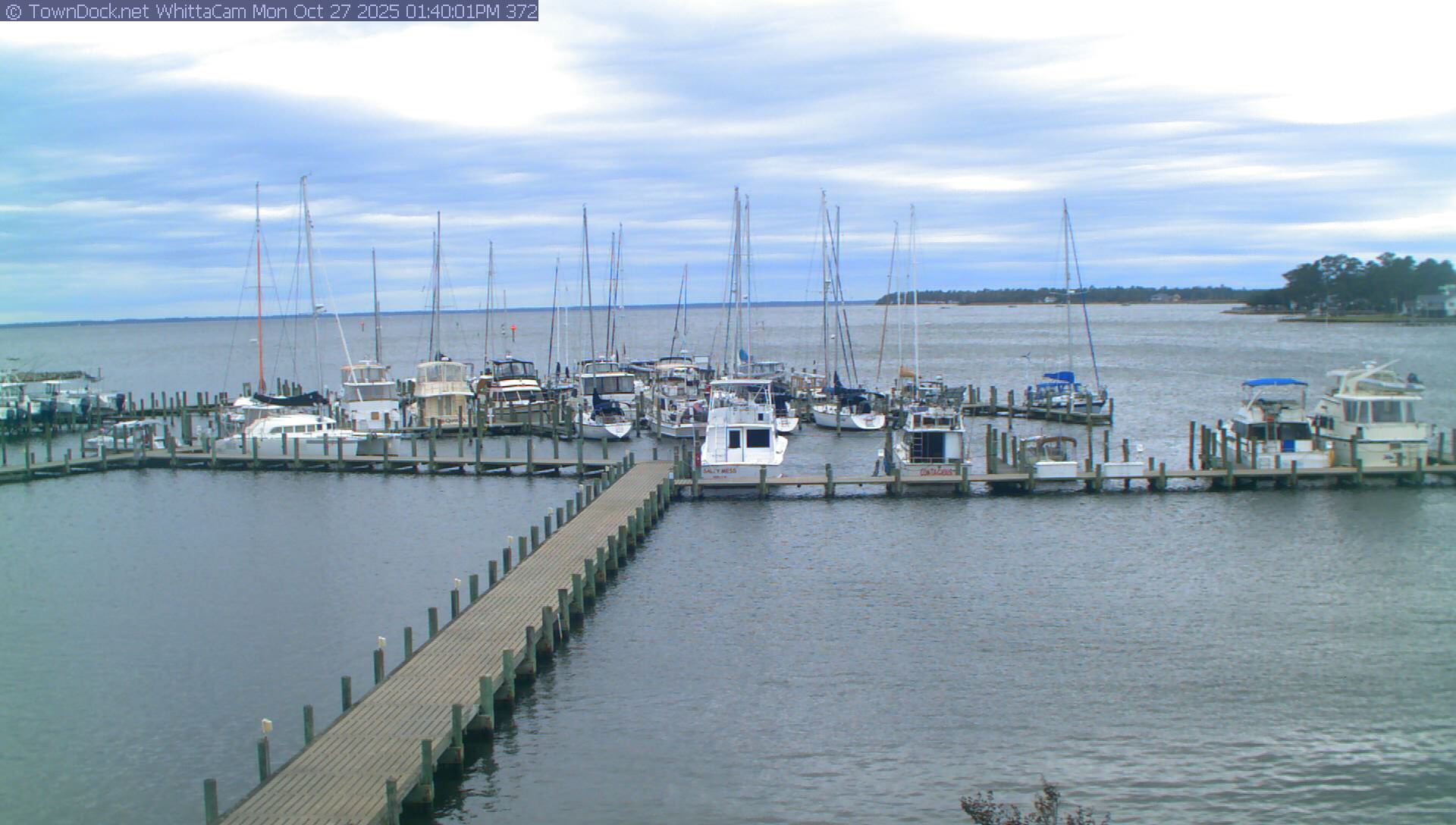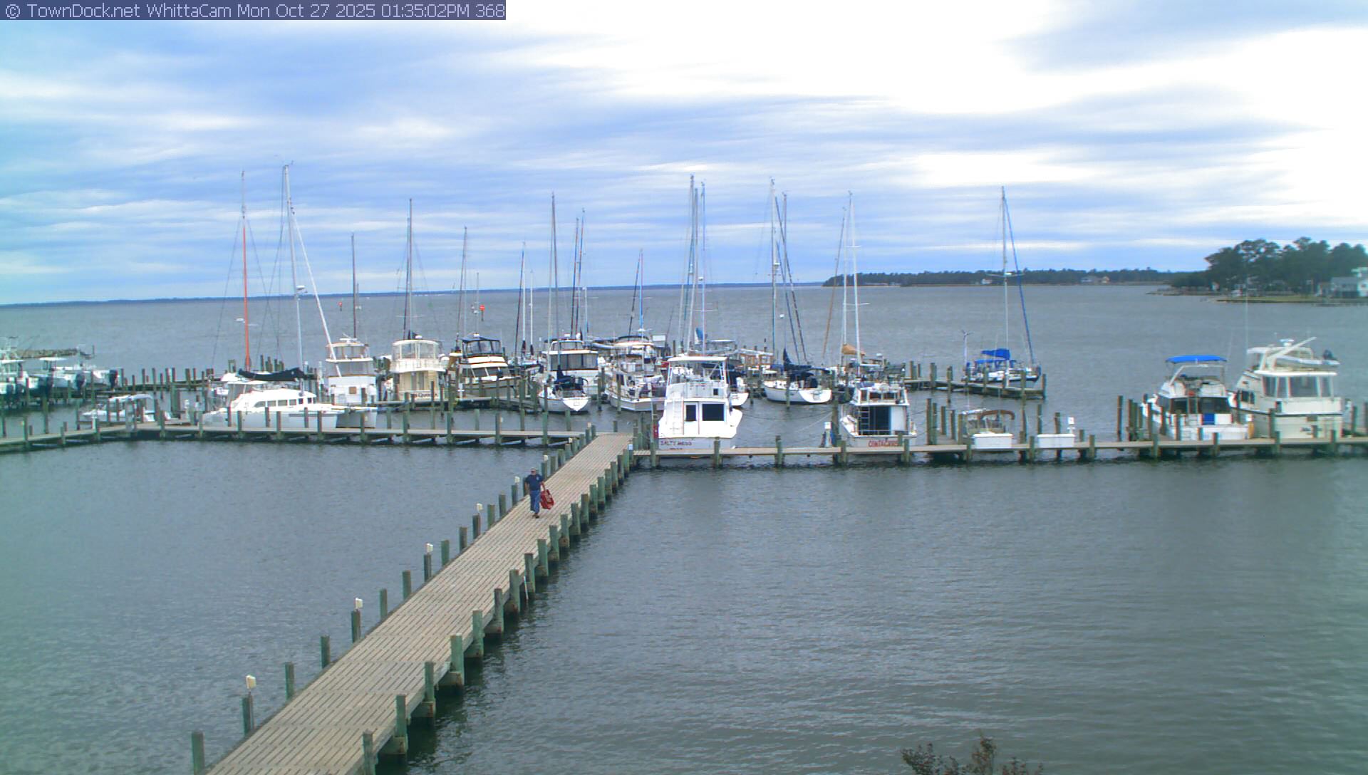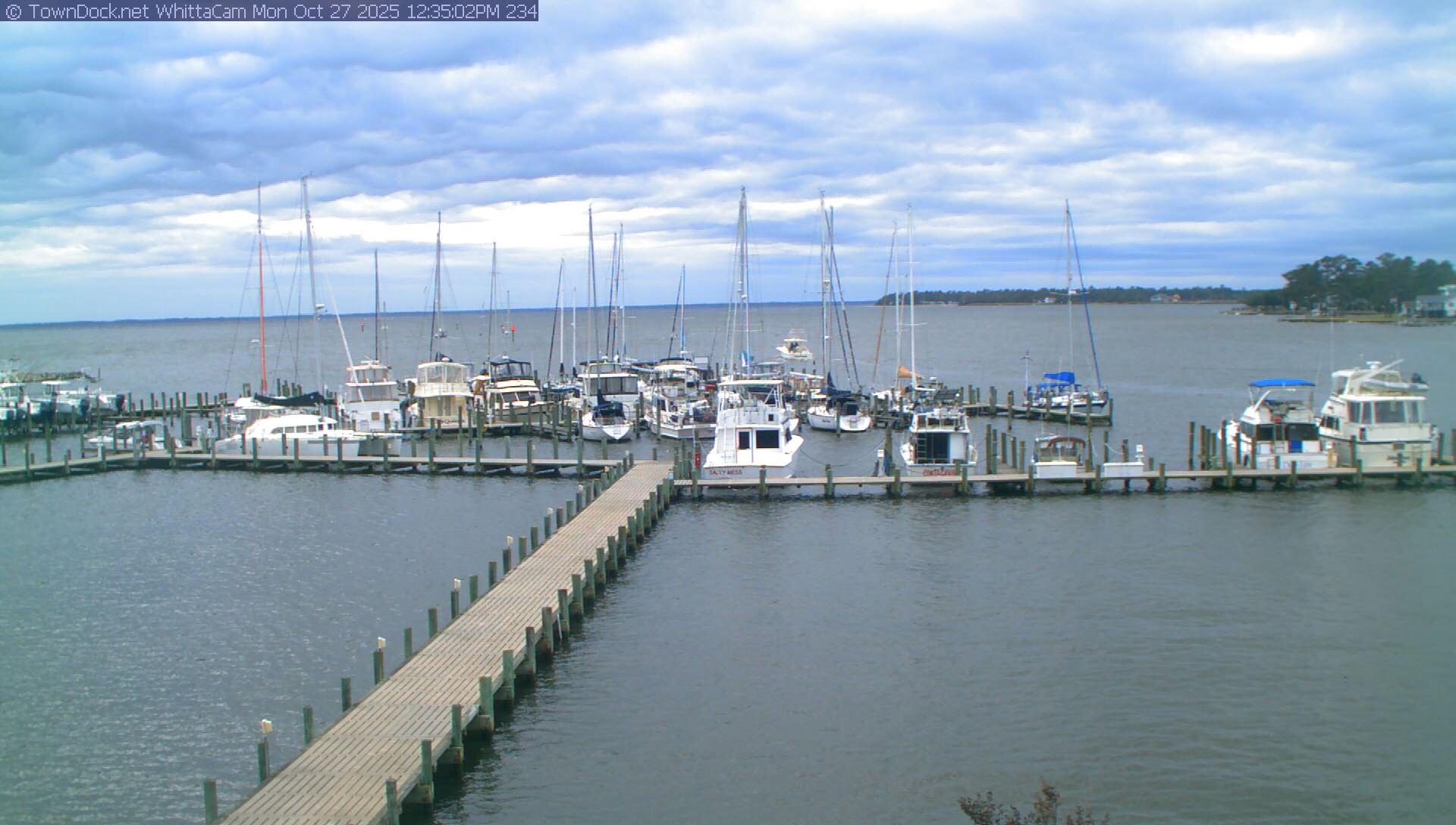 shows Whittaker Pointe Marina and the Whittaker Creek Channel entrance, with the Neuse River in the background. WhittaCam takes a new picture every five minutes from dawn til just before dusk. Click on the image to see a larger version. Once you see that larger version, you can click (see arrow at right) to go back in time and see recent photos. Harbor Cam currently takes photos from 6:30am to 6:40pm.