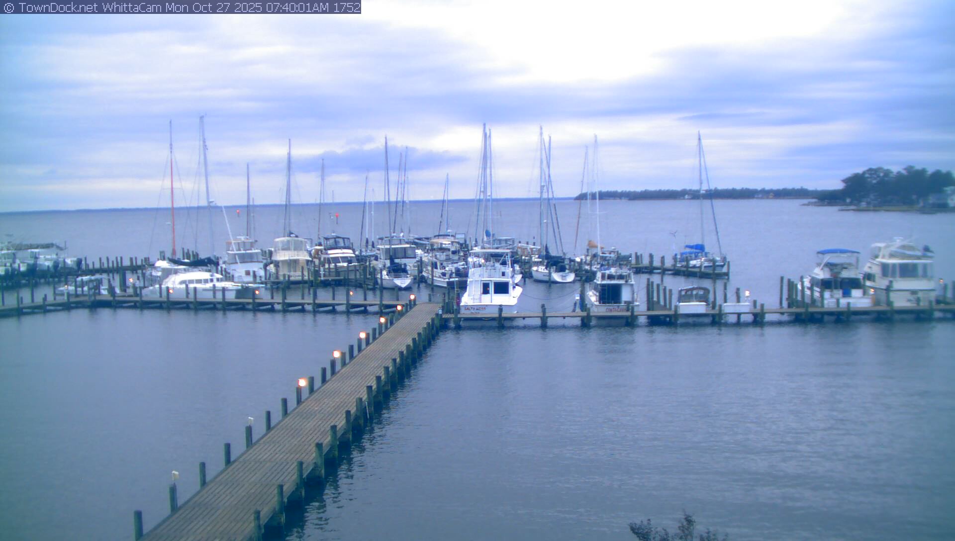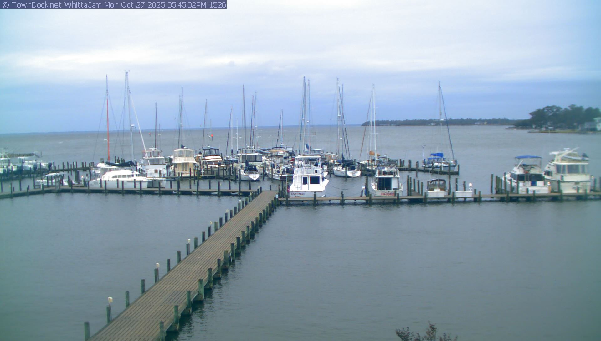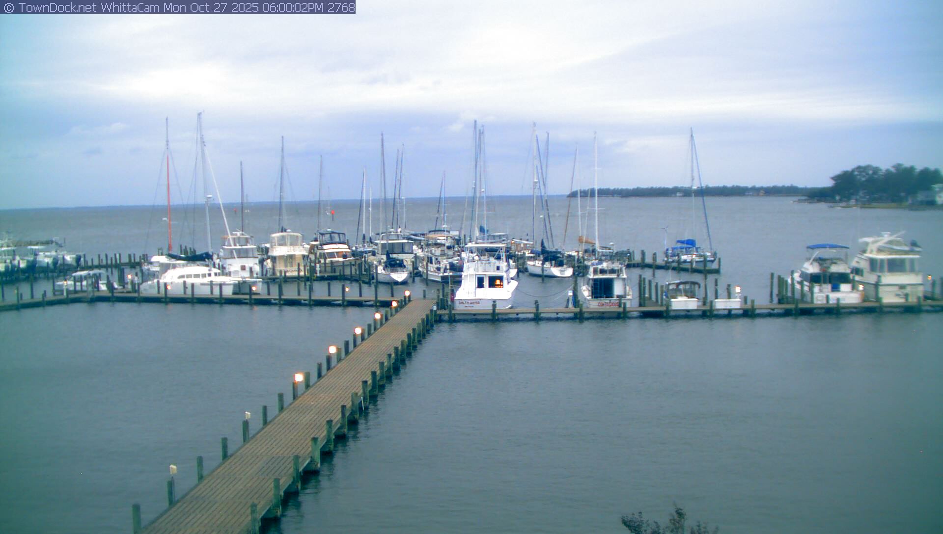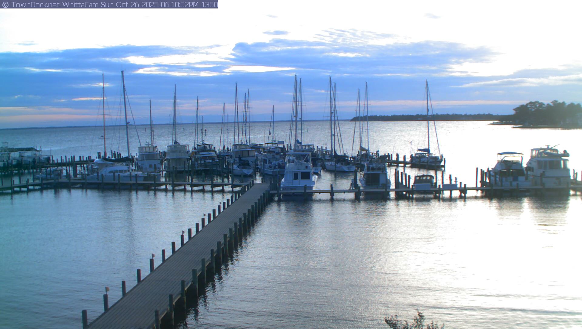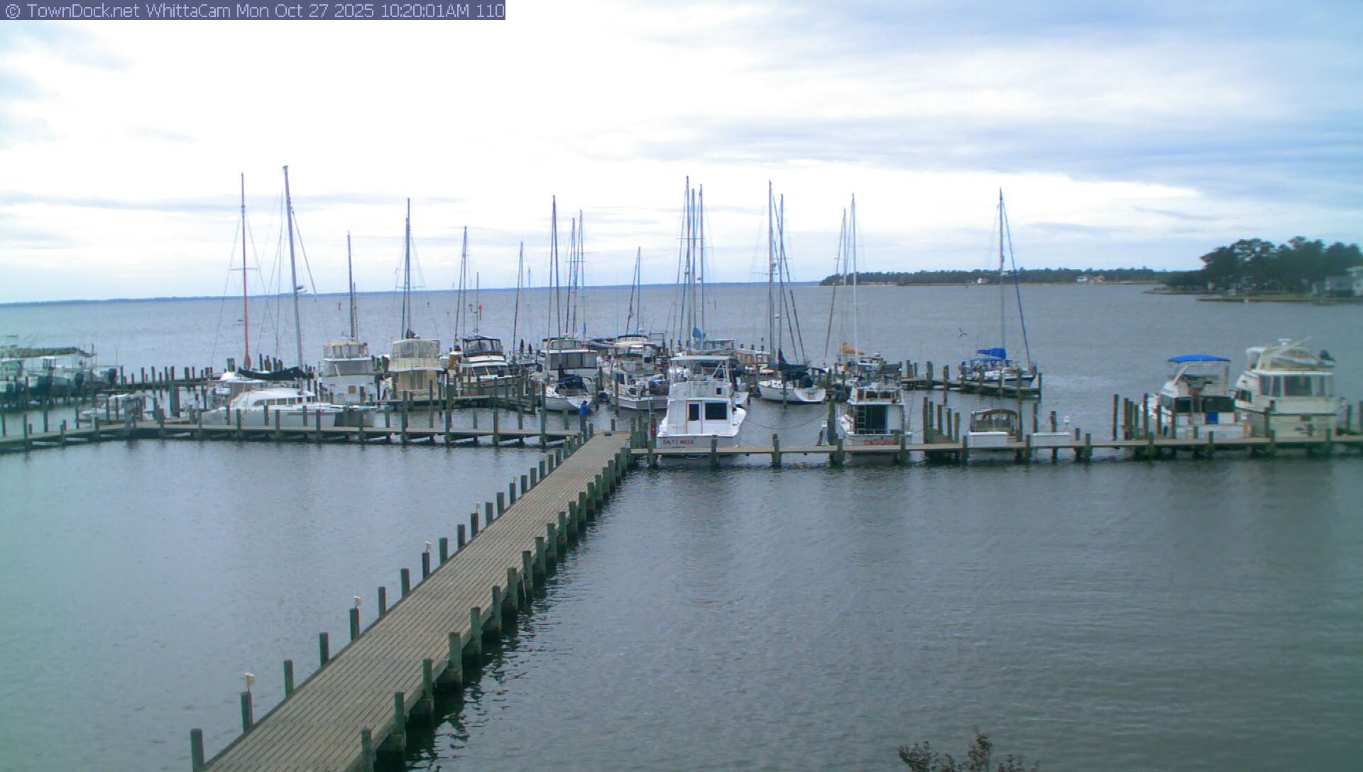 shows Whittaker Pointe Marina and the Whittaker Creek Channel entrance, with the Neuse River in the background. WhittaCam takes a new picture every five minutes from dawn til just before dusk. Click on the image to see a larger version. Once you see that larger version, you can click (see arrow at right) to go back in time and see recent photos. Harbor Cam currently takes photos from 6:30am to 6:40pm.