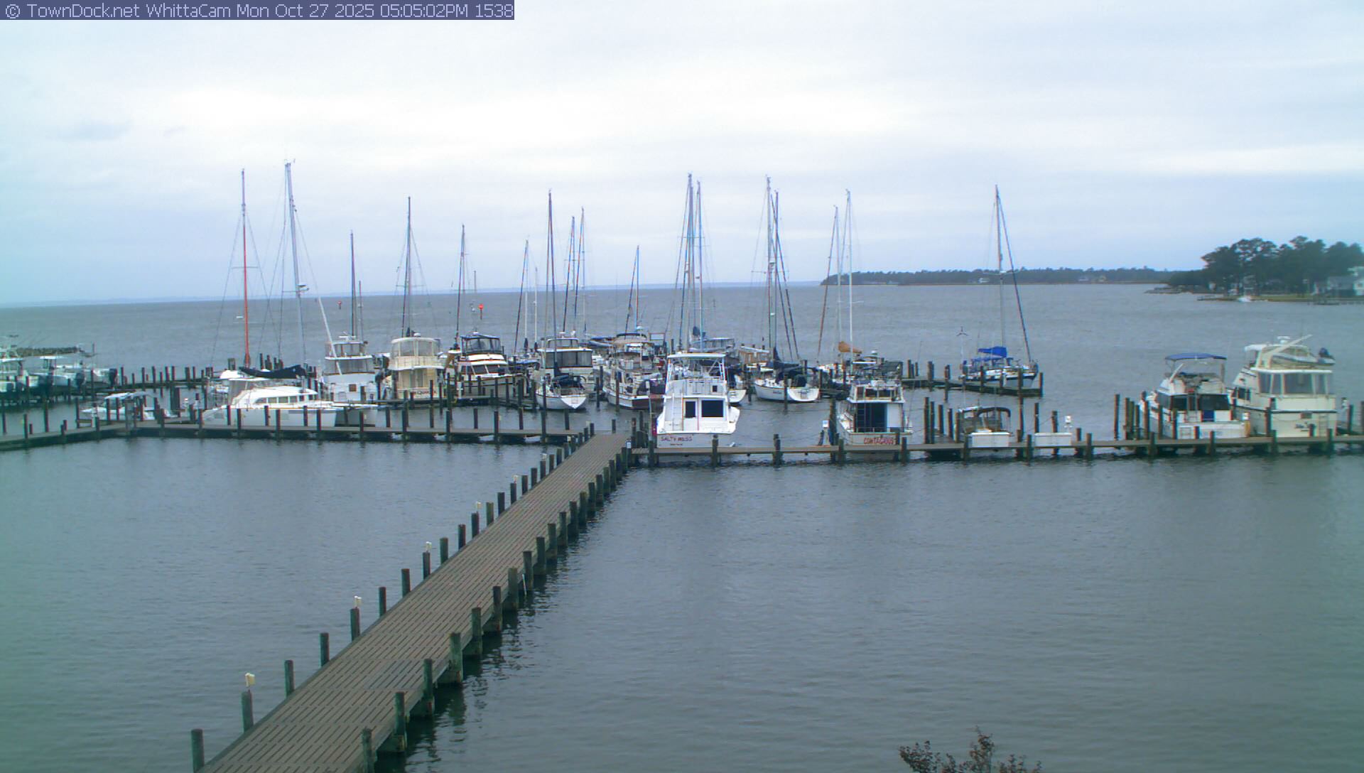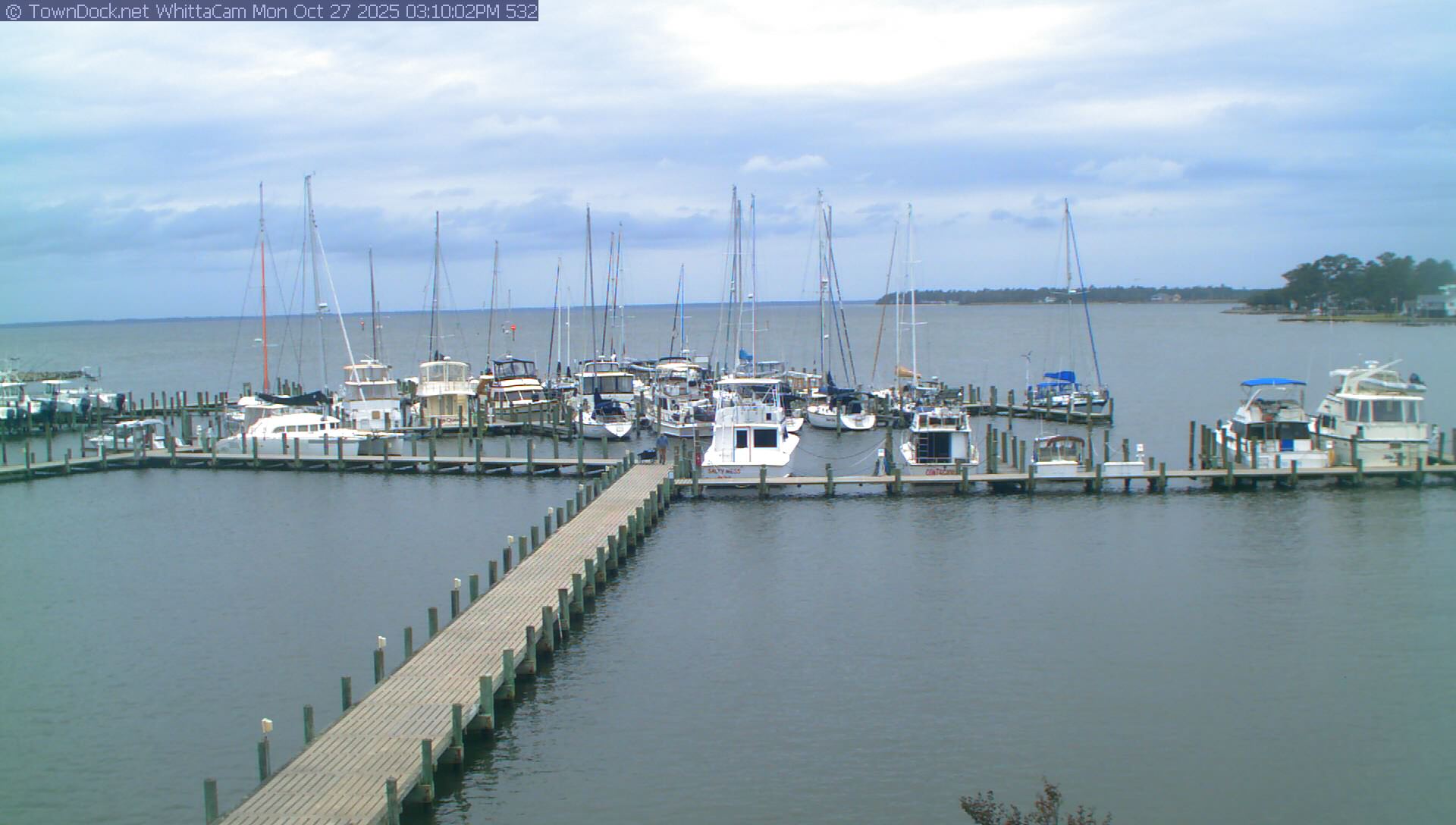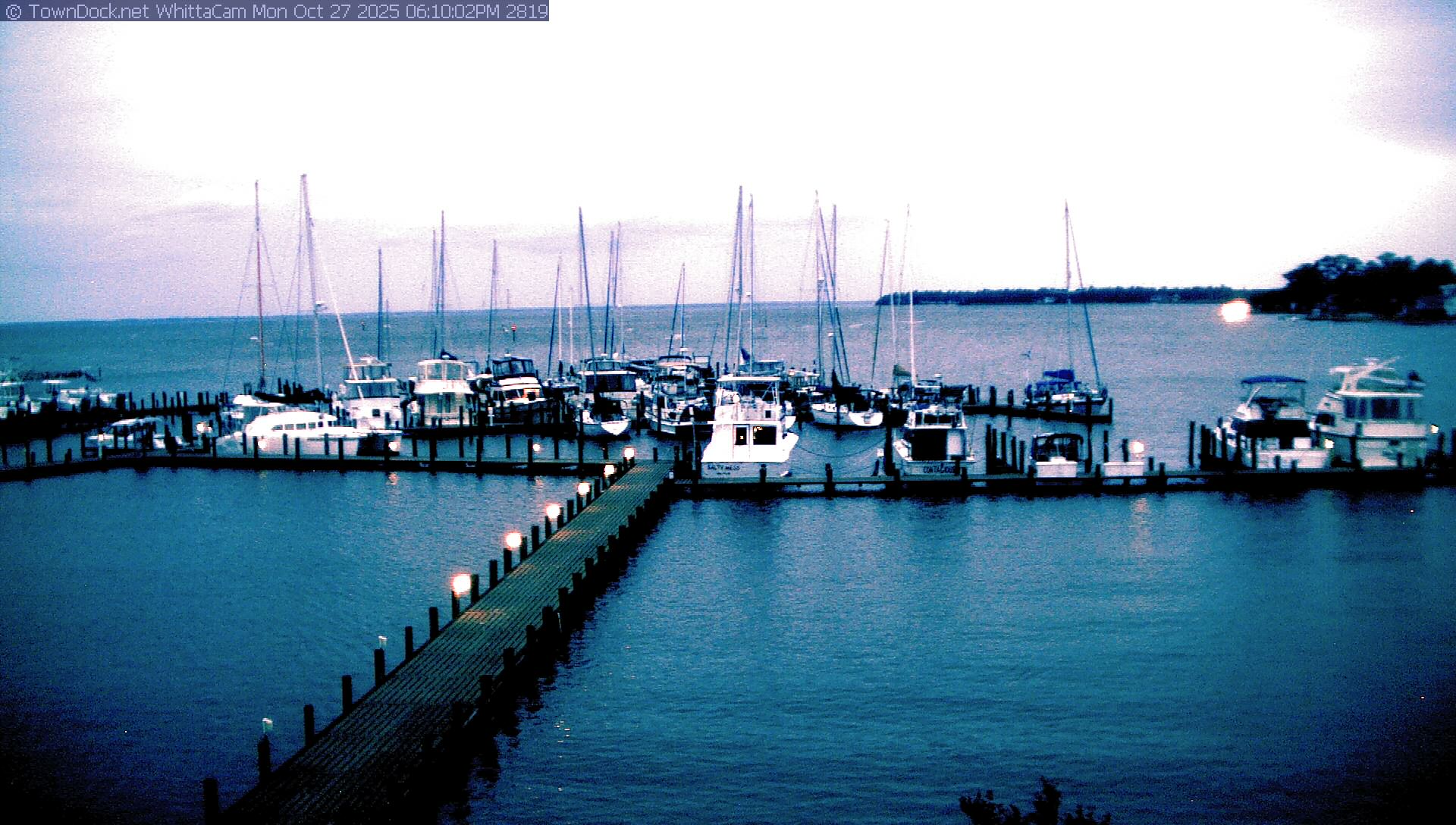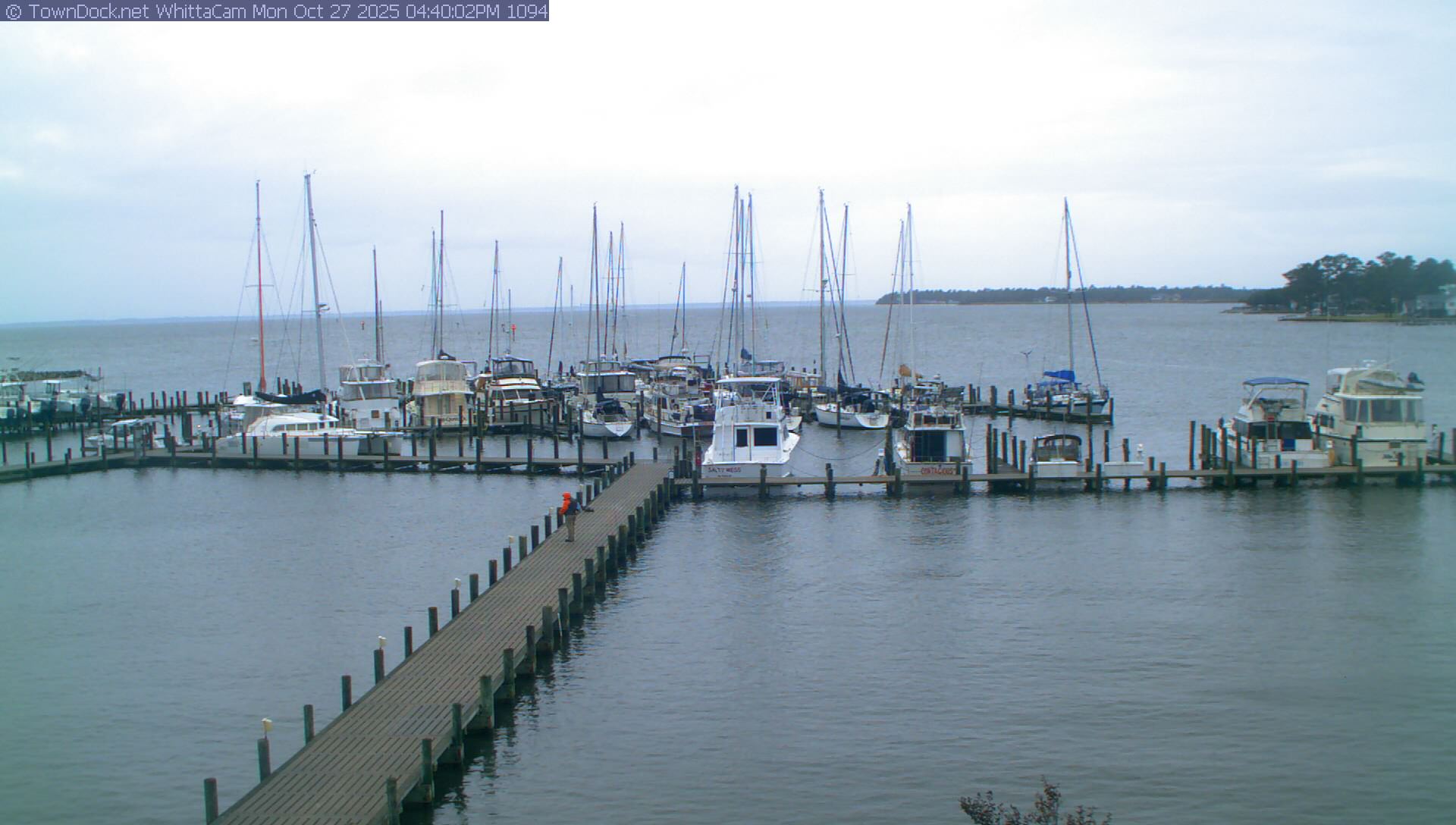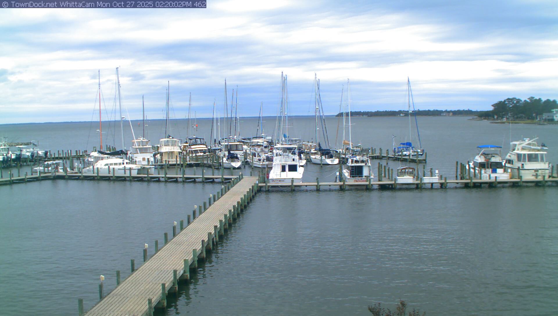 shows Whittaker Pointe Marina and the Whittaker Creek Channel entrance, with the Neuse River in the background. WhittaCam takes a new picture every five minutes from dawn til just before dusk. Click on the image to see a larger version. Once you see that larger version, you can click (see arrow at right) to go back in time and see recent photos. Harbor Cam currently takes photos from 6:30am to 6:40pm.