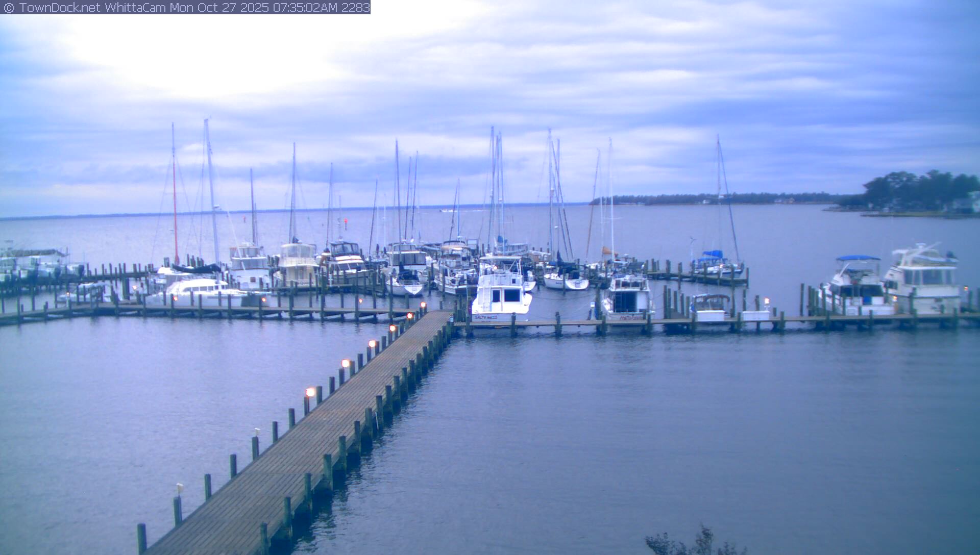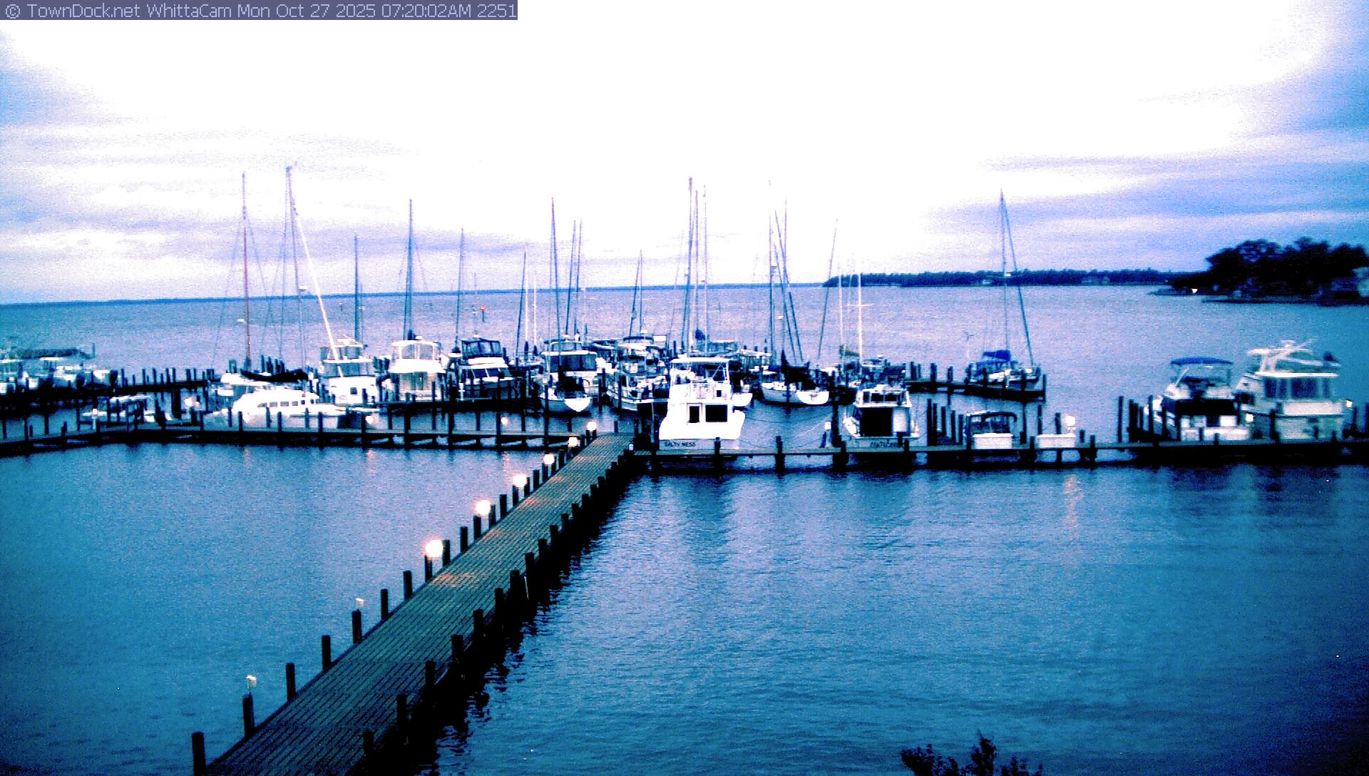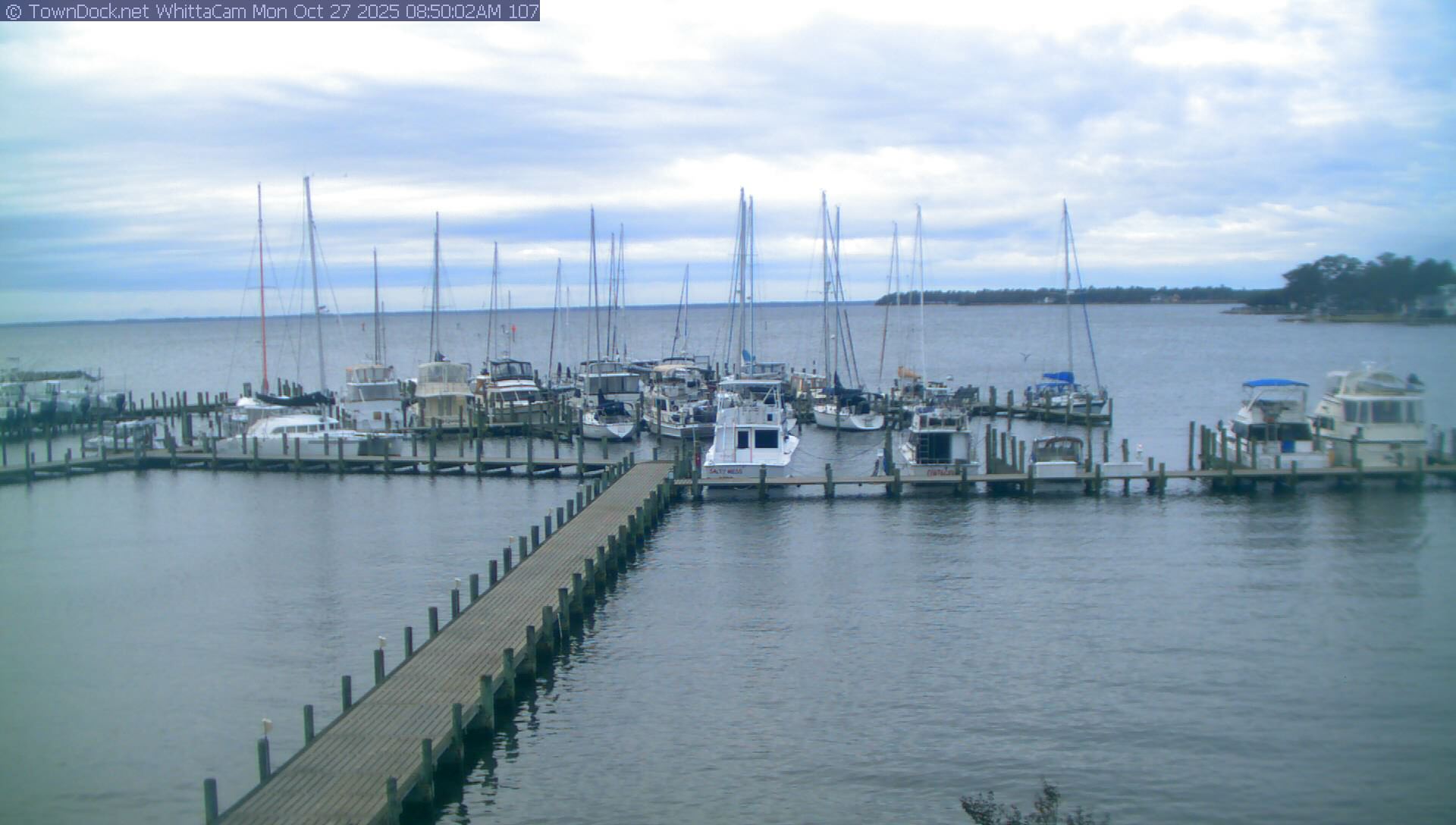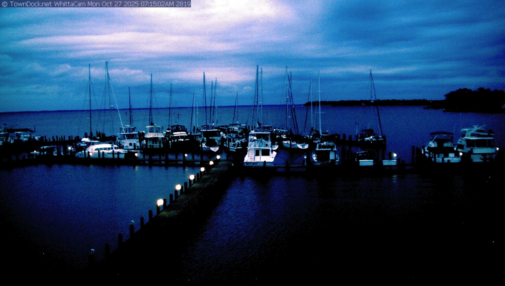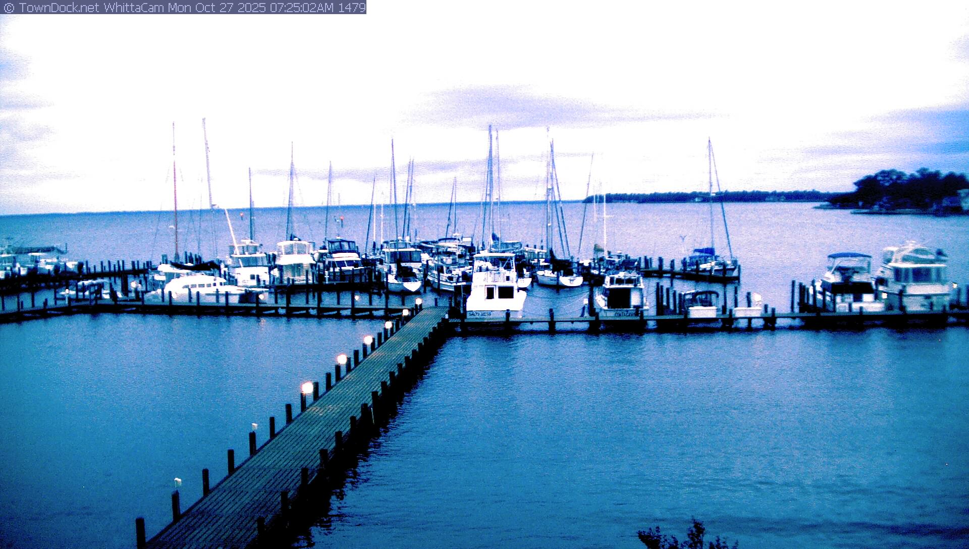 shows Whittaker Pointe Marina and the Whittaker Creek Channel entrance, with the Neuse River in the background. WhittaCam takes a new picture every five minutes from dawn til just before dusk. Click on the image to see a larger version. Once you see that larger version, you can click (see arrow at right) to go back in time and see recent photos. Harbor Cam currently takes photos from 6:30am to 6:40pm.