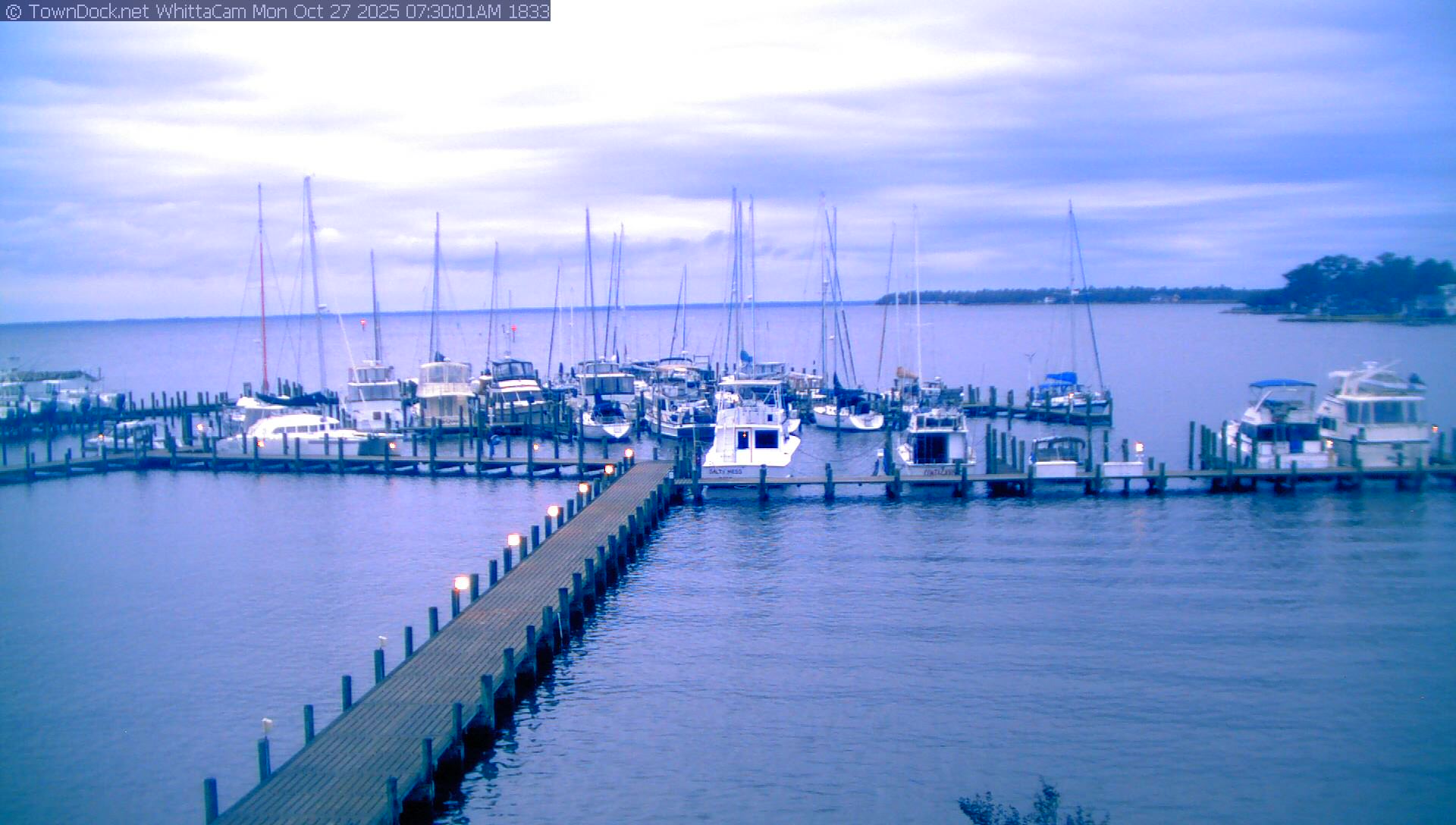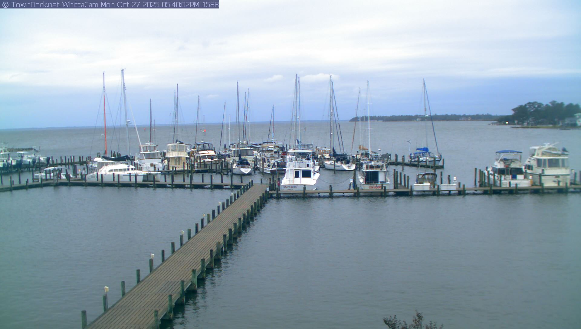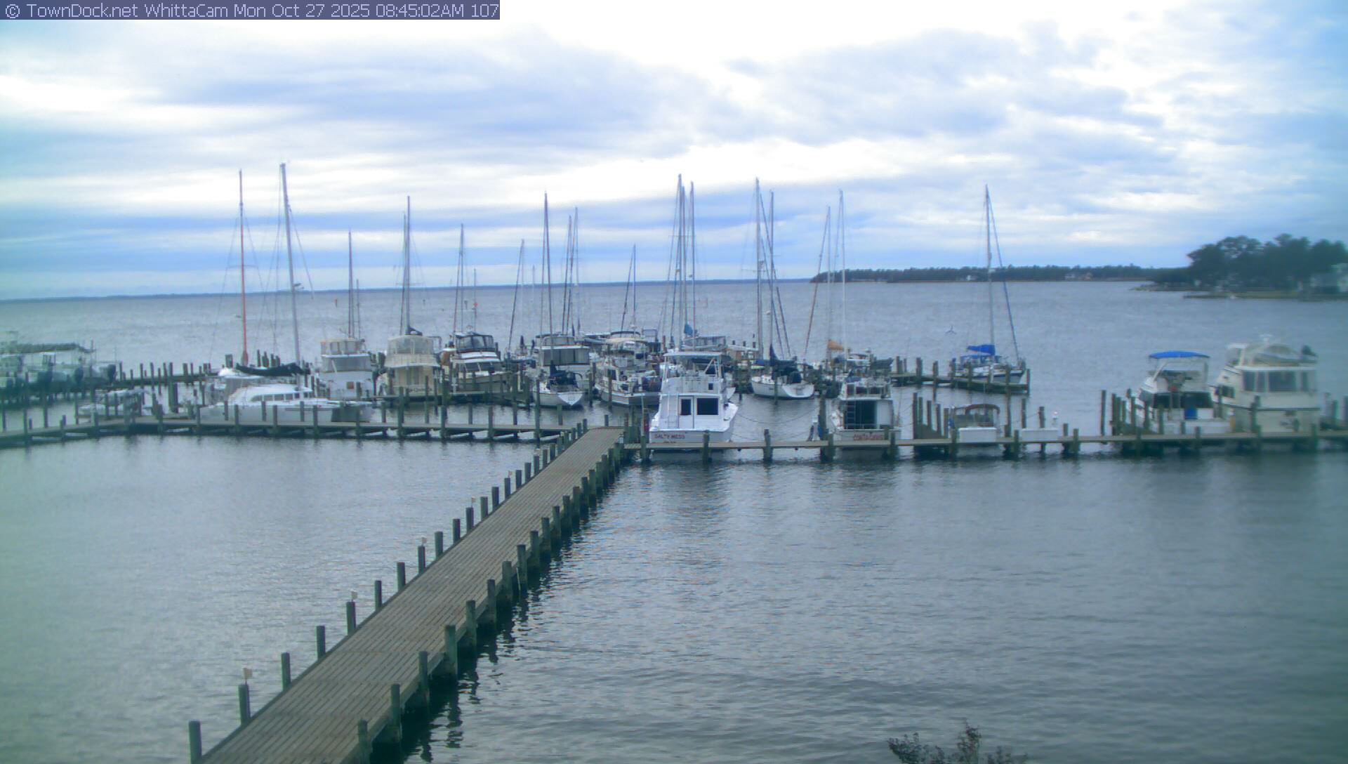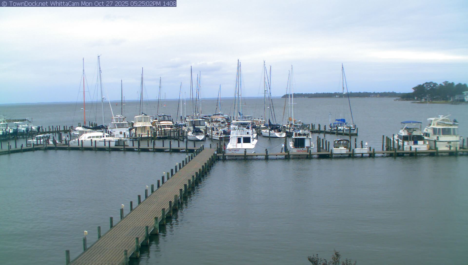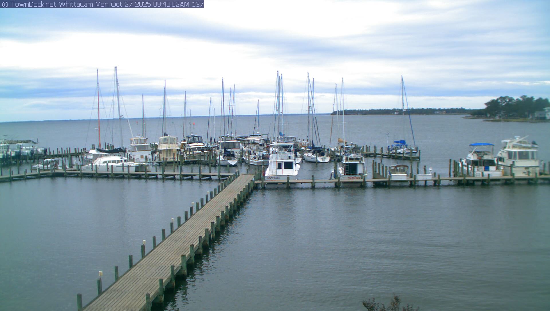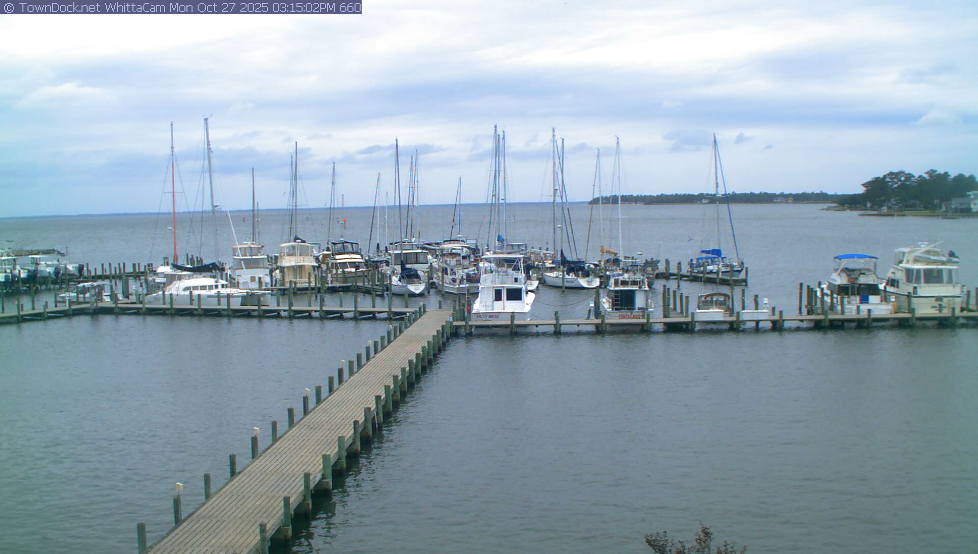 shows Whittaker Pointe Marina and the Whittaker Creek Channel entrance, with the Neuse River in the background. WhittaCam takes a new picture every five minutes from dawn til just before dusk. Click on the image to see a larger version. Once you see that larger version, you can click (see arrow at right) to go back in time and see recent photos. Harbor Cam currently takes photos from 6:30am to 6:40pm.