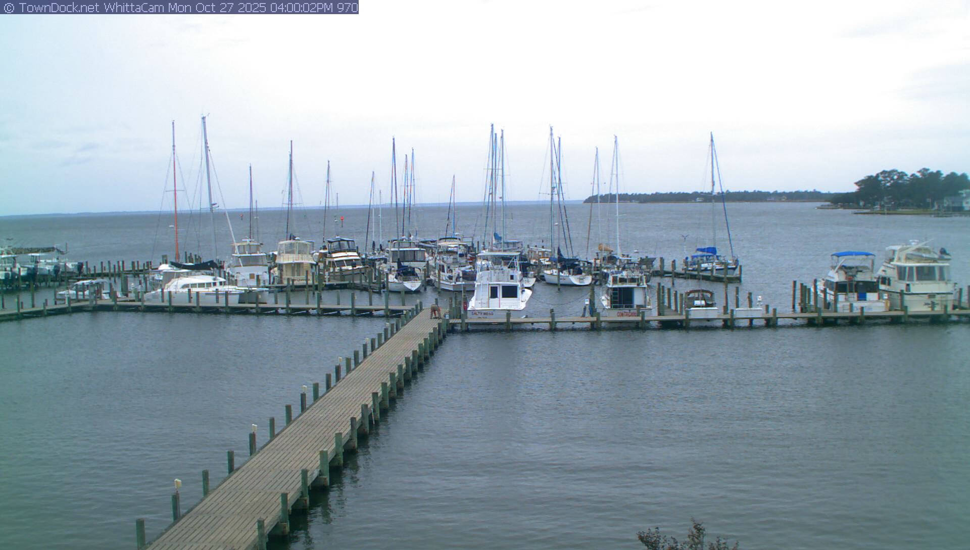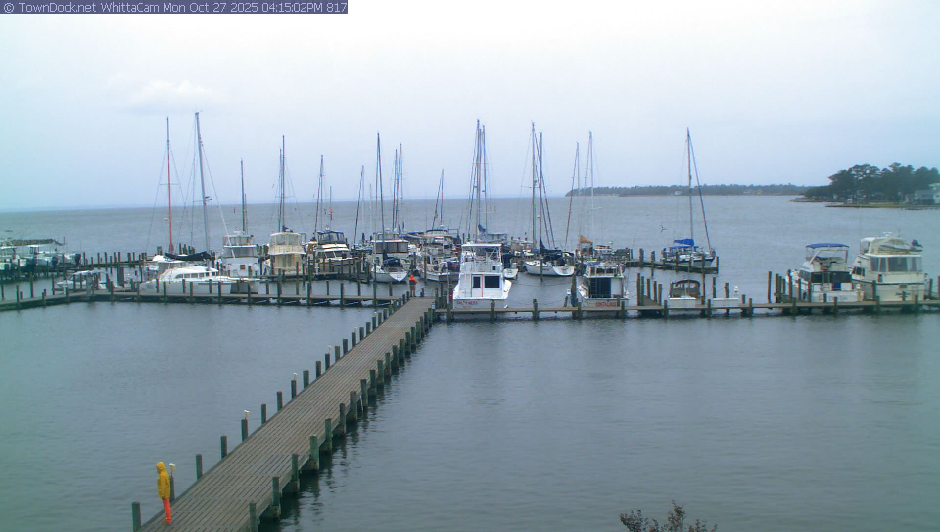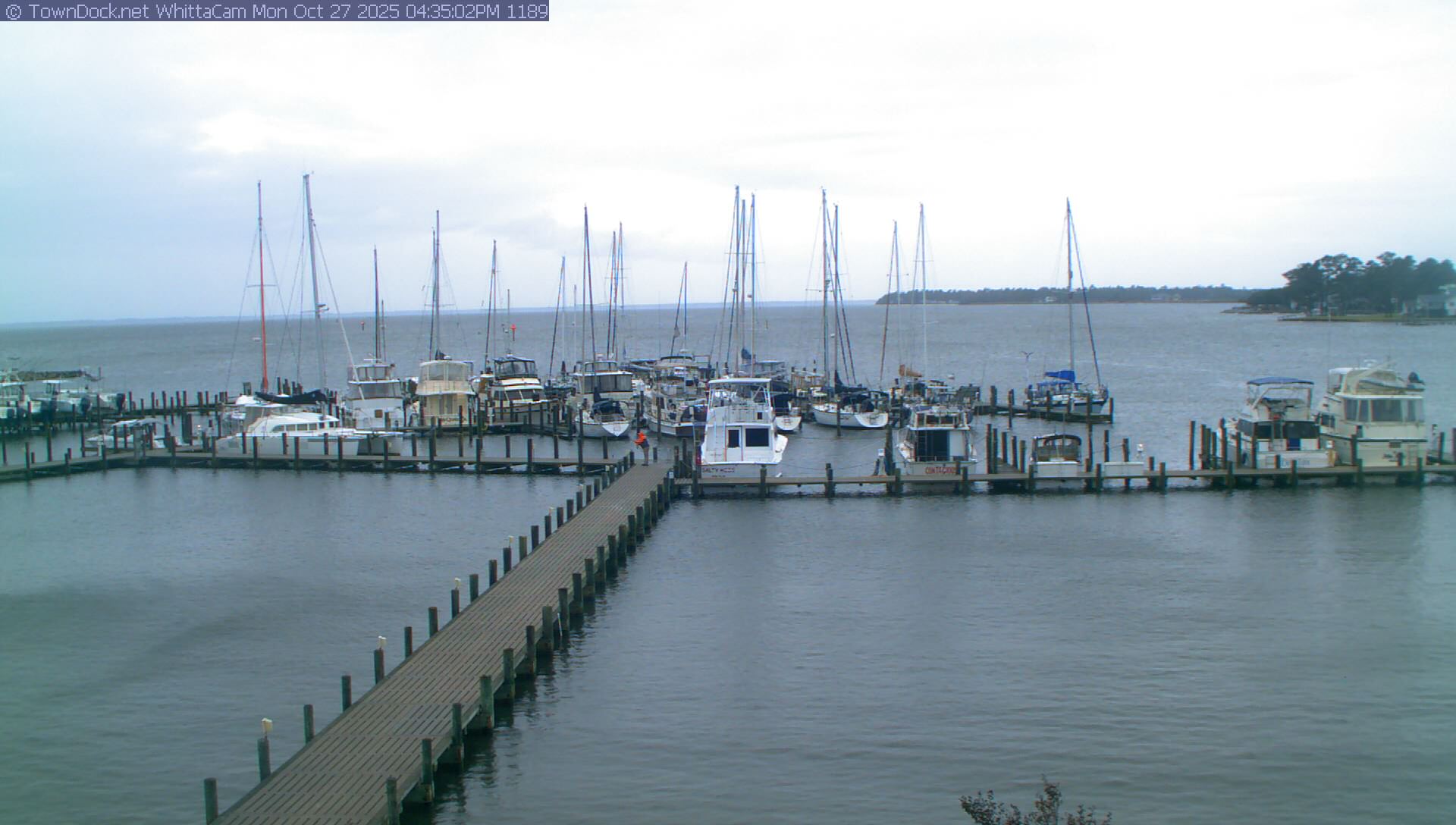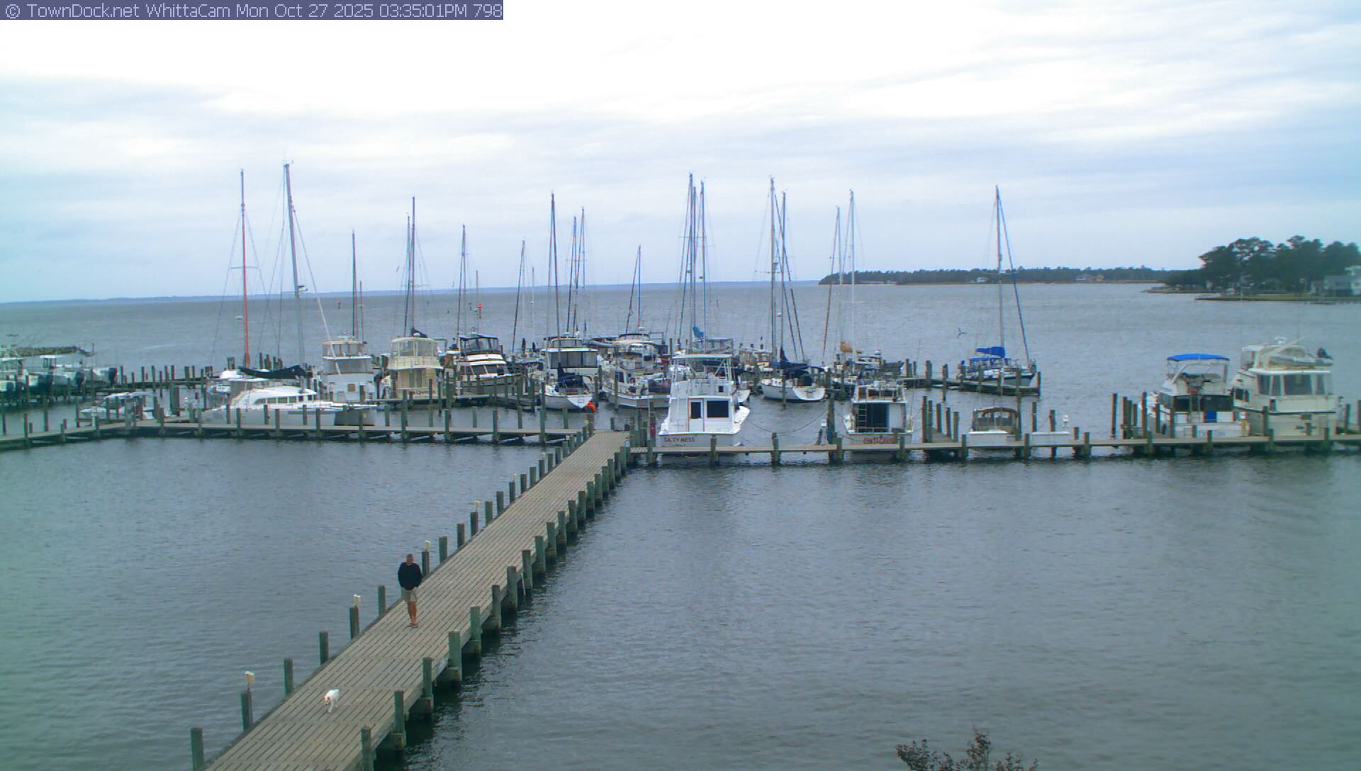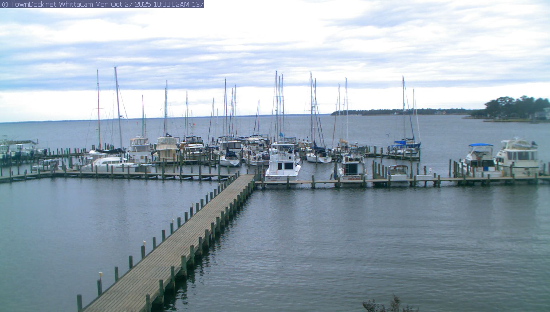 shows Whittaker Pointe Marina and the Whittaker Creek Channel entrance, with the Neuse River in the background. WhittaCam takes a new picture every five minutes from dawn til just before dusk. Click on the image to see a larger version. Once you see that larger version, you can click (see arrow at right) to go back in time and see recent photos. Harbor Cam currently takes photos from 6:30am to 6:40pm.