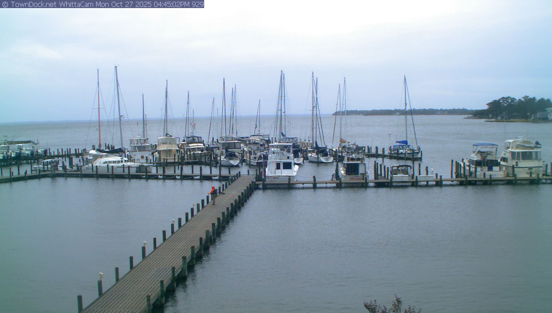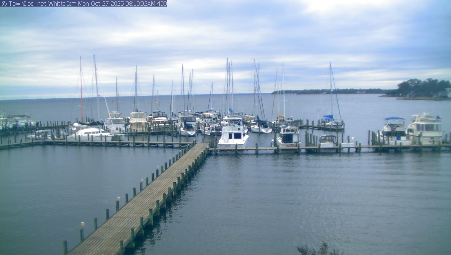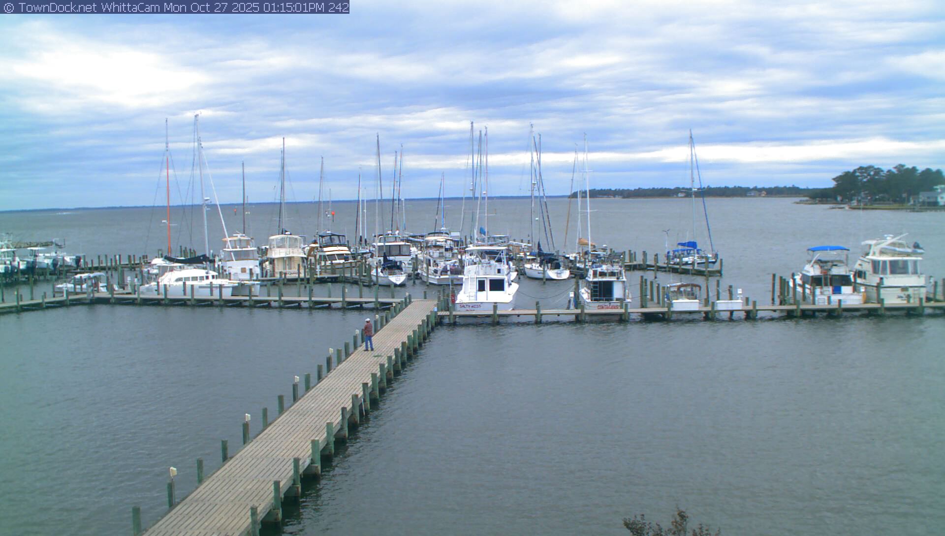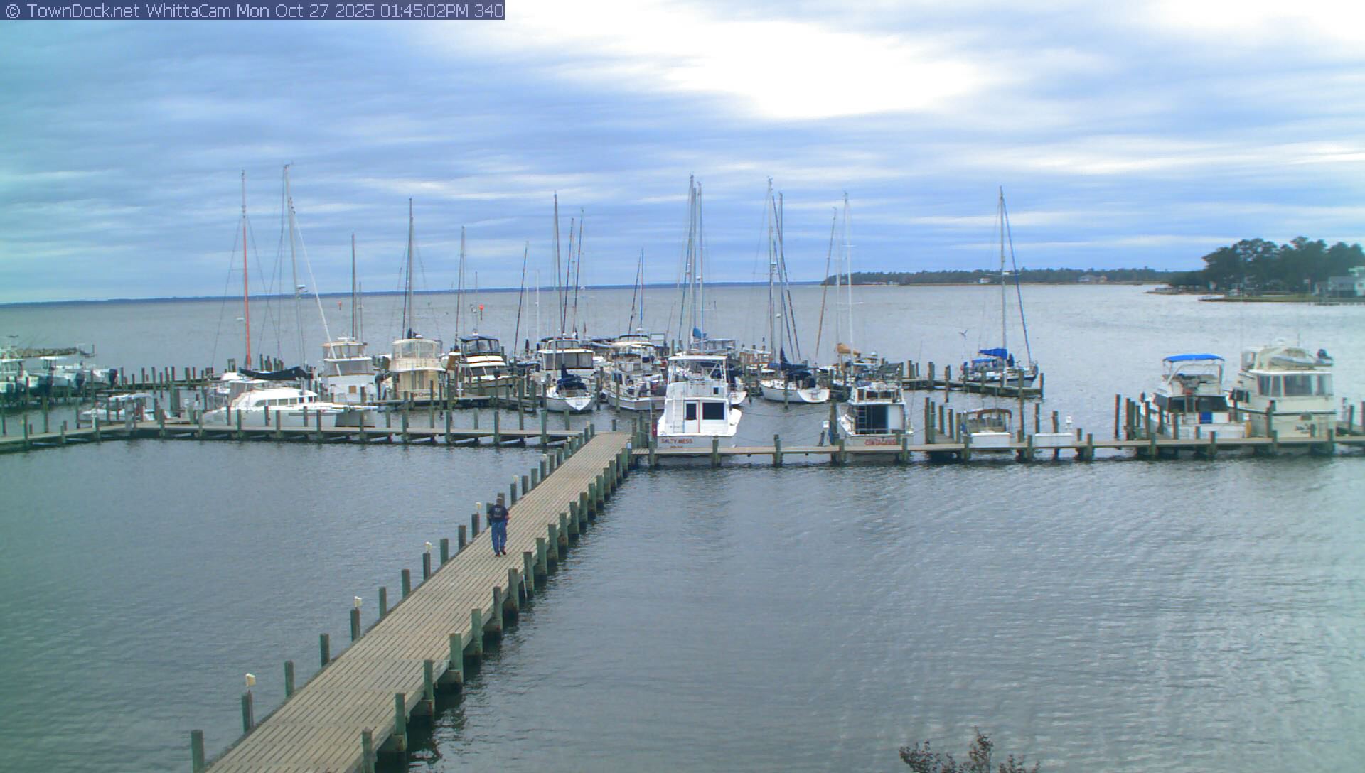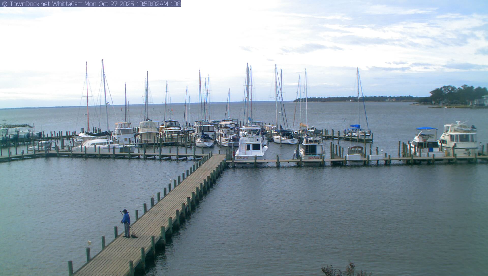 shows Whittaker Pointe Marina and the Whittaker Creek Channel entrance, with the Neuse River in the background. WhittaCam takes a new picture every five minutes from dawn til just before dusk. Click on the image to see a larger version. Once you see that larger version, you can click (see arrow at right) to go back in time and see recent photos. Harbor Cam currently takes photos from 6:30am to 6:40pm.